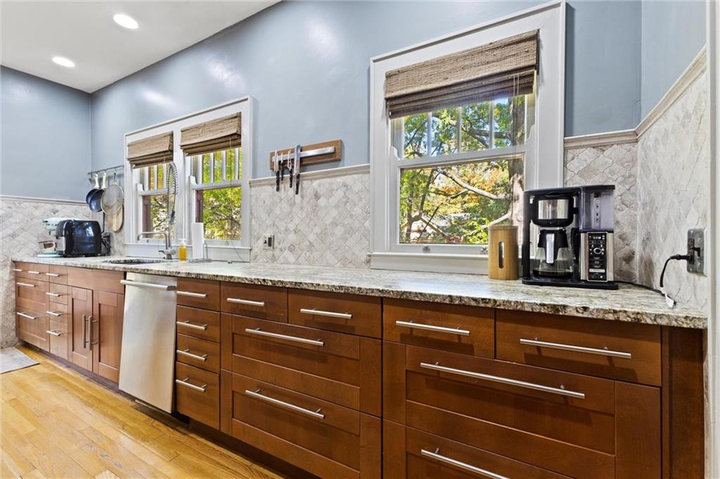 Charming KC Arts & Crafts home near the lively 39th Street Corridor! This stately residence features brand new exterior concrete steps, a replaced main sewer line, and a freshly painted exterior, combining curb appeal with peace of mind. Inside, classic details meet modern updates: leaded glass, beamed ceilings in the formal dining room, hardwood floors, and gorgeous wood trim throughout. The custom cherry kitchen boasts granite counters, stainless appliances, and designer tile. The spacious primary suite occupies over half the upstairs, complete with dual vanities, separate shower, whirlpool tub, ample closet space, and convenient laundry. Two additional bedrooms and a full bath are on the main level. The unfinished basement offers endless possibilities: wine cellar, art studio, workshop or just extra storage. Enjoy outdoor living with a wrap-around porch, multiple decks, shaded flagstone patio, and privacy-fenced yard. Heated tandem garage fits up to three vehicles. With its mix of historic charm and thoughtful updates, this home is the perfect canvas for your Midtown moments: walking distance to KU Med, shops, dining, and entertainment!