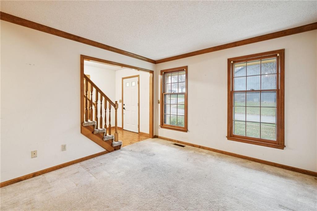 Bring your design inspiration to this two story home with great potential in popular Lenexa location, walking distance to grade school, city park, and shopping! HOME IS ON A WALK OUT LOT BACKING TO GREENSPACE! Exterior has been recently painted, plus newer roof, HVAC, and hot water heater. All of the big items are taken care of! Finish the basement and add even more living space. If you work from home, you'll love the office on main floor, plus a formal dining room that could provide a second office! Beautiful bay windows, wet bar in Great room, laundry on bedroom level. Enjoy sunrise with your moring coffee on the deck, and afternoon shade for your dinner grilling, overlooking a spacious back yard! HOME IS BEING SOLD AS IS.