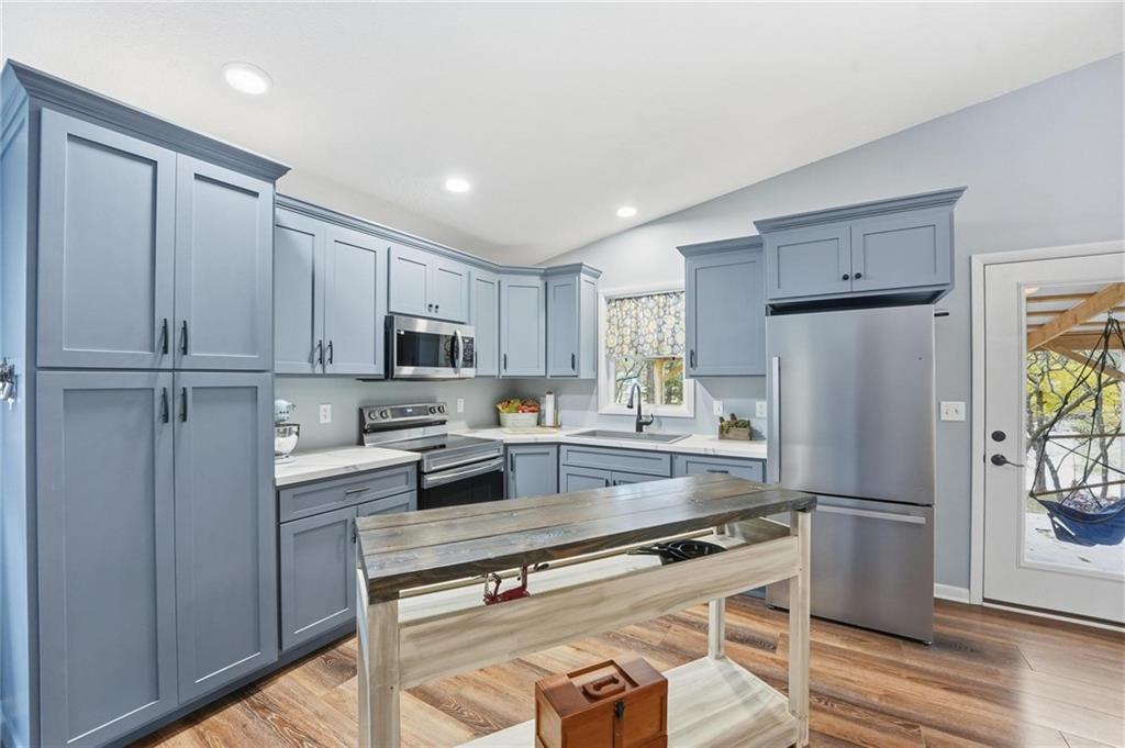 Price Improvement! Discover quiet lakefront living in this beautifully finished 2023-built home at Sugar Lake — a private, wooded lake community just an hour south of Kansas City. With an all-metal exterior and low-maintenance design, this home offers modern comfort with lasting peace of mind. A whole-home generator provides year-round reliability. Inside, the open layout features vaulted ceilings, updated flooring, a bright kitchen with custom cabinetry, and a warm living area with views of the trees and water. Double glass doors open to the covered patio — the perfect place to relax, enjoy morning coffee, or unwind in the evenings overlooking the lake. The home includes two comfortable bedrooms, a nicely updated bath, efficient mini-split systems, and three exterior storage sheds that stay with the property — ideal for tools, lake gear, lawn equipment, or weekend toys. Whether you're seeking full-time living or a quiet weekend retreat, this home is set up for simple, effortless enjoyment. Sugar Lake is known for calm water, great fishing, kayaking, abundant wildlife, and a peaceful year-round atmosphere within a private lake community. A rare move-in-ready lakefront home with modern updates and a beautiful setting — come take a look.
