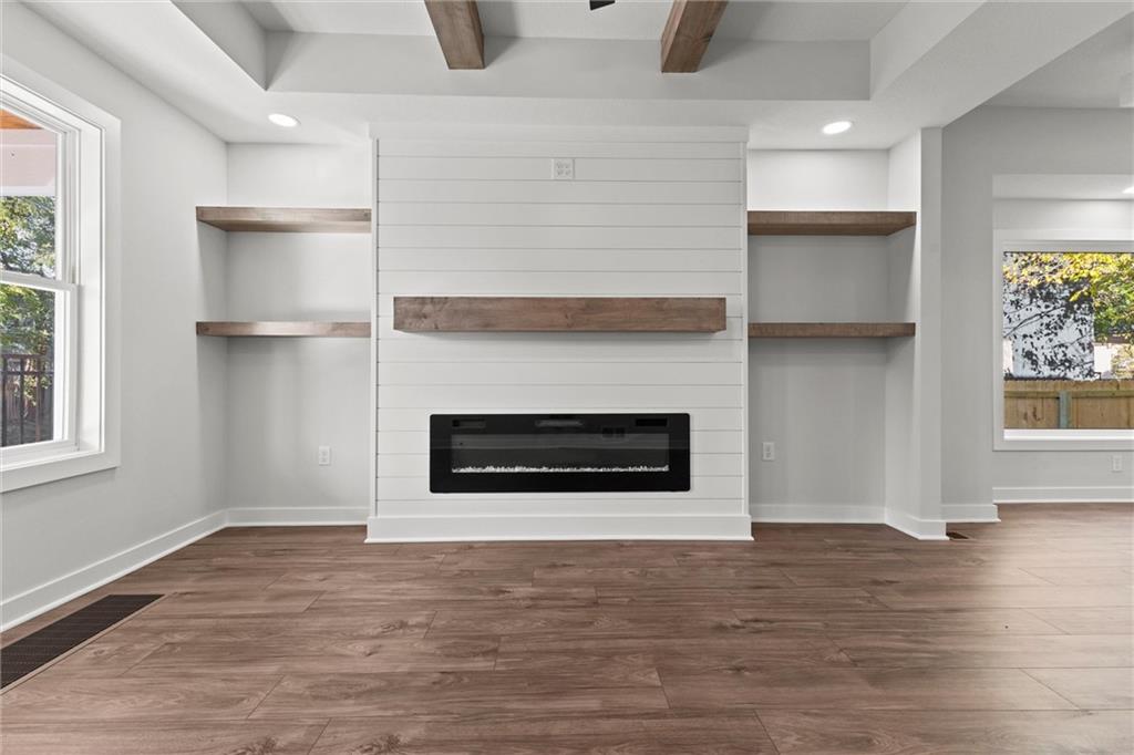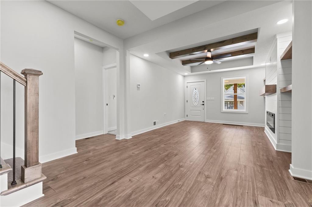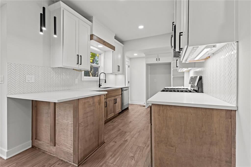 This stunning Kansas City, Kansas home has been completely remodeled from top to bottom — everything is new! Featuring a brand-new roof (6 months old), new gutters (1 month old), new siding, windows, electrical, and plumbing, no detail was overlooked. Step inside to an open and inviting layout with vaulted ceilings, beautiful LVL flooring, and custom craftsmanship throughout. The brand-new kitchen showcases custom cabinets, quartz countertops, a stylish tile backsplash, and all-new stainless steel appliances including a gas stove, dishwasher, and microwave. The bathroom has been fully updated with a sleek tiled shower and designer finishes. The living room features pine ceiling beams, floating maple shelves, a maple fireplace mantel, and shiplap accents that add warmth and character. Enjoy the outdoors with a new covered front porch featuring a metal roof, pine car siding trim on ceiling, and cedar support beams, plus an epoxy-coated front patio with new metal handrails. Upstairs has a spacious bedroom with walk-in closet. The new deck and 6-foot wood privacy fence make the backyard perfect for relaxing or entertaining. Additional upgrades include new sheetrock and insulation throughout, new carpet in the bedrooms, new maple stair handrails with iron spindles, new concrete flooring in the basement, and a new water heater. Located in Kansas City, Kansas, just minutes from Central Ave’s popular restaurants, highway access, and a short drive to downtown Kansas City — this home offers the perfect blend of modern comfort and convenience.