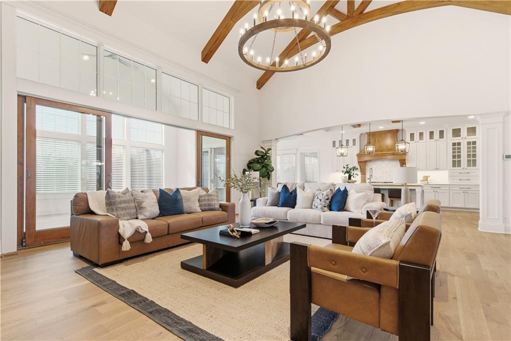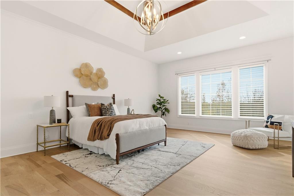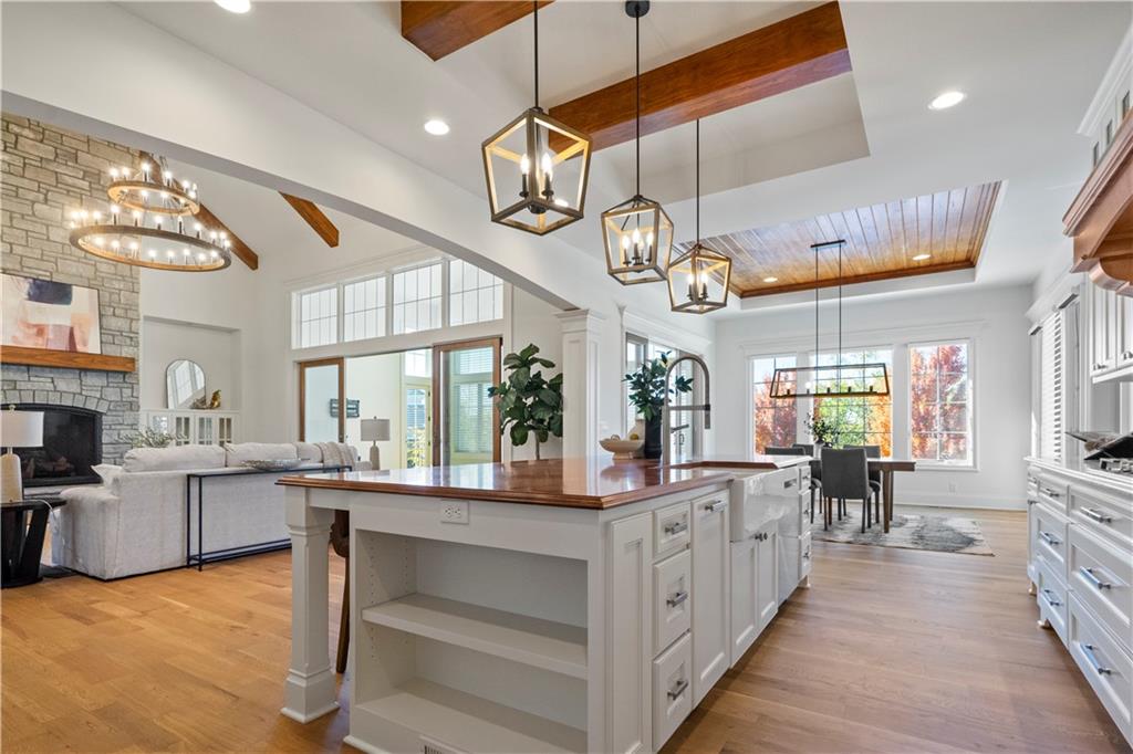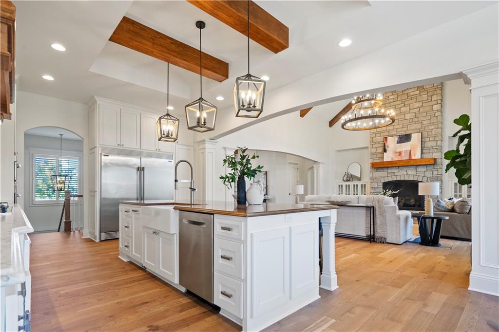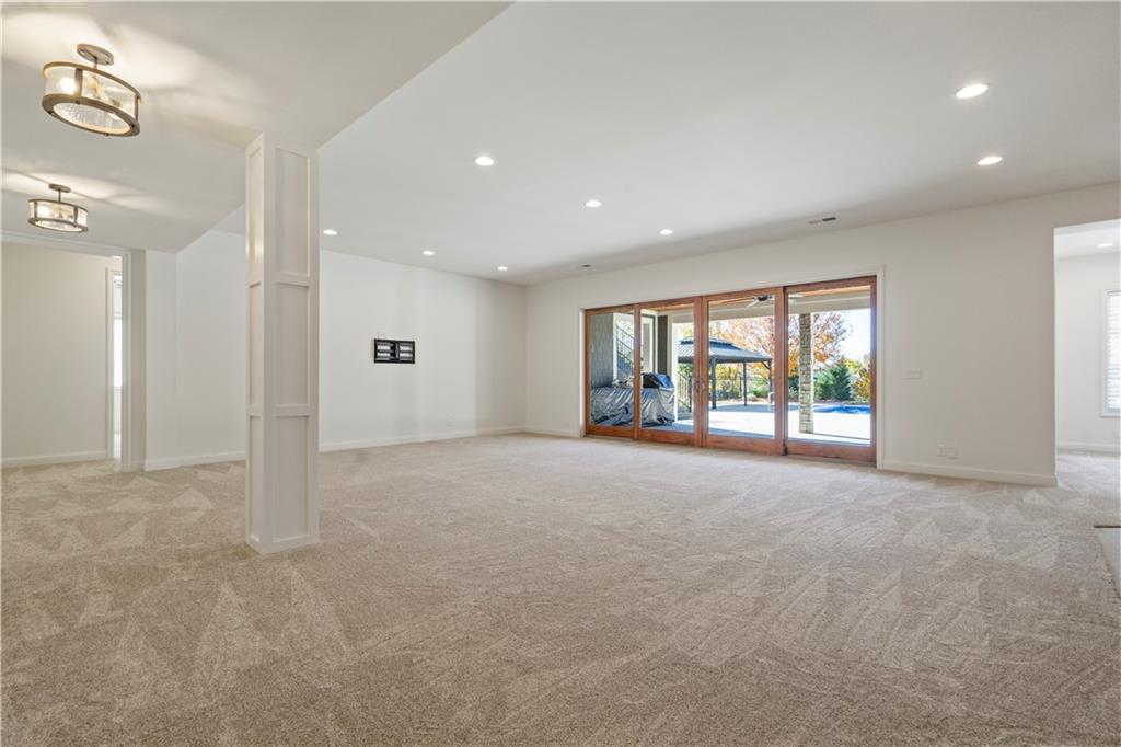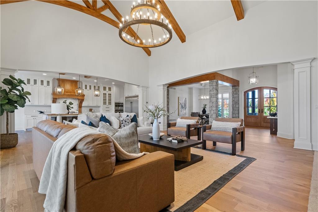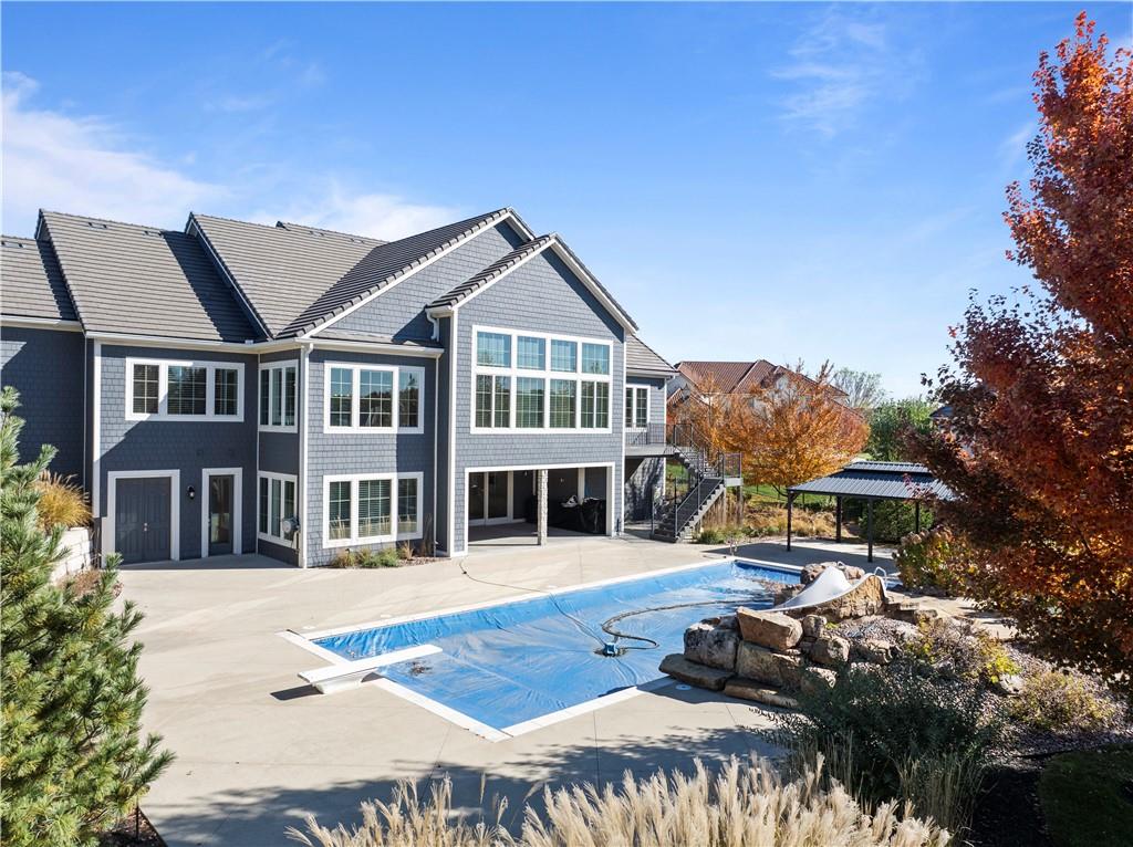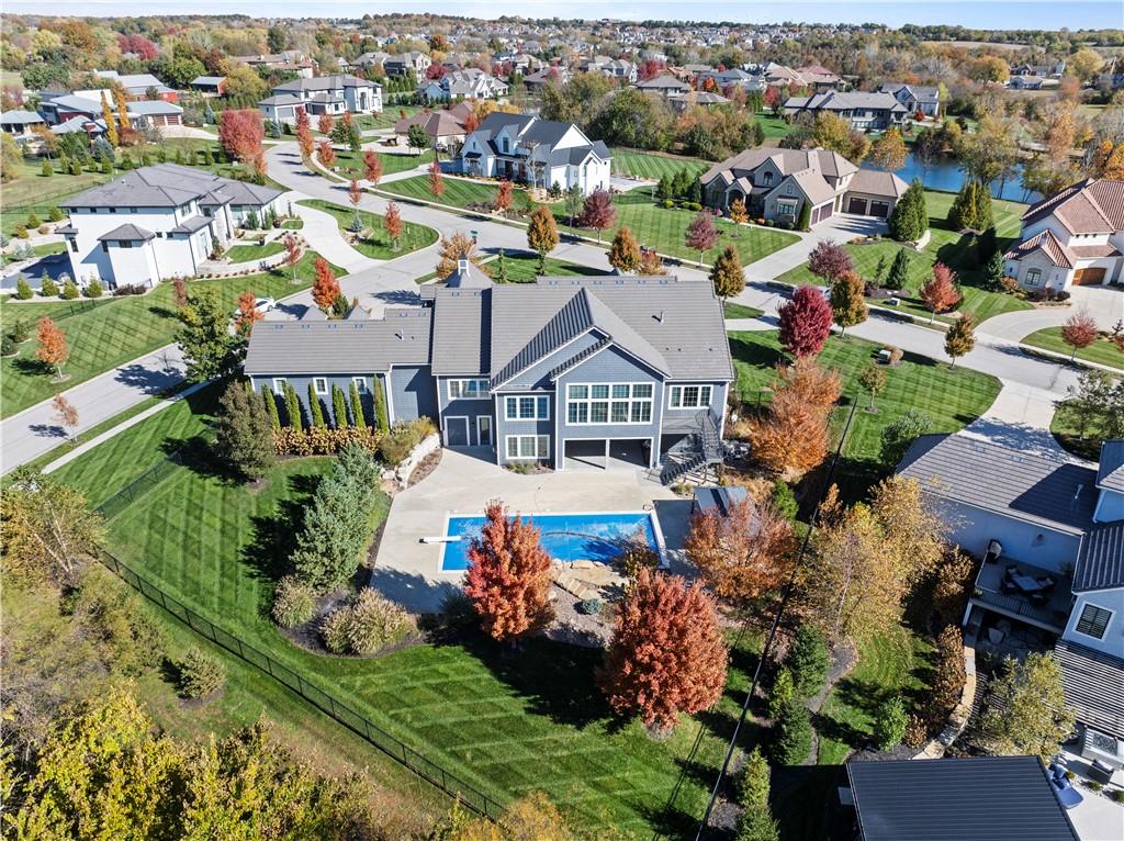 Fall head over heels for this stunning luxury reverse 1.5 story in The Farms at Garnet Hill! Impressive from the start--thoughtful landscaping, circle drive and a 5 car garage. Custom build by Cecil & Ray design team. This elegant home blends timeless design with resort-style living. Step inside to soaring ceilings, rich hardwoods and expansive windows showcasing beautiful views of the private backyard oasis. The open-concept main level features a great room with stone floor to ceiling fireplace and built-ins flowing seamlessly into the gourmet kitchen. Please any chef and entertain in style in this expansive kitchen featuring custom cabinetry, large center eat-in island, walk-in butler's pantry and high-end stainless steel appliances. Adjacent dining and breakfast areas! Easily move the experience onto the lanai with multiple access points for convenience. Spacious primary suite offers a spa-inspired bath including double vanity, soaking tub, large walk-in shower and huge walk-in closet conveniently adjacent to laundry room. Second main-floor bedroom or office with built-ins adds flexibility. Option to take the stairs or use the elevator to the beautifully finished walk-out basement. Here the entertainer’s dream continues with a family room, rec area, gorgeous wet bar, tiered media room, two additional bedrooms each with their own en-suite bath and walk-in closets and bonus pool bathroom with changing room and 2nd laundry. Walk-out access to your in-ground resort styled pool, covered patio, sun deck and lush landscaping providing privacy. Impeccably maintained, thoughtfully designed and located in one of Overland Park’s most desirable neighborhoods—this is luxury living at its finest! WELCOME HOME!