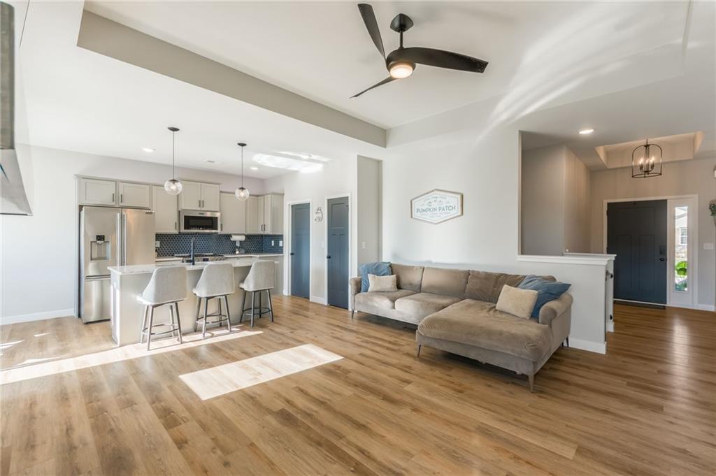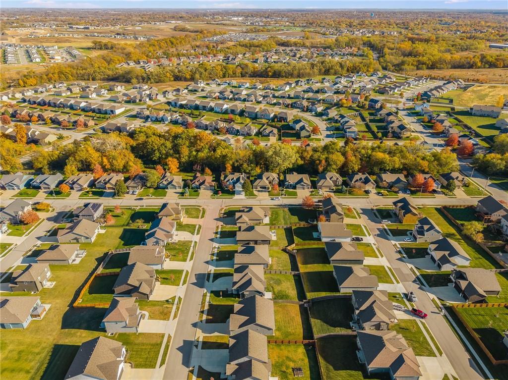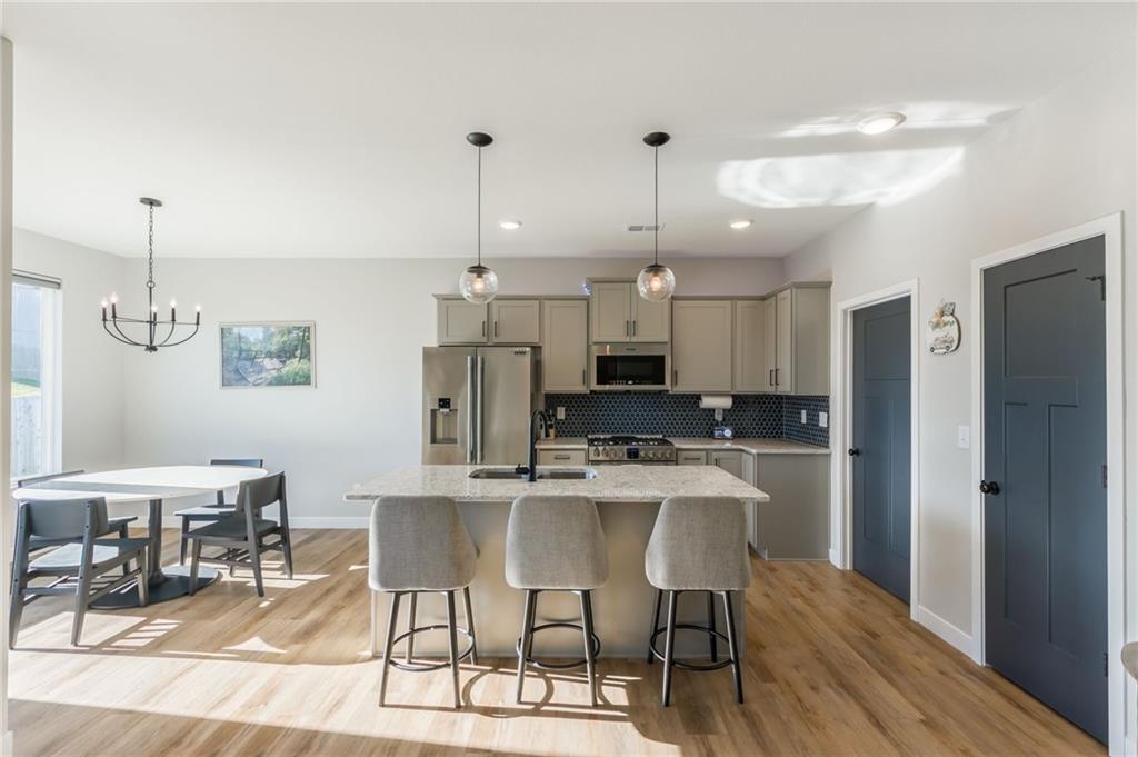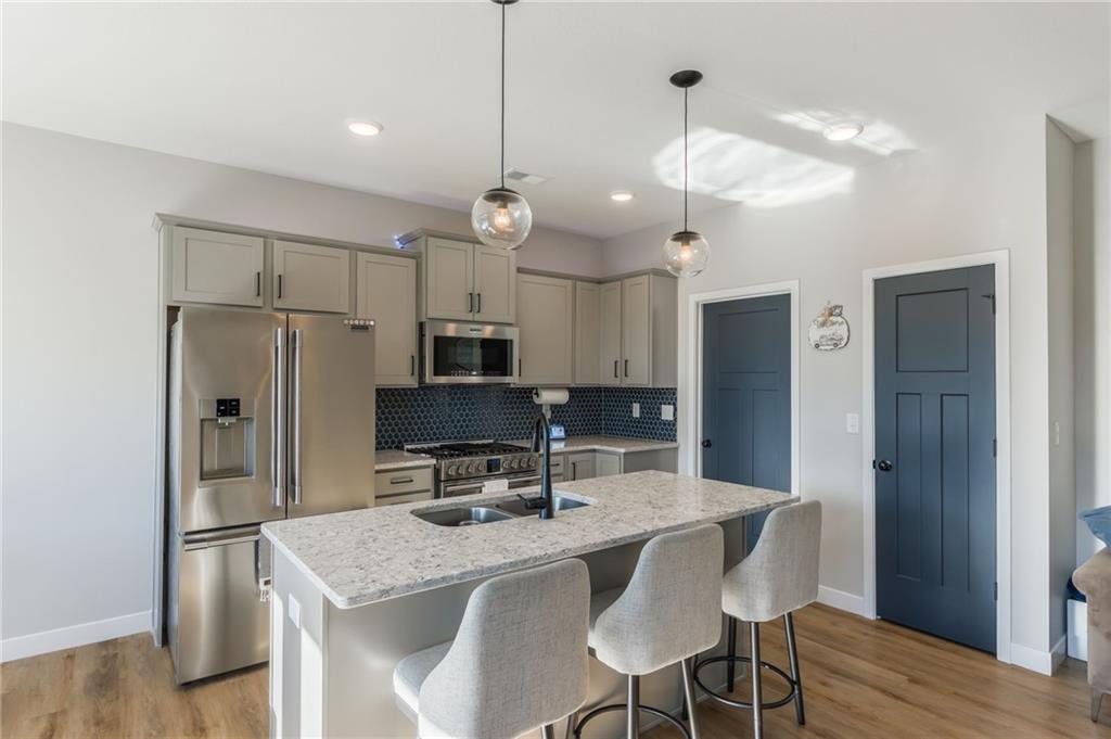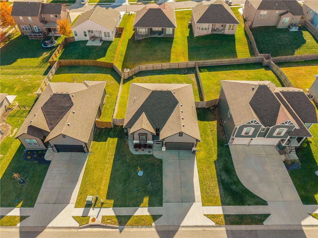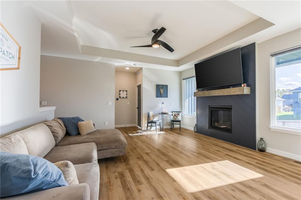 Three bedrooms upstairs in this new ranch, a 4th bed and bathroom downstairs. All high end LVP flooring on both levels. Smart finish upgrades. The walls have the smooth, pure look of fresh flat paint but it's a very high-end wipeable matte. Other choices that set this nearly new house apart are the extended rear porch slab, the high grade of appliances (gas range included, air fryer option in both microwave and oven), the door slab accent color, the wainscot and tile accent wall in the mudroom/laundry room, and two charging receptacles in the garage for EVs. Backyard is fully fenced. Come see a rare 'bedrooms up' ranch with a near zero maintenance exterior and an upgraded kitchen. Quiet neighborhood connects to the Line Creek trail system. Quick access to hwys between I-29 and 169 make this house ideal for errands or commuters. Other upgrades: Smart blinds in master and common areas, all installed blinds match style. Natural gas quick connect line for the covered porch, sturdier panty shelving, higher grade quartz selection on counter tops throughout, tile bathrooms. And of course, the finished rec-room, bathroom and day-lit bedroom in basement. Walk in pantry, walk in closets upstairs and down.
