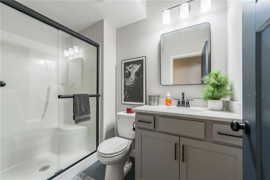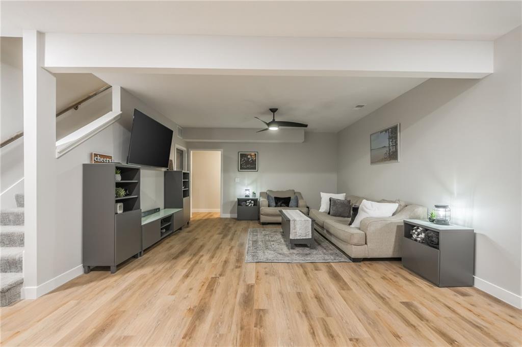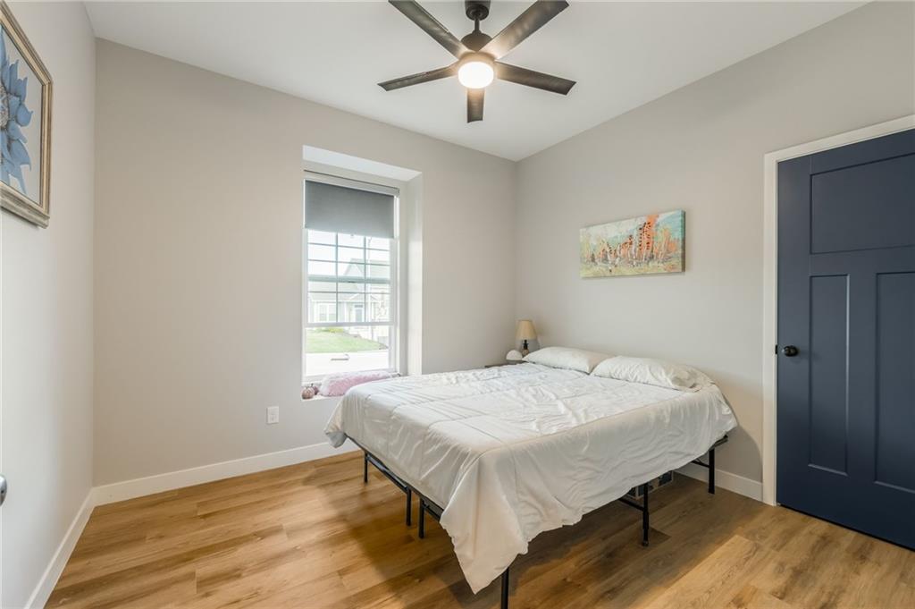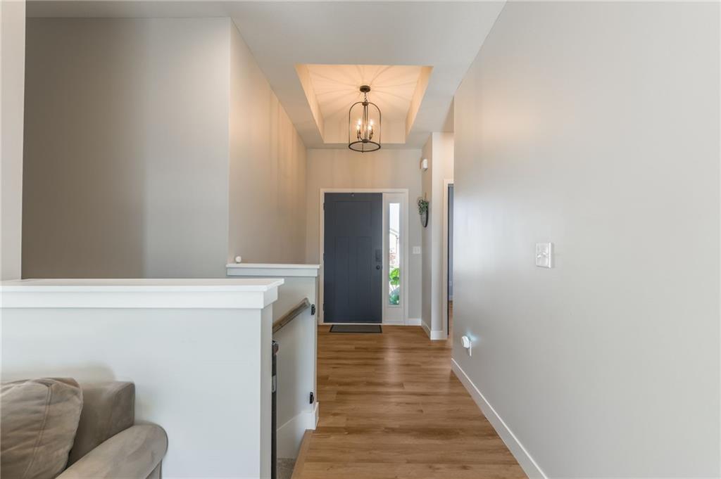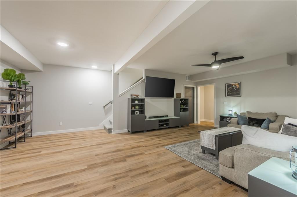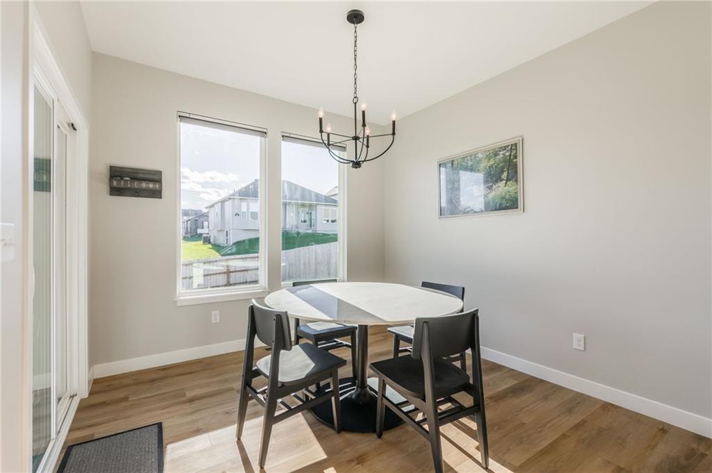 Three bedrooms upstairs in this new ranch, a 4th bed and bathroom downstairs. All high end LVP flooring on both levels. Smart finish upgrades. The walls have the smooth, pure look of fresh flat paint but it's a very high-end wipeable matte. Other choices that set this nearly new house apart are the extended rear porch slab, the high grade of appliances (gas range included, air fryer option in both microwave and oven), the door slab accent color, the wainscot and tile accent wall in the mudroom/laundry room, and two charging receptacles in the garage for EVs. Backyard is fully fenced. Come see a rare 'bedrooms up' ranch with a near zero maintenance exterior and an upgraded kitchen. Quiet neighborhood connects to the Line Creek trail system. Quick access to hwys between I-29 and 169 make this house ideal for errands or commuters. Other upgrades: Smart blinds in master and common areas, all installed blinds match style. Natural gas quick connect line for the covered porch, sturdier panty shelving, higher grade quartz selection on counter tops throughout, tile bathrooms. And of course, the finished rec-room, bathroom and day-lit bedroom in basement. Walk in pantry, walk in closets upstairs and down.