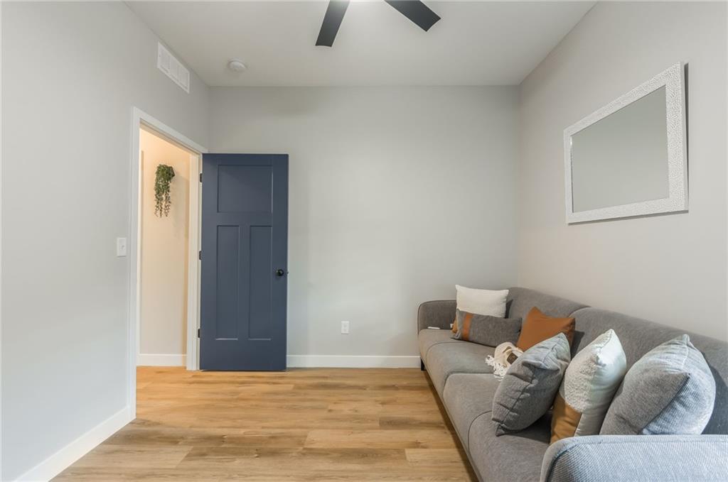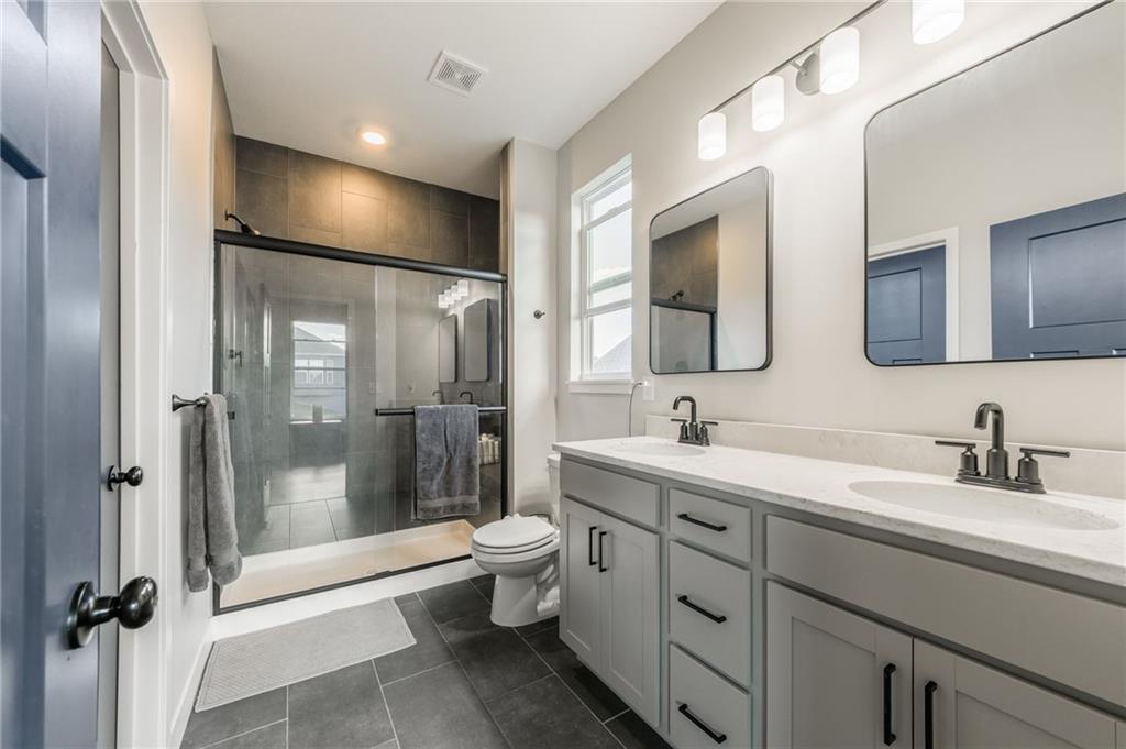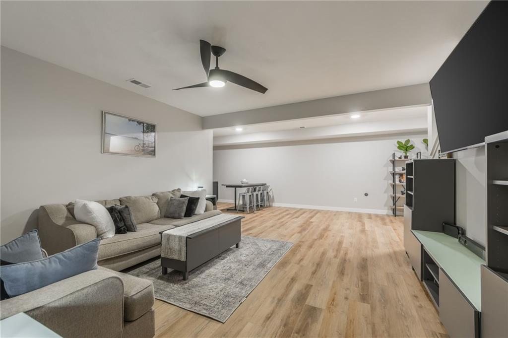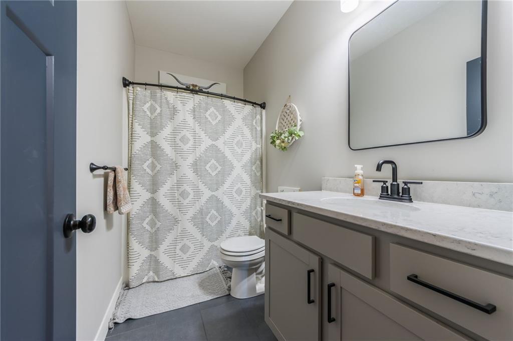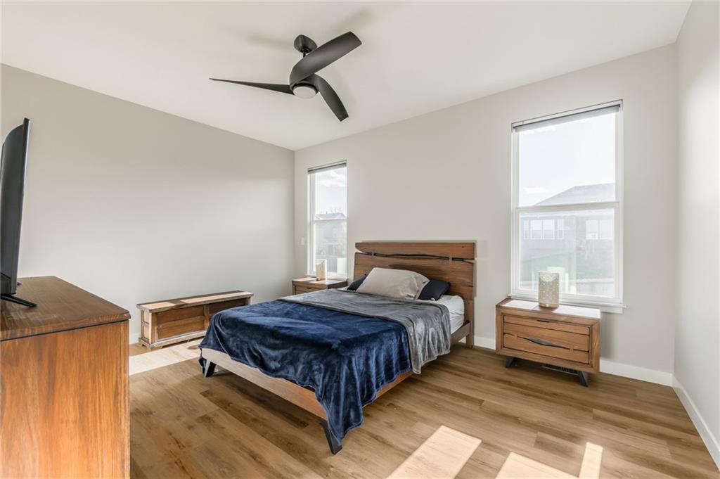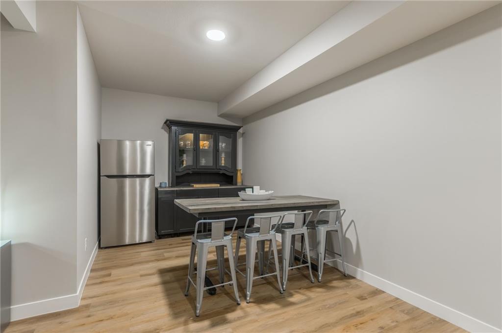 Three bedrooms upstairs in this new ranch, a 4th bed and bathroom downstairs. All high end LVP flooring on both levels. Smart finish upgrades. The walls have the smooth, pure look of fresh flat paint but it's a very high-end wipeable matte. Other choices that set this nearly new house apart are the extended rear porch slab, the high grade of appliances (gas range included, air fryer option in both microwave and oven), the door slab accent color, the wainscot and tile accent wall in the mudroom/laundry room, and two charging receptacles in the garage for EVs. Backyard is fully fenced. Come see a rare 'bedrooms up' ranch with a near zero maintenance exterior and an upgraded kitchen. Quiet neighborhood connects to the Line Creek trail system. Quick access to hwys between I-29 and 169 make this house ideal for errands or commuters. Other upgrades: Smart blinds in master and common areas, all installed blinds match style. Natural gas quick connect line for the covered porch, sturdier panty shelving, higher grade quartz selection on counter tops throughout, tile bathrooms. And of course, the finished rec-room, bathroom and day-lit bedroom in basement. Walk in pantry, walk in closets upstairs and down.