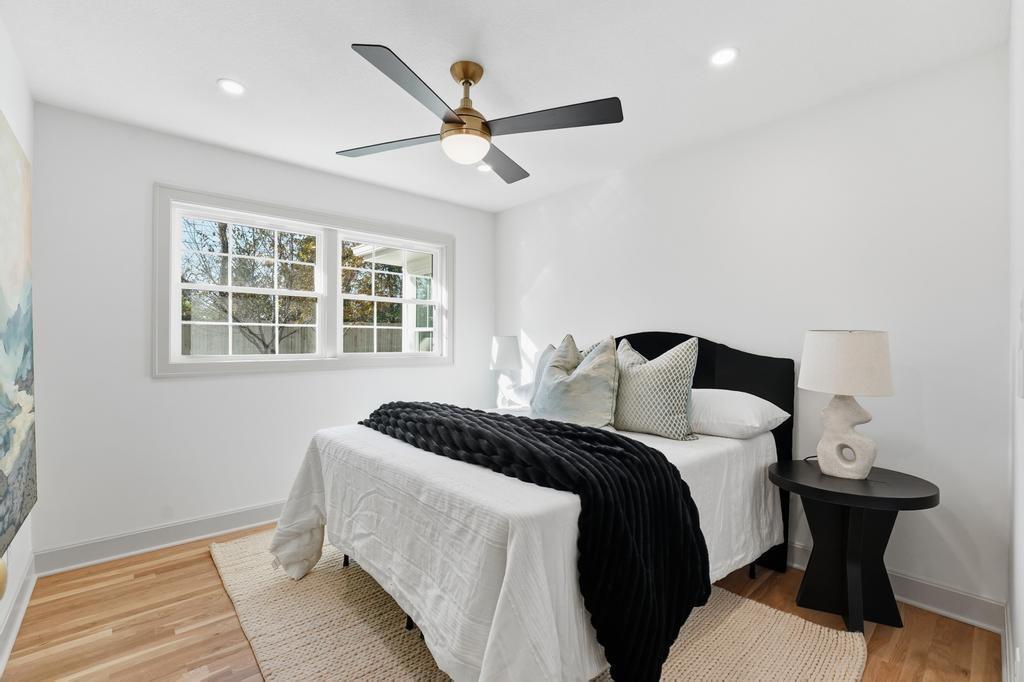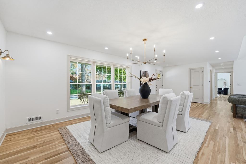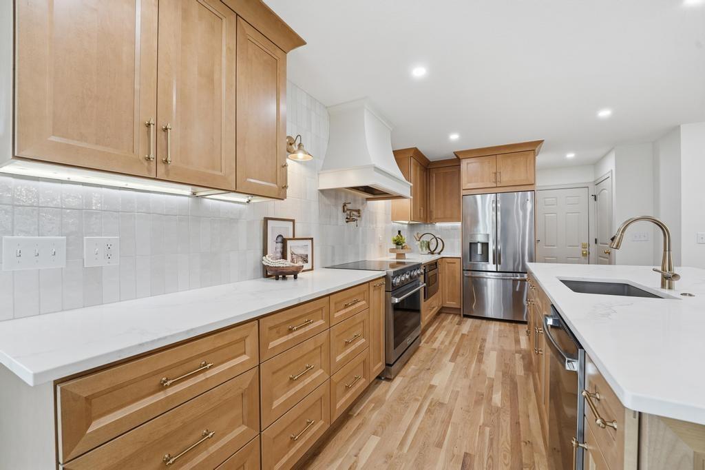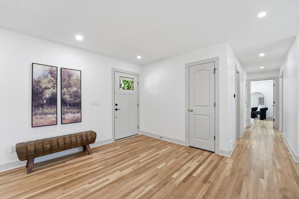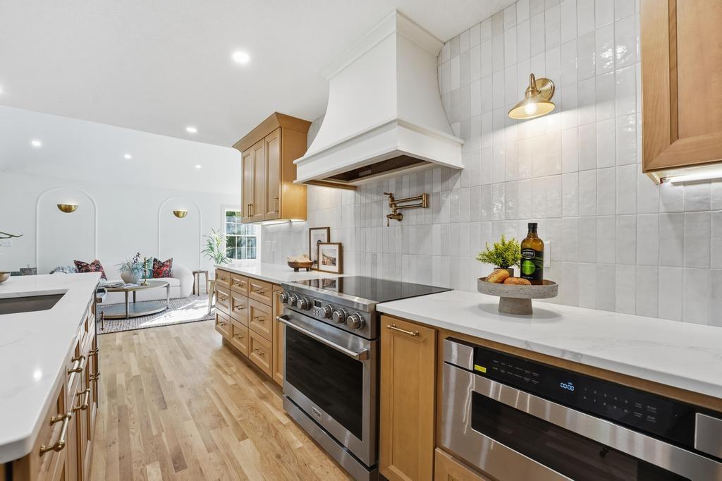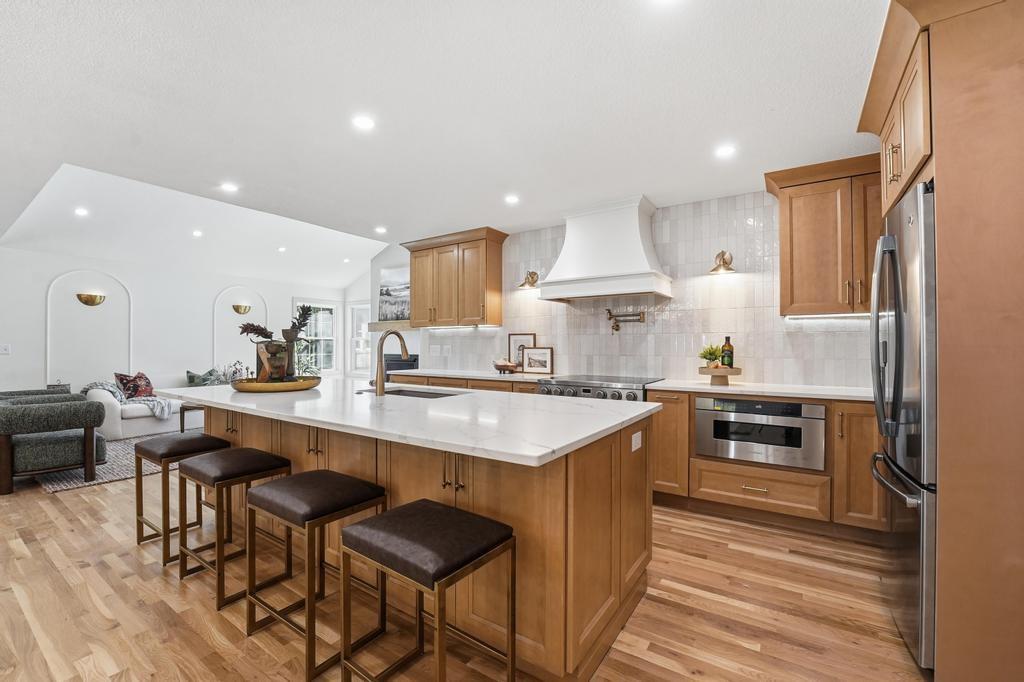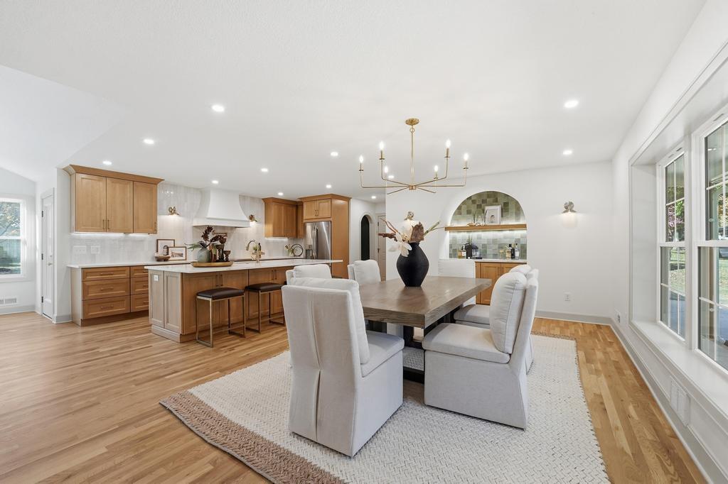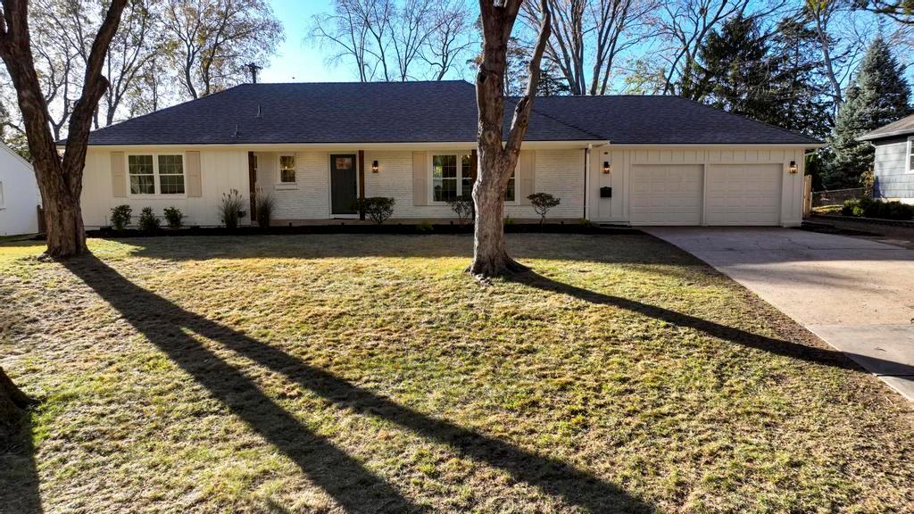 ABSOLUTELY STUNNING REMODELED RANCH IN THE HEART OF LEAWOOD! This beautifully reimagined 4-bedroom, 3-bath home perfectly blends timeless charm with sophisticated modern design. Step inside to an inviting open-concept layout featuring gleaming refinished hardwood floors, designer lighting and high-end finishes throughout. The vaulted family room is filled with natural light and anchored by a cozy fireplace—ideal for gathering or relaxing. Show stopping kitchen will impress any chef with quartz countertops, custom cabinetry, walk-in pantry, stainless steel appliances and a large eat-in island perfect for entertaining. Seamlessly connected dining area with built-in dry bar makes hosting effortless! Retreat to the spacious primary suite boasting a walk-in closet with washer/dryer hook-ups and a luxurious spa-inspired bath with double vanity, soaking tub and walk-in shower. A second main-level bedroom and full bath offer flexibility for guests or a home office. Full, finished lower level expands your living space with a generous rec room, two additional bedrooms, a third full bath and ample storage. Enjoy outdoor living on the patio overlooking the beautifully landscaped backyard with access from the family room to easily move the party outdoors. Bonus feature includes an EV car charger in the attached garage. Located in a highly sought-after Leawood neighborhood near parks, top-rated schools, premier shopping and dining. Move-in ready, meticulously updated and absolutely stunning—WELCOME HOME!