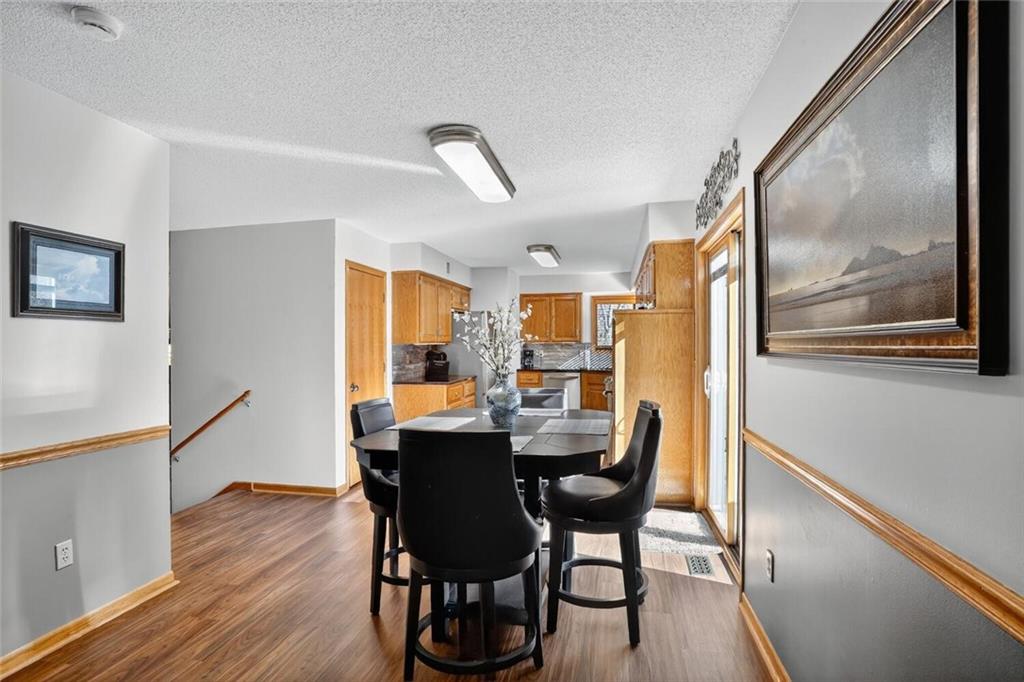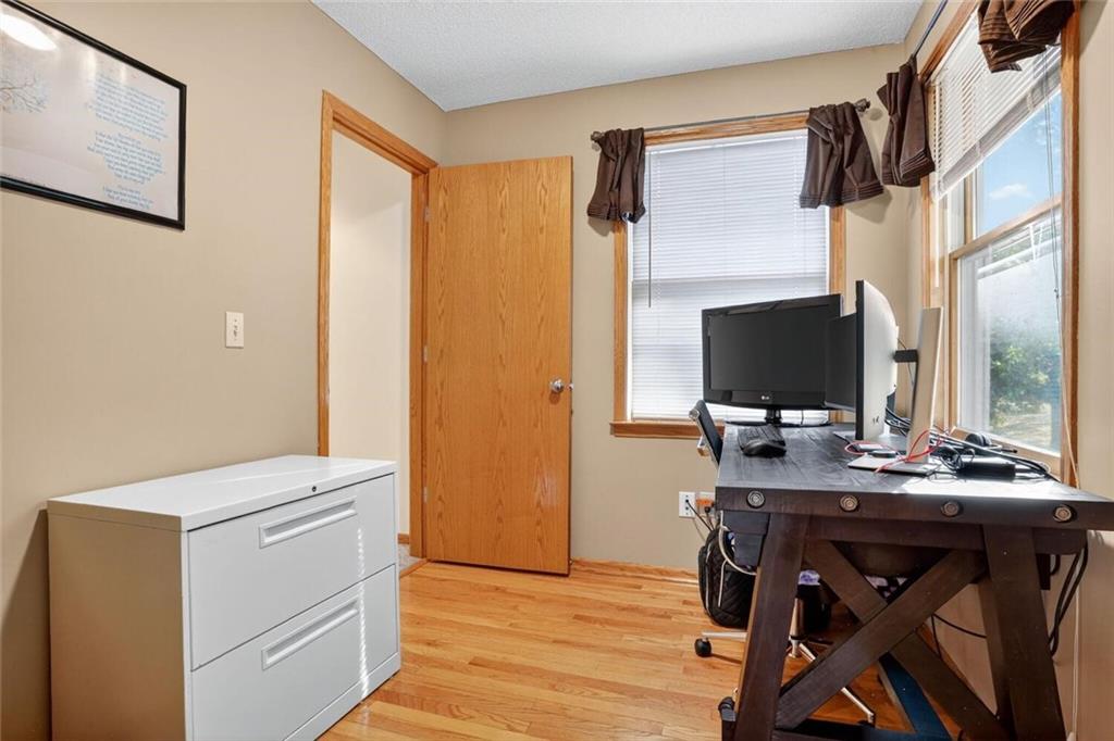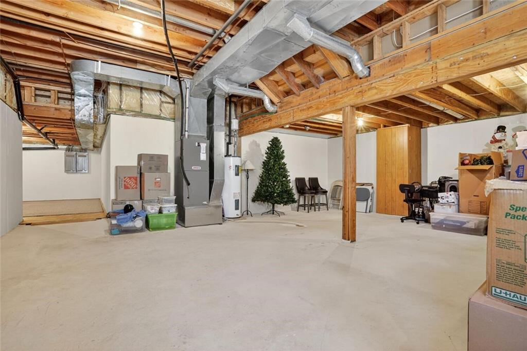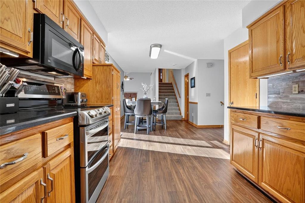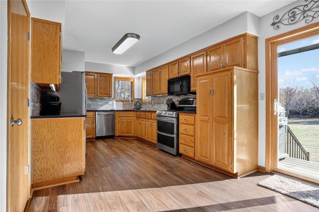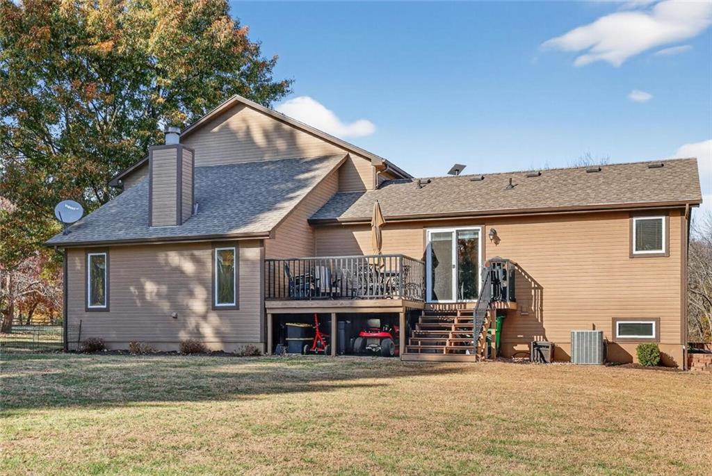 Peaceful Setting in Windmill Springs on an extra-large level (just over an acre!) Lot outside city limits w/no HOA, this 3 Bedroom, 2.5 Bath home offers flexible space for daily living. Entry features a vaulted ceiling, coat closet, & all-new LVP on the main level. The Great Room centers on a masonry brick Fireplace w/oak mantle & brick hearth, 17' Vaulted Ceiling, custom-blind Windows on two sides, library panel to chair rail, Ceiling Fan, & LVP. The Eat-In Kitchen includes black granite Countertops, ceramic tile Backsplash, oak raised-panel Cabinets, under-cabinet lighting, a corner composite farmhouse Sink framed by dual Windows, & a Pantry w/adjustable shelves. Stainless Appliances: Electric Range, Dishwasher & Refrigerator; black Built-In Microwave. Dining opens to a Composite Deck w/aluminum railing that steps to the Backyard. Main-level Laundry offers cabinets & extra storage. A Half Bath is conveniently located on the main level. Upstairs, the Primary Bedroom connects to a Flex Space/Office. The Primary Bathroom features two vanities, an upgraded cultured marble Shower w/glass doors & built-ins, and generous linen storage. Two additional Bedrooms are connected by a Full Bath. A T-shaped Hallway overlooks the Great Room & includes a built-in linen cabinet. The Front-Entry Garage is extra deep for vehicles(3 cars fit), gear, or workshop use, offering insulated Doors w/openers, finished walls & ceiling, over-nine-foot Ceiling height, built-in shelving, work bench, a side Window, & walkout access to the Backyard. Lower Level provides daylight Windows, tall ceilings, storage, & future finish potential. Systems include a Lennox heat pump & a Rheem water heater. Outdoor living adds a fenced garden area, mature trees, a fire-pit, a long concrete Driveway, & a quiet Cul-de-Sac setting. Served by Blue Valley School District. Everyday needs are close by across south Johnson County w/ quick connections to US-69 & 179th Street for commuting, parks, & community amenities.