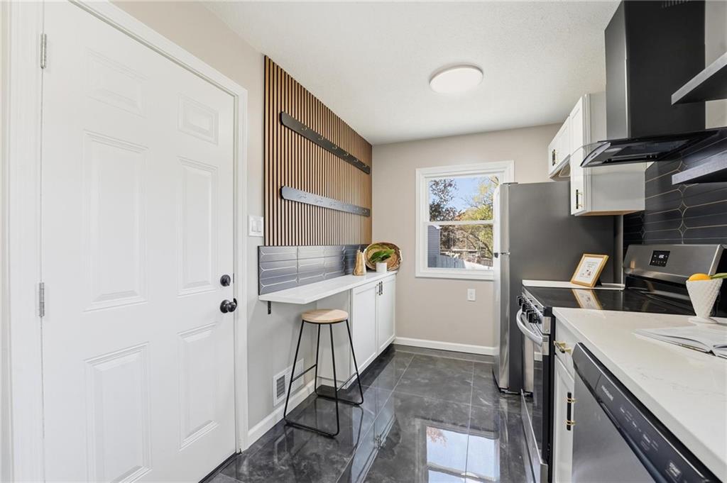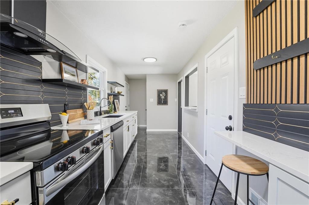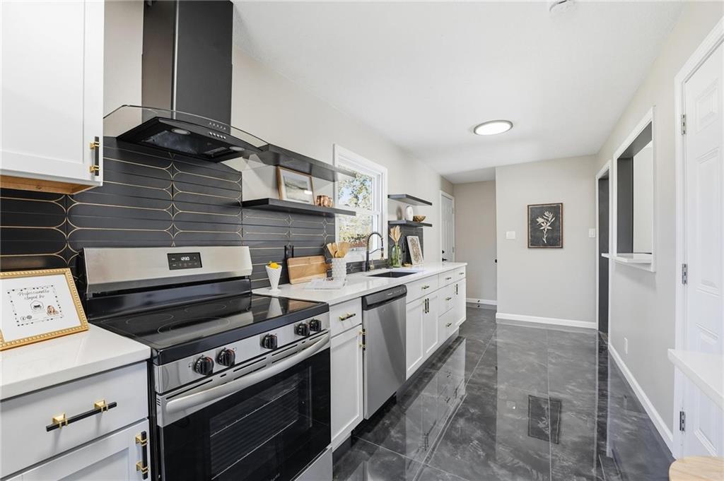 Beautifully Renovated Ranch in the Heart of the Northland! This fully updated 3-bedroom, 2-bathroom ranch-style home offering modern finishes, timeless design, and unbeatable convenience in Kansas City’s Northland. Recent exterior improvements include new siding, new windows, and a new roof, providing long-term peace of mind and excellent curb appeal. Inside, a bright and inviting living space features refinished hardwood floors, fresh neutral paint, and updated trim and hardware for a clean, cohesive feel. The stunning designer kitchen serves as the centerpiece of the home, showcasing sleek black tile accents with gold detailing, quartz countertops, open shelving, new stainless steel appliances, and upgraded cabinets and hardware. The dining area sits just off the kitchen for easy everyday living and entertaining. Both bathrooms have been fully remodeled, featuring modern tilework, stylish lighting, and high-quality fixtures. All three bedrooms offer comfortable space with updated finishes throughout. The expansive unfinished basement is freshly painted and ready for storage, a workshop, or future expansion. A one-car garage and large driveway provide convenient off-street parking. Outside, the freshly painted concrete patio offers a perfect spot for outdoor dining and relaxation. Located minutes from dining, shopping, schools, and major highways, this home blends style, comfort, and location into one incredible opportunity. Don’t miss your chance to own this beautifully updated Northland ranch!