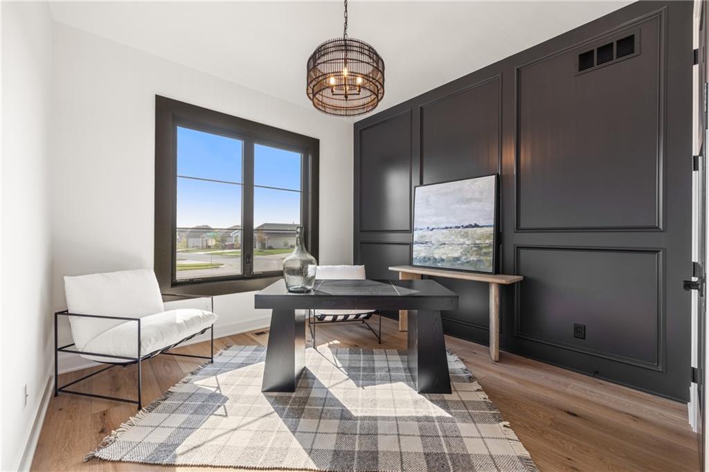 Introducing Lot 27 in Woodmyre—a sophisticated 1.5-story residence by award-winning JFE Construction. The Maplewood III Modern blends architectural drama with modern livability, beginning with a sweeping staircase. A private office off the entry creates a quiet workspace, complemented by a well-appointed full bath. The great room is anchored by a soaring two-story fireplace, perfectly paired with a gourmet kitchen featuring a custom coffee bar and expansive walk-in pantry. Sunlight pours into the southern-exposure dining room, which opens to a covered deck for year-round enjoyment. The primary suite is a serene retreat with a vaulted ceiling and a spa-inspired ensuite. On the upper level, all secondary bedrooms extend from an airy catwalk and surround a spacious loft—ideal for studying, lounging, or gathering. Photos are of previous model. Taxes and room sizes are estimated. Amenities coming include custom pool, playground, pickleball court, community pavilion and practice soccer field. Home scheduled to be complete in March!!! Schedule a showing today!