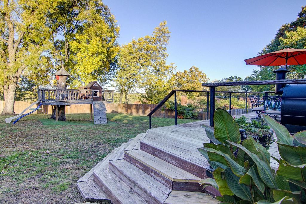 Welcome home for the holidays to this completely updated, well maintained home on a 1/2 acre flat, private lot! Nestled in on the quiet end of Nall (dead ends just north), you will fall in love at first sight! Sip your morning coffee on the HUGE covered front porch, or take in the beautiful sunsets on the oversized back deck overlooking a parklike fenced in yard with a kid's dream treehouse. Step inside to the 4 bed, 3.5 bath home with THREE bedrooms on the main level. Entertain guests with your dream kitchen that includes ample storage, pantry, granite counters, bar seating, and beautifully updated tile backsplash. Cozy up to the wood burning stove fireplace and watch all your favorite movies this winter. Home features an oversized, 2 car detached garage and a large, flat driveway for the kids to play and ride bikes. Recent updates include a brand new roof and gutters, newer HVAC and humidifier, added butler's area just off kitchen, and new flooring in primary bath. You will LOVE this very walkable neighborhood that is the perfect proximity to shopping, highways, schools, Nall Park, Cedar Roe Library, and Roeland Park Community Center and Aquatic Center. You won't want to miss calling this one HOME!