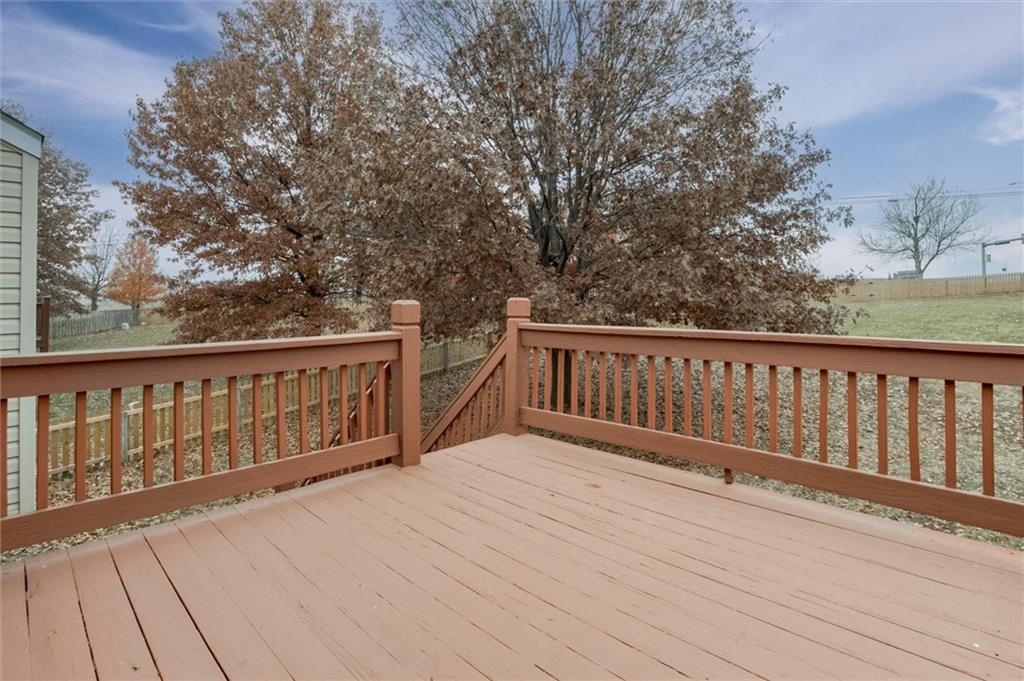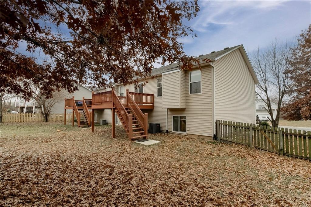Move-in ready and updated with new roof, fresh paint, new flooring, new epoxy floors in garage, new hot water heater, new lighting, newer A/C. Great layout with a large primary suite and walk in closet. Primary bath has dual vanities and sinks with separate shower/tub. Kitchen cabinets have been freshly painted. Fridge stays! Guest bath also has dual vanities. Vaulted ceilings, fireplace, hardwood and ceramic tile floors, new carpet, thermopane windows. Huge fenced yard, re-stained deck, maintenance free exterior. Built-in garage shelving. Awesome location close to highways and conveniences in the award winning Olathe school district.