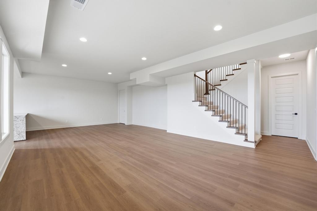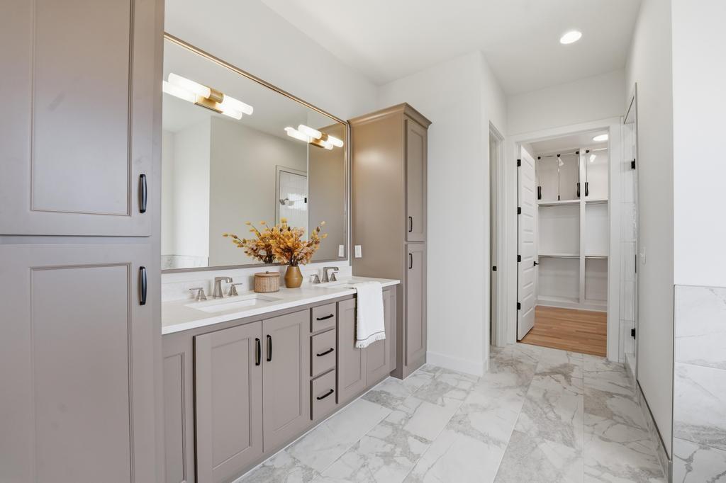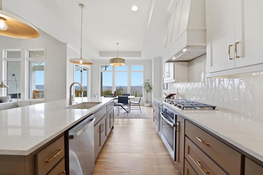 The stunning Emerson reverse 1.5 story plan by French Homes in Cedar Creek's newest community - The Estates of Canyon Oaks. Located in the award-winning Olathe School District, this reverse 1.5 story home has 4 beds, 3.5 baths, 3 car garage and sits on a walkout lot on a cul-de-sac. Step inside the double wide doors into the entry which leads you to the spacious family room with wood floors and fireplace with built-in cabinet surrounds. The gourmet kitchen features an island, custom cabinets with hood, cooktop, built in oven/micro and a generous sized prep pantry with storage, sink and beverage cooler. The eat-in dining space has a built-out space perfect for a hutch and also connects to the covered deck - perfect for morning coffee. The private main level primary suite offers a spa-like bathroom that includes double vanities, free-standing tub, shower with bench and a huge walk-in closet that conveniently connects to your laundry room. Main level also has a second bedroom, full bath and a mudroom with bench off the garage. The walkout lower level includes a large rec room with second fireplace, wet bar with island and two additional bedrooms, 3rd full bath and a half bath perfect for guests. Plenty of unfinished storage space left too. Enjoy Cedar Creek's amazing amenity package that includes 3 neighborhood pools, community clubhouse with exercise room and indoor basketball court, lit pickleball and tennis courts, access to 65 acre lake, monthly neighborhood events, walking trails and more.