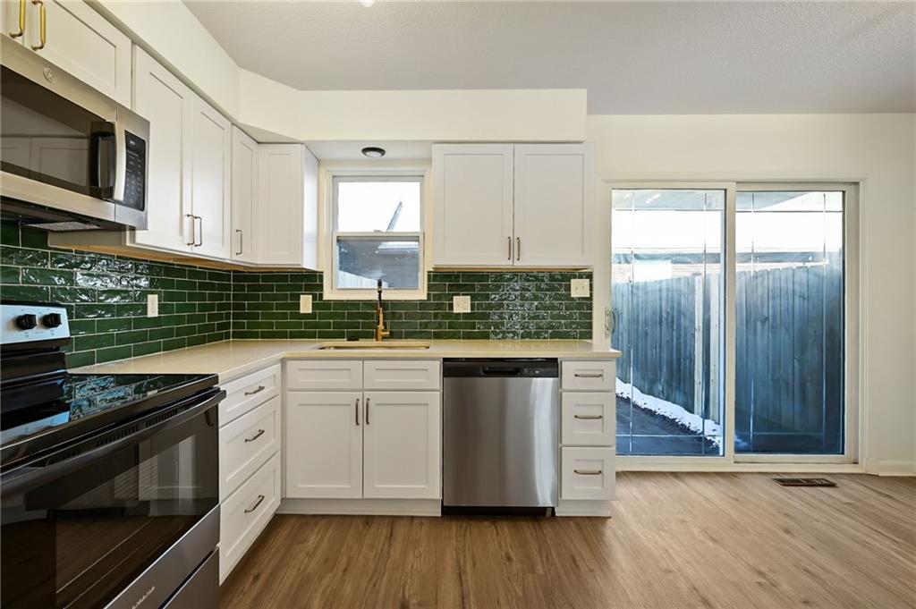 Welcome home to this stunningly refreshed 2-bed, 1.5-bath property offering modern style, thoughtful updates, and incredible convenience in a quiet, desirable community. Step inside to an open and inviting main level featuring all-new flooring, fresh paint, and great natural light. The fully updated kitchen is a showstopper—complete with white shaker cabinetry, sleek quartz countertops, stainless steel appliances, and a bold emerald green tile backsplash that adds the perfect touch of personality. Enjoy seamless access to the private back patio through oversized sliding doors, making indoor/outdoor living effortless. A beautifully remodeled half bath with modern fixtures completes the main floor. Upstairs, you’ll find two large bedrooms with generous closets and an updated full bathroom. The partially finished basement provides additional flexible living space—perfect for a home office, rec room, or workout area—plus extra storage. Major mechanical updates include brand-new HVAC, providing peace of mind for years to come. A rare find in this community, this home also includes a spacious 2-car garage! Enjoy low-maintenance living with an HOA that covers lawn care, exterior maintenance, and common area upkeep, giving you more time to relax and enjoy your home. This move-in ready home offers an incredible opportunity for easy, stylish living.