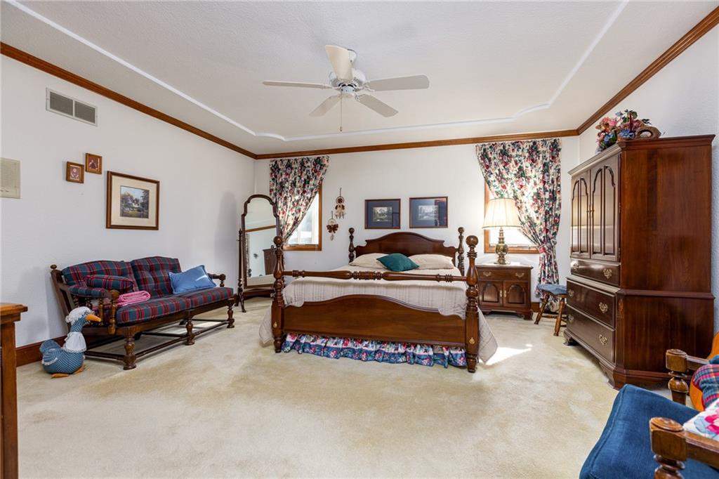 If you've always wanted to live at Weatherby Lake - now is your opportunity! This Lovely 1 1/2 Story home is just waiting for you! Beautiful corner lot (.42 acres) that's been meticulously cared for! The Pride of Ownership is evident everywhere you look. From the vaulted entry with skylight to the solid core doors everywhere (on all levels!). The Great Room features 10 ft ceilings and a beautiful WBFP with gas logs flanked on both sides by bookshelves. There's a Formal Dining room for those special occasions and a cozy eat-in kitchen/breakfast area for your morning coffee. The primary bedroom on the main level is generously sized and includes an ensuite bath with garden tub and separate shower, double vanities, & 2 walk-in closets. The laundry room is conveniently located on the main level. The upper level features a loft/sitting area and 2 large bedrooms (both with walk-in closets) and a full bath. The finished lower level offers space for a pool table/game area plus a comfortable gathering space near the 2nd WBFP! And there's still room for a large storage area and 1/2 bath. The 2 car Attached Garage includes openers and NEW doors in '24. The lower level 3rd garage is perfect for that "classic car" or just the lawn equipment and lake toys! There's a deck and patio off the kitchen to enjoy warm summer nights. The furnace is newer (2020) and the A/C was replaced in Oct '23! And the gutters are apppox 2 yrs old. This home has been loved and cared for by the original owner and it shows!! Now add to all that - the fun of living at the Lake and it just doesn't get any better!! Enjoy all that Weatherby Lake offers...swimming, fishing, community events & more! Don't miss the chance to own in this amazing Lake community!