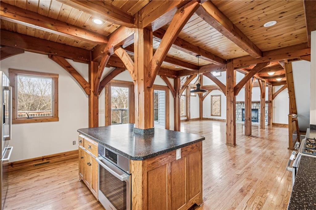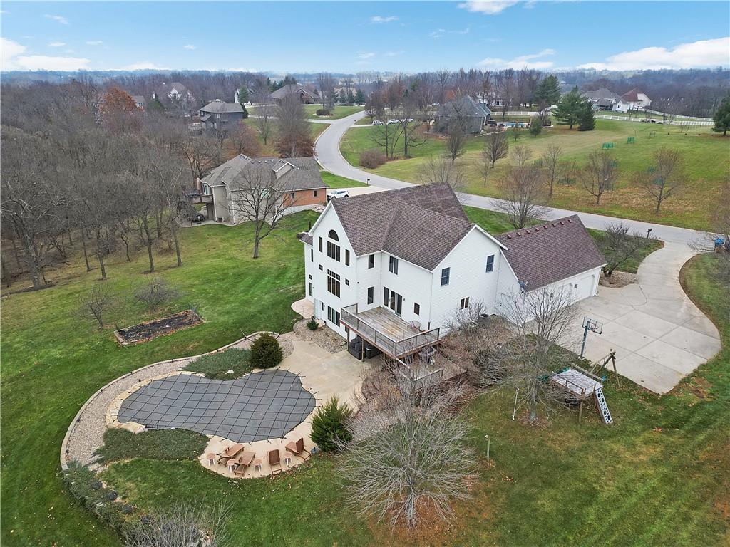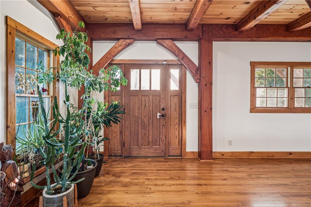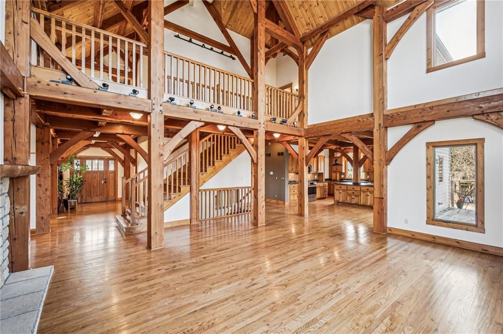 This exceptional one-of-a-kind custom timber-frame home seamlessly blends rustic character with modern luxury, set on 1.84 picturesque acres in Holmes Creek Hills North A welcoming front porch, perfect for rocking chairs invites you inside. Entertain with ease in the formal dining room, then take in the show-stopping living room featuring soaring 22-foot vaulted ceilings, exposed beams, a striking stone fireplace, and a dramatic wall of high-end angular windows overlooking the saltwater pool and wooded back yard. Hardwood floors extend throughout this open-concept main level into a gourmet kitchen with walk-in pantry. The main-level owner's suite offers a private retreat with heated floors, a tiled walk-in shower and freestanding soaking tub. Upstairs, three generously sized bedrooms offer provide flexible living options, including a nonconforming loft-style space ideal for a home office or study. The two-tier, finished walk-out basement is an entertainer's dream. Media/family room with 104" TV is the perfect area to cozy up for movies. The lower level hosts a second fireplace and full bar creating the perfect space for gatherings. Outdoors, unwind in the evenings around the firepit and enjoy the peaceful setting this property offers.