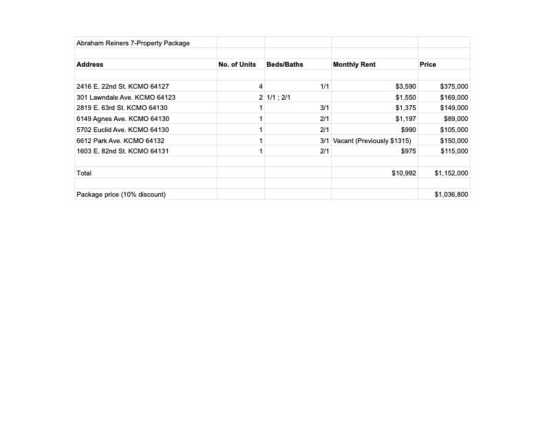 Attention investors! Here is a great package of single family and multifamily properties to add to your portfolio. It includes 5 single family homes, 1 duplex, and 1 fourplex. All properties are in Kansas City, MO. 9 out of 11 units are currently leased (all 1 year leases). All financials are available upon request. Addresses in pictures.