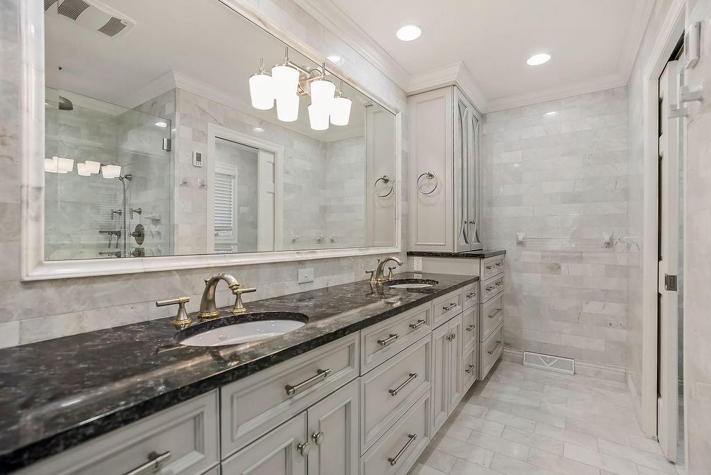 Welcome to the timeless character of an established residence with the comfort & convenience of extensive updates. The stunning curb appeal draws you in, featuring a new Ludowici tile roof, stucco, windows, mahogany front door & shutters, and a brick circle driveway to a side-entry garage—all on a flat, nearly half-acre lot with crisp landscaping. Step inside & feel the quality of your new home. New finishes seamlessly complement original charm. Wood floors flow throughout, creating a warm & inviting layout that includes formal living & dining rooms. A striking hearth-room features rich solid walnut paneling, gorgeous fireplace, crown molding & cabinetry, & adjacent powder room. The hearth room opens to the updated kitchen with solid walnut cabinetry, granite tops & S/S appliances. A 1st floor laundry adds convenience. The spacious primary bedroom suite offers serenity with a sitting room & 2nd fireplace, & a luxurious ensuite bathroom featuring Carrera marble floors & walls, heated floor, double-sink custom vanity, & stunning walk-in shower with double rainfall & wand shower heads. An oversized custom closet completes the suite. Also on the main level is a 2nd bedroom with adjacent fully updated bathroom. Upstairs is truly a dream, showcasing raised ceilings & an expanded 2nd story. An amazing 2nd floor suite offers a walk-in closet & stunning new bath with an oversized walk-in shower with dual shower heads, neutral tile, & beautiful finishes. Bedrooms 4 & 5 are equally impressive: walk-in closets, private en-suite or adjacent remodeled bathrooms, custom glass shower doors and mirrors, & more. The lower level provides expansive space with a partial finish, ready for your personal touches. The backyard offers a peaceful retreat featuring a covered area, sprawling patio, outdoor sink, vented cooking area & generous green space—all fully fenced. So many recent updates, including zoned HVAC, insulation & countless thoughtful improvements. This is truly move in ready