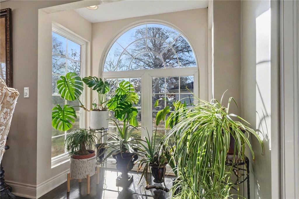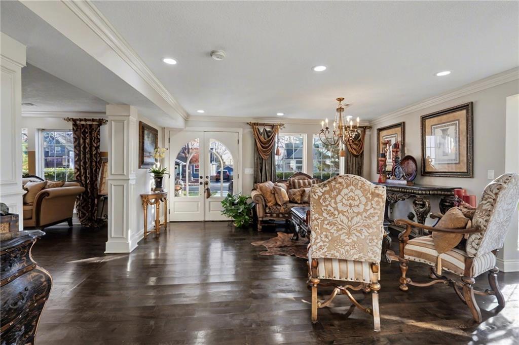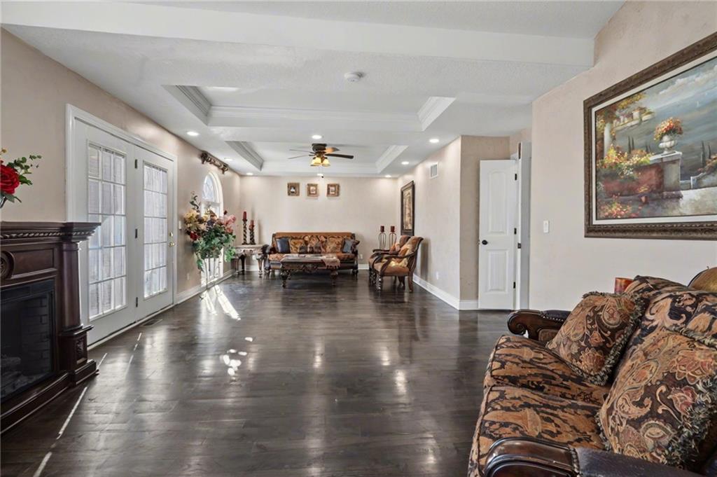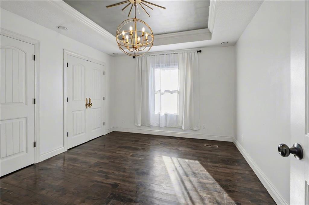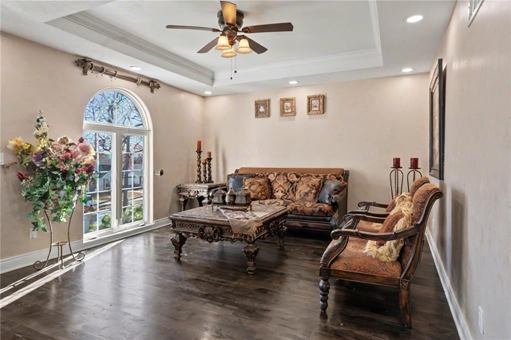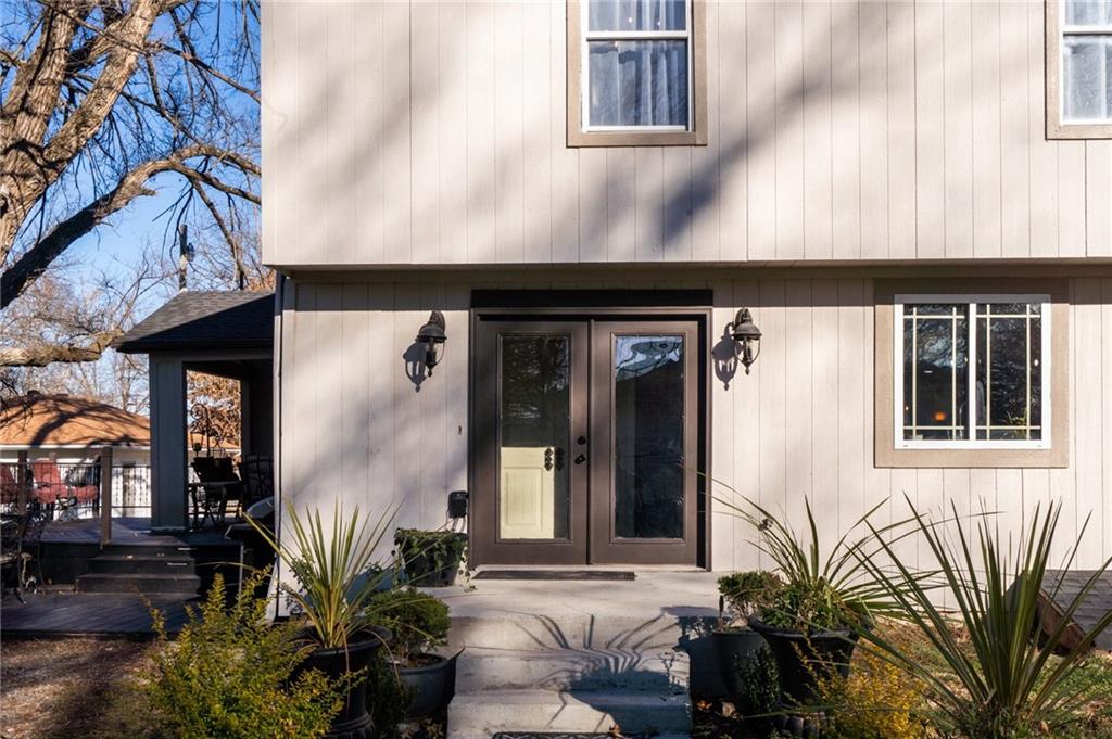 Welcome home to this exceptional and elegant 5 bedroom, 3 bath home in the heart of De Soto. This stunning home features 5 spacious bedrooms, 3 full bathrooms, an open floorplan with hardwood flooring, large windows allowing for an abundance of natural light throughout, plus so much more!! An added feature is the large detached 4 car garage with workshop, office and recreation room on almost 1/2 acre lot. As you step into the entryway you are greeted with tall ceilings, picture windows, and gleaming hardwoods. The beautiful living room has a South facing solarium for plant lovers or a sunny reading nook. The spacious kitchen has beautiful granite countertops and backsplash, 36” gas cooktop, a generous kitchen island for culinary space and seating for four, plus a pantry with pull-outs. The dining room and family room spaces are connected to the main area while also creating a cozy feeling with custom pillars and mouldings, creating a floorplan perfect for entertaining or large family gatherings. Full bath just steps from the main level bedroom that opens to the covered deck with fireplace and quiet yard. Upstairs features four more bedrooms with large closets, a hall bath and primary suite with double vanity, walk-in closet and tiled shower. The largest bedroom has a walk-in closet and balcony. After a long day, relax in the cozy backyard under the covered deck overlooking the fireplace and additional terraced decks. From the custom interior lighting, beautiful trim, windows and doors, to the exterior spaces, balcony, and large yard, this home has exceptional design details both inside and out! Just a short walk away from quaint downtown De Soto and near De Soto schools, the peaceful Lexington Lake Park, and within an easy commute to KC, Lawrence, & surrounding areas, this property has it all! No HOA is ideal for using the detached garage for business or hobbies.
