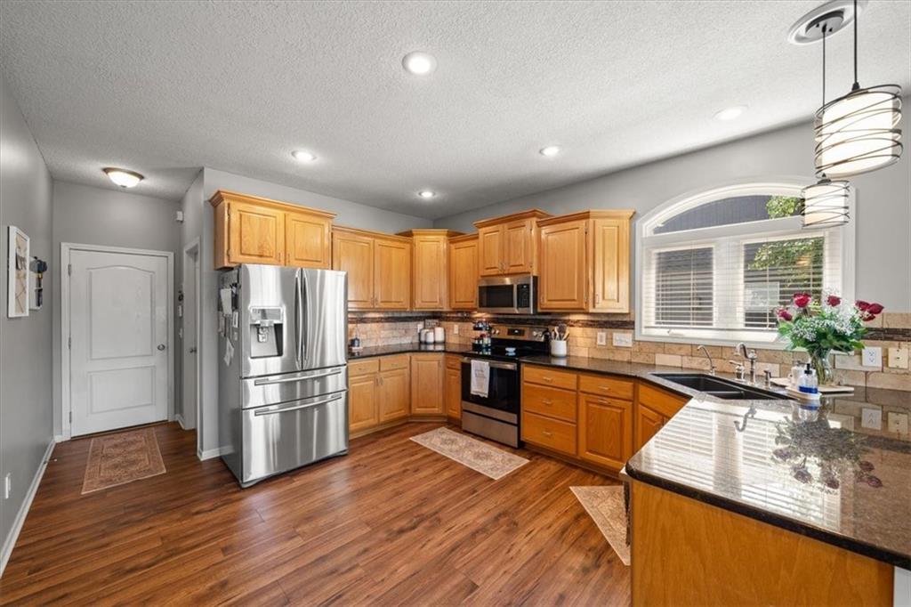 This stunning Reverse 1.5 Story home has been thoughtfully updated and is ready for its new owner. Fresh interior paint, a remodeled primary bath, and luxury vinyl plank flooring in the kitchen, dining, and living areas give the home a modern feel. Brand-new carpet runs throughout, and recent upgrades include a newer A/C unit, dishwasher, microwave, range, stair carpet, hot water heater, and updated lighting. The spacious primary suite features a generous walk-in closet, and the pride of ownership shines throughout every detail of this well-maintained home. Perfect for entertaining, the backyard offers an upper-level deck and a spacious lower-level patio—ideal for relaxing or hosting gatherings. The lower level also includes an oversized door leading to a large storage room, providing plenty of space and potential for future finish. Located in the desirable Lakes at Oakmont subdivision within the highly rated Platte County R-III School District, residents enjoy access to three scenic lakes and walking trails. This home truly has it all—come see it in person to appreciate everything it offers! Owner/Agent