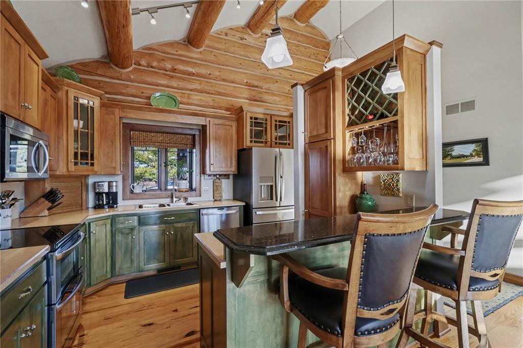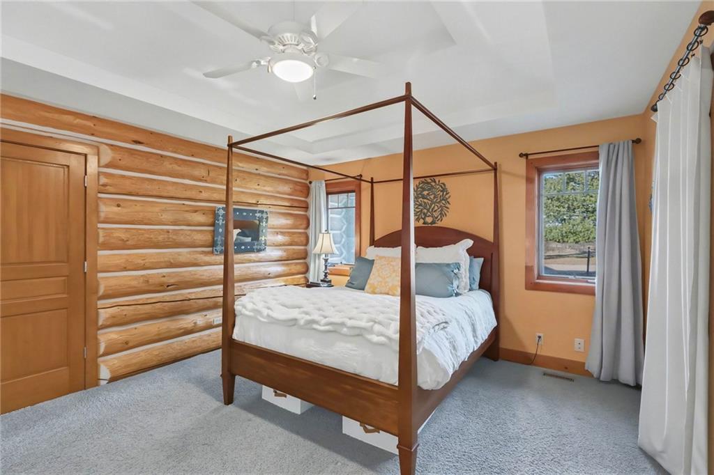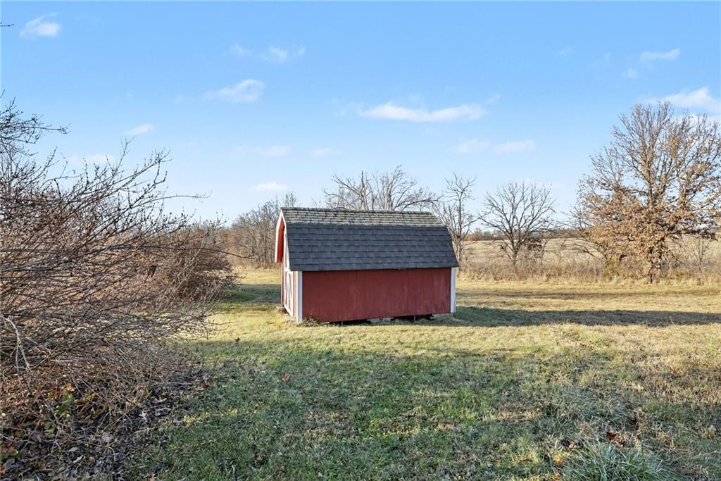 Tucked away on 23 breathtaking acres, this 3,162 sq. ft. Craftsman ranch–style custom log home offers a rare blend of thoughtful design, and unmatched natural surroundings. Built in 2003 and lovingly maintained by its original owners, the home showcases full-round log construction in the central living areas, featuring exposed log trusses, open doorways, and a striking Palladian-style arched picture window that fills the space with natural light. Covered front and back porches invite you to relax and take in the peaceful setting, while cedar-sided, stick-built wings balance beauty with functionality. The main level is designed for effortless living, offering a spacious kitchen, living and dining areas, a walk-in pantry, and custom cabinetry and built-ins throughout. The primary suite includes a full bathroom and a walk-in closet. Two additional bedrooms, a second full bath, multiple linen closets, and a convenient laundry/mudroom are also on this main level. The finished walkout basement expands the living space with a fourth bedroom, third full bathroom, open living/game room, bar, safe room, and abundant storage—including a large utility room and under-stair storage. Comfort and efficiency in the home are enhanced by central air, a heat pump with propane backup, a wood stove fireplace, a radon mitigation system, and high-speed fiber internet. Outdoors, the property is equally impressive with an attached extra deep two-car garage, concrete driveway and patio, 42’ x 64’ shop/barn with a 12-foot door, circular gravel drive, garden shed, raised garden beds, and a landscaped backyard bonfire ring. Crafted from dead-standing pine and fir timber sourced from Wyoming, this one-of-a-kind home is perfectly positioned on a paved, lightly traveled road just one mile from Smithville Lake’s Mecca Access and boat ramp—offering true country living without gravel roads. The acreage borders U.S. Corps of Engineers land along Smithville Lake, ensuring privacy and protected views.