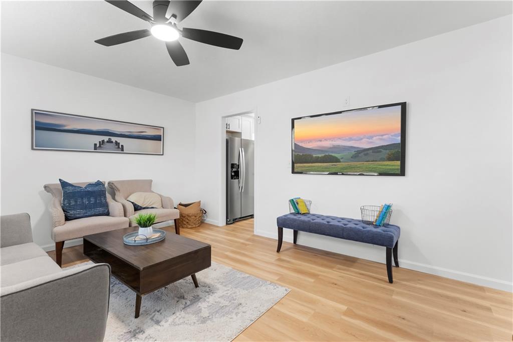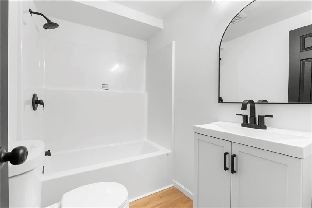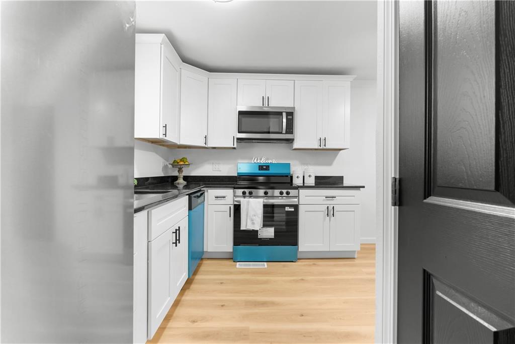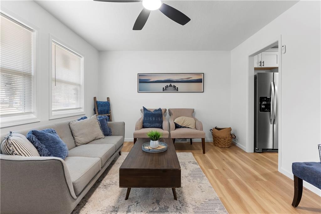 This 4-bedroom, 2-bath raised ranch is move-in ready with major updates already completed. The home features a new roof, new HVAC system, and a fully renovated interior including new kitchen cabinets, updated bathrooms, fresh paint, and modern finishes throughout. The main level includes the primary bedroom, while the finished basement adds a fourth bedroom, full bathroom, and laundry area. Outdoor living includes a front entry deck and a rear deck with stairs leading to the backyard. A one-car garage is located in the basement, with additional parking available at the rear of the property. Located next to Henry C. Kritser Park, near Rock Island Trail access, Scooters Coffee, Dutch Bros Coffee, and Route 350 W for convenient commuting.