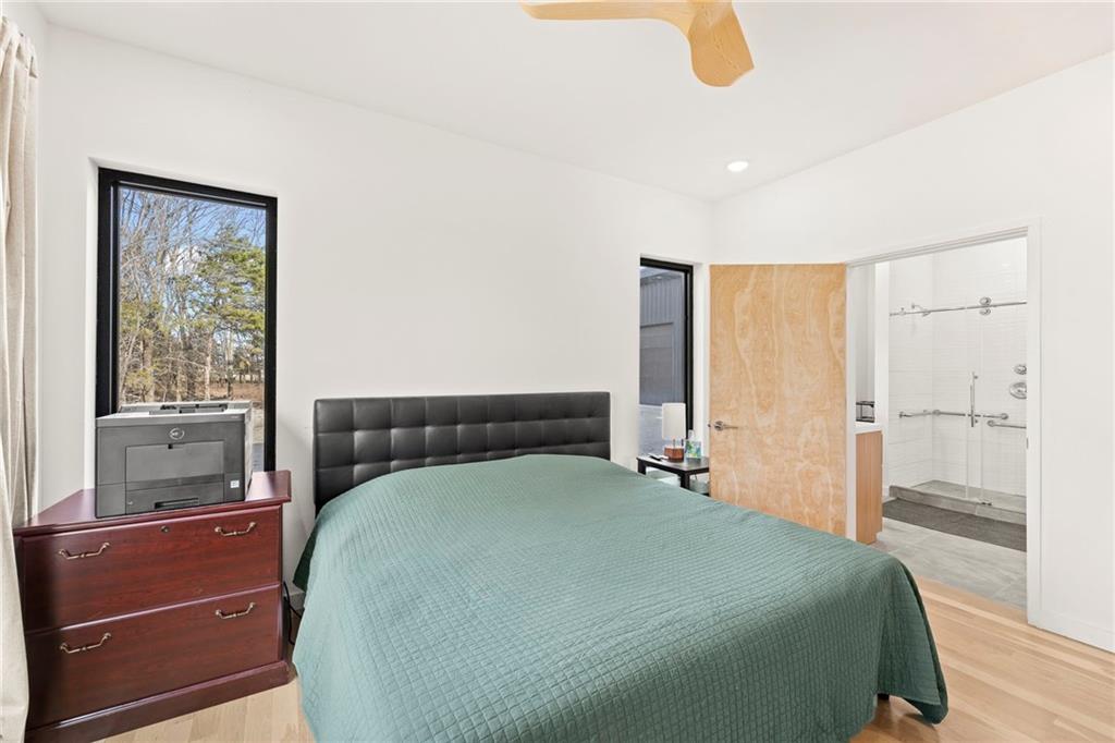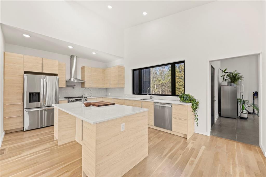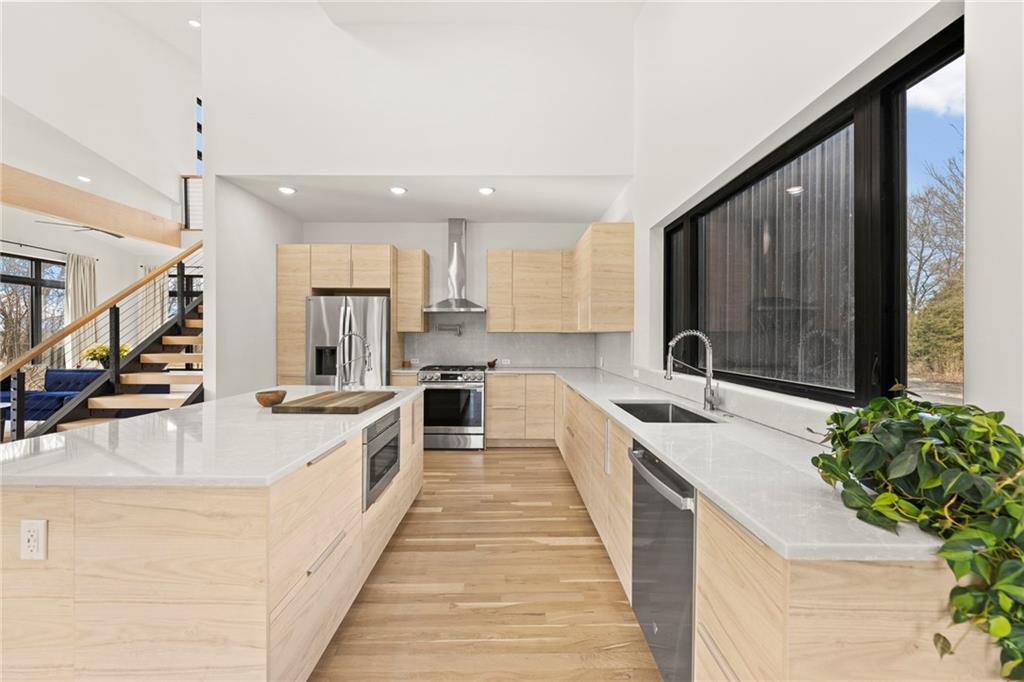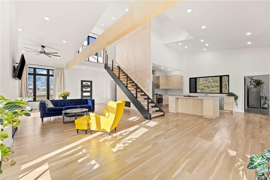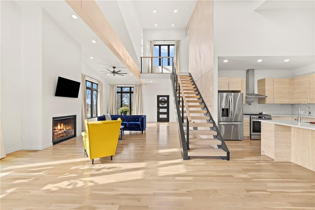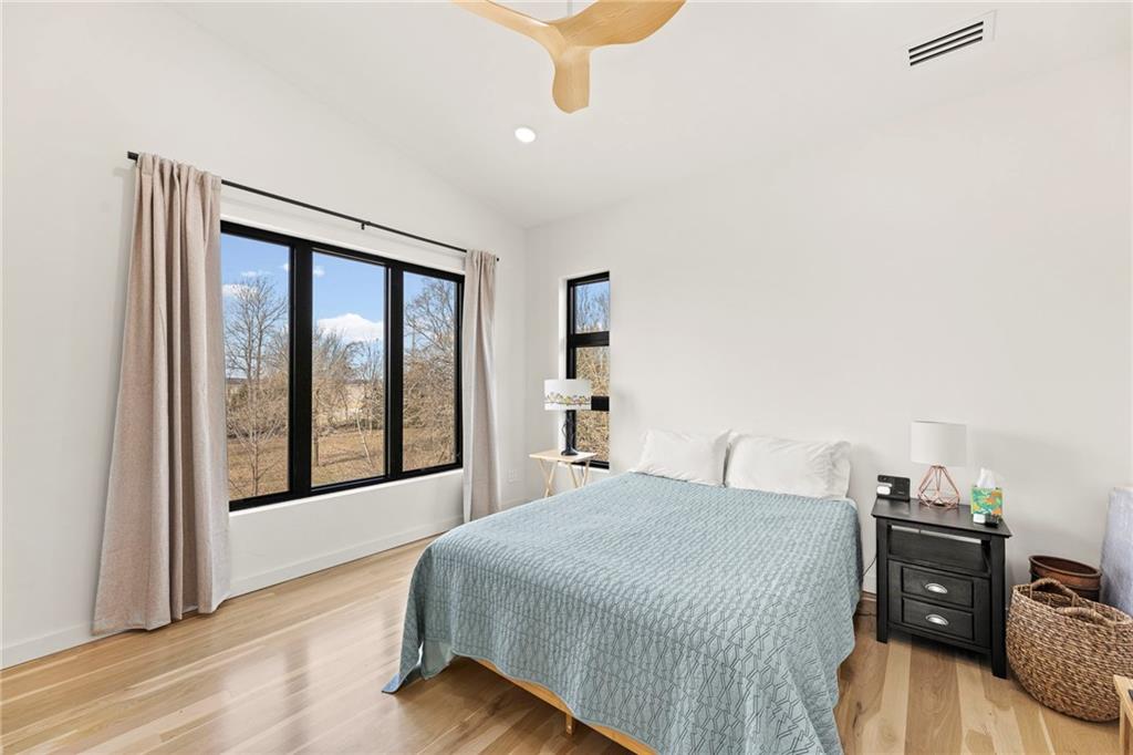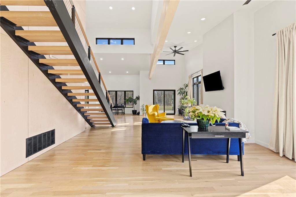 Discover a truly one-of-a-kind new construction set on 9.5 private, wooded acres, offering peaceful seclusion just 0.2 miles from the city limits on a paved road. This custom-built modern home pairs clean architectural lines with warm natural materials, creating a light-filled, open-concept design with soaring ceilings. Built for longevity and efficiency, the home features 2x12 floor joists and 2x6 exterior walls, along with expansive dual low-E Pella Impervia insulated windows that flood the interior with natural light. White oak hardwood floors extend throughout the living areas and bedrooms, complemented by a striking floating staircase with thick white oak plank steps. The thoughtfully designed layout includes three bedrooms, two and a half bathrooms, and a spacious 1,000+ sq. ft. attached two-car garage with 10-foot garage doors. Bathrooms and the large laundry/mudroom are finished with durable tile flooring for everyday practicality. At the heart of the home, the chef-ready kitchen showcases premium finishes and a large island that seamlessly connects to the dining and living spaces—ideal for both daily living and entertaining. The main-floor primary suite offers a private, serene retreat, while additional rooms flex easily as guest suites, a home office, or creative studio. Indoor-outdoor living is emphasized through access to a covered patio overlooking quiet forest views, perfect for morning coffee or relaxing evenings under the stars. Despite its private setting, the property is fully connected to city water, gas, and electrical services, blending modern convenience with acreage privacy. This exceptional property offers a rare combination of modern design, superior craftsmanship, and natural surroundings—a lifestyle opportunity seldom to be found. Schedule your private showing today.