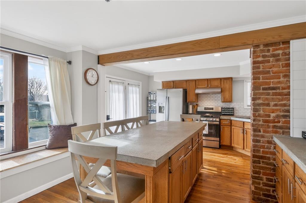 This is the kind of home that immediately feels welcoming, the kind that invites you to slow down and imagine everyday life unfolding comfortably within its walls. Built in 1922, this beautifully maintained residence blends timeless craftsmanship with thoughtful updates that make modern living easy. The front porch sets the tone, offering a perfect place for morning coffee or evening conversation. Inside, natural light fills the main living spaces, highlighting original details and warm finishes that give the home its character. The living room centers around a fireplace that anchors the space, creating a cozy gathering spot for family and friends. The kitchen is spacious and functional, offering generous counter space, classic cabinetry, and room to truly cook and connect. Adjacent dining and gathering areas flow naturally, making everyday living and entertaining feel effortless. With three bedrooms, including a main-floor primary, the layout offers flexibility for families, guests, or home office needs. The partial finished basement adds valuable bonus space, ideal for a family room, game room, or quiet retreat, along with an additional office or non-conforming bedroom option. Outdoor living is just as inviting, with a covered porch and side deck creating multiple spaces to relax or entertain. A detached two-car garage adds convenience while preserving the home’s charm. Located just minutes from Benedictine College and downtown Atchison, this home offers character, comfort, and walkable access to local dining, shopping, and campus life. It’s a home best appreciated in person, where its warmth and livability truly come to life.