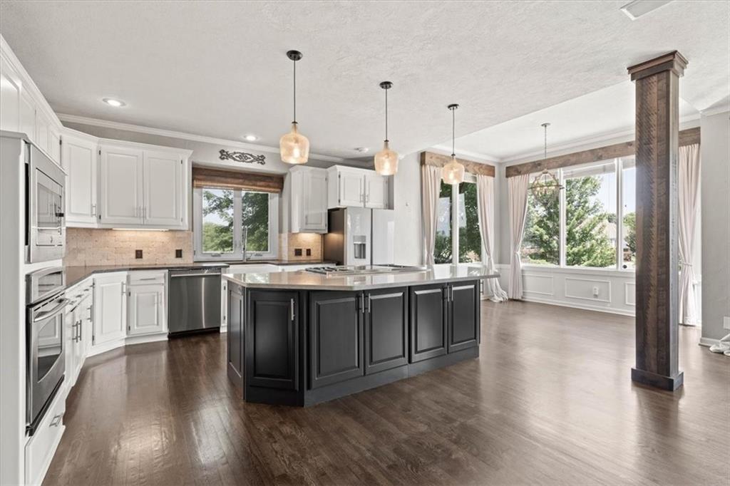 Location unlike any other in Lionsgate! This beautiful 2-story home backs to the neighborhood pool, tennis & basketball courts, playground, and overlooks the picturesque neighborhood lake—offering stunning views from the kitchen, breakfast nook, hearth room, and primary bedroom.Blue Valley's award-winning Lakewood Elementary and Middle Schools are just a safe, 10-minute walk away through quiet neighborhood streets.The kitchen is a chef’s dream with leathered granite and quartzite countertops, a custom-designed island, tile backsplash, slide-out shelving, and top-tier appliances—including a Wolf 4-burner gas cooktop with 24" griddle, Best downdraft hood, Café French-door refrigerator, and Monogram dishwasher.The cozy hearth room features a real stone fireplace with an Amish-made barn beam mantel from the 1880s. The spacious primary suite offers a gas fireplace, luxurious bath with jetted tub, double vanity, and an enormous double-sided walk-in closet.The finished basement is perfect for entertaining with a home theater featuring a drop-down screen, projection system, surround sound, and gaming hookups—ideal for family movie nights or watching big games. Plus, a hidden man-cave or she-shed with built-ins, drawers, and a workbench is tucked inside the oversized storage room.Most windows are energy-efficient, triple-pane premium Thermal King windows. An Andersen sliding glass door was recently added in the basement. The home is virtually soundproof and weatherproof. Step outside to your private backyard retreat featuring a full outdoor kitchen with natural gas grill and Brentwood countertops, a double-sided stone fireplace with water features, flagstone patio, Hot Springs Spa, and a stunning tankless waterfall for tranquil ambiance. Lush landscaping and mature trees surround the property. High-efficiency HVAC and water heaters, plus an extended home warranty through AB May, offer peace of mind. A true resort-style haven you’ll be proud to call home!