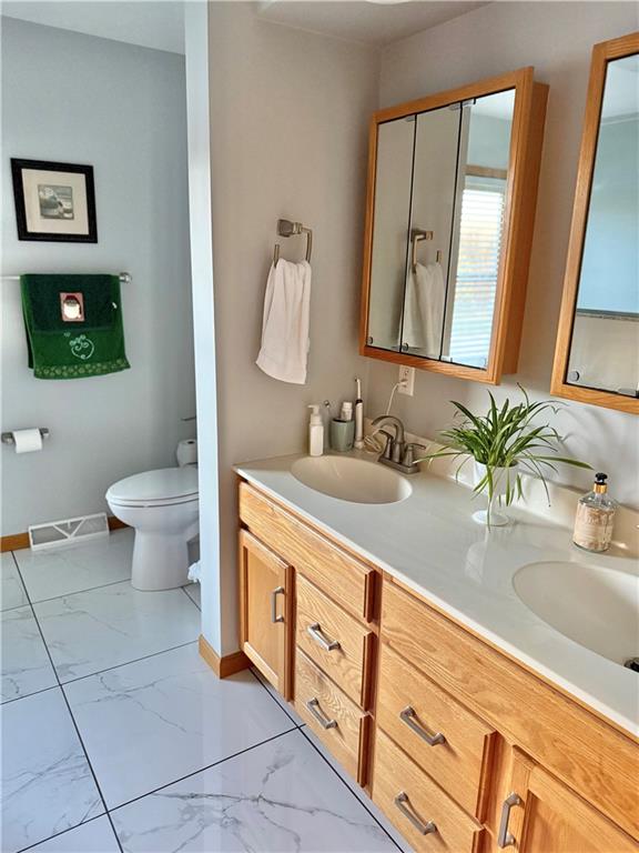 Beautifully maintained 3-bedroom, 2-bath ranch home in pristine condition, ideally situated on an oversized corner lot with peaceful views of a well-maintained pond in a desirable, well-established neighborhood. Freshly painted throughout, this home offers a perfect balance of comfort, style, and functionality. The kitchen features a center island, oversized pantry, and stainless steel appliances, with convenient access to the deck and pergola—ideal for outdoor entertaining—through the kitchen or garage. The living room is highlighted by a cozy gas fireplace complemented by custom, updated shelving. The spacious primary bedroom includes a walk-in closet, while the thoughtfully updated bathrooms provide both style and convenience. The primary bath boasts heated tile flooring, a walk-in shower, and handicap-accessible design, while the full hall bath features updated tile flooring. Additional highlights include a main-floor laundry room conveniently located off the garage and a clean, unfinished basement offering endless opportunities to design the space of your dreams. This move-in-ready home offers serene views, quality updates, and outstanding potential in a fantastic neighborhood—ready for its next owner to enjoy. Included personal property: shed (2022), dishwasher (Dec 2022), Kenmore washer and dryer (2022), refrigerator, stove, microwave, and mounted TVs in the living room and primary bedroom. Recent updates include a new garbage disposal (Feb 2023), water heater (Feb 2023), and fully renovated bathrooms (Feb 2023).