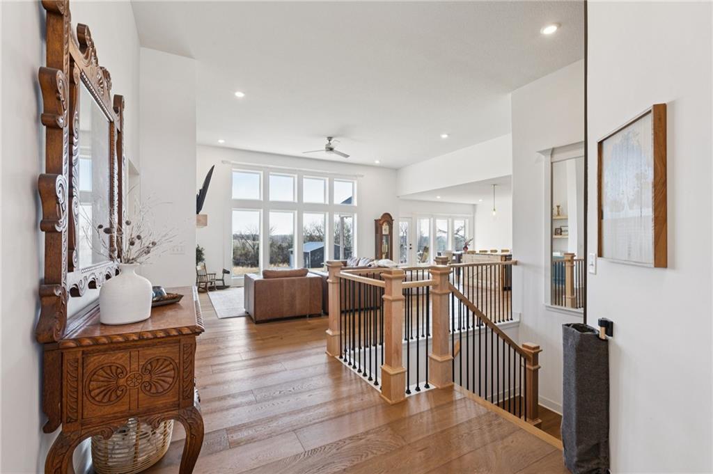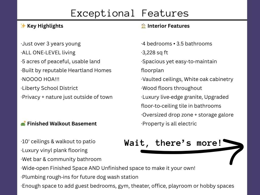 Stop the Car! *** Just over 3 years young *** ALL ONE LEVEL living *** 5 acres *** Liberty! Built by reputable Heartland Homes: perfect blend of modern luxury, peaceful acreage, and everyday convenience with — NOOOO HOA!!! Thoughtful upgrades throughout. 5 acres JUST outside of town, get the privacy and nature without sacrificing quick access to amenities. 4 bedrooms, 3.5 baths, and 3,228 sq ft—a floorplan that’s spacious enough to live comfortably yet easy to maintain. The craftsmanship shines from the moment you walk in with so many upgrades: vaulted ceilings, white oak cabinetry, wood floors throughout, and luxury live edge granite, upgraded floor to ceiling tile in the bathrooms just to name a few. Keep the home clutter free with oversized drop zone & storage galore. The finished walkout basement is a dream space beyond the 2 bedrooms — the rec area is wide open with 10' ceilings, luxury vinyl plank flooring, a wet bar, and endless flexibility. Add bedrooms, create a home gym, design a theater. The possibilities are wide open with the finished AND unfinished space. In fact, plumbing rough-in's already installed for a future dog wash station. Impressive Outdoor living with composite covered deck, a 15' extended patio also partially covered, and plenty of room to add a future pool thanks to lateral lines thoughtfully placed to the south side. The property includes two tax parcels under one legal description, giving you the option to designate one as agricultural if desired. Property is all electric. A huge bonus: the 30' x 50' outbuilding with concrete floors—perfect for equipment, hobbies, vehicles, or a workshop. Has 3 overhead doors (two on north and one on east). Located in the sought after Liberty School District, this home offers the rare combination of acreage, upgrades, convenience, and freedom. And yes… no HOA!!!
