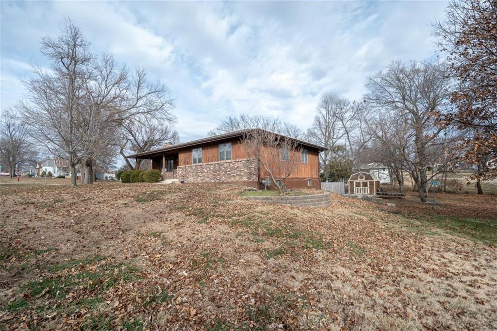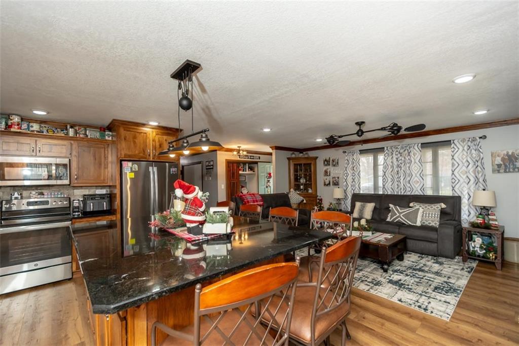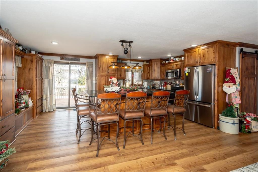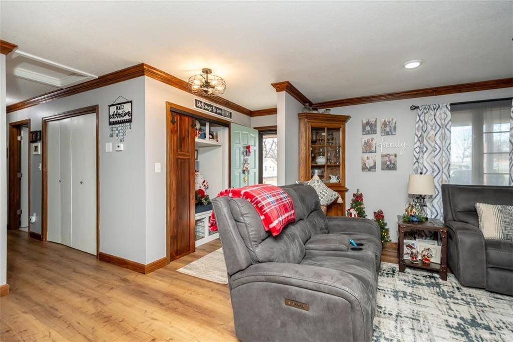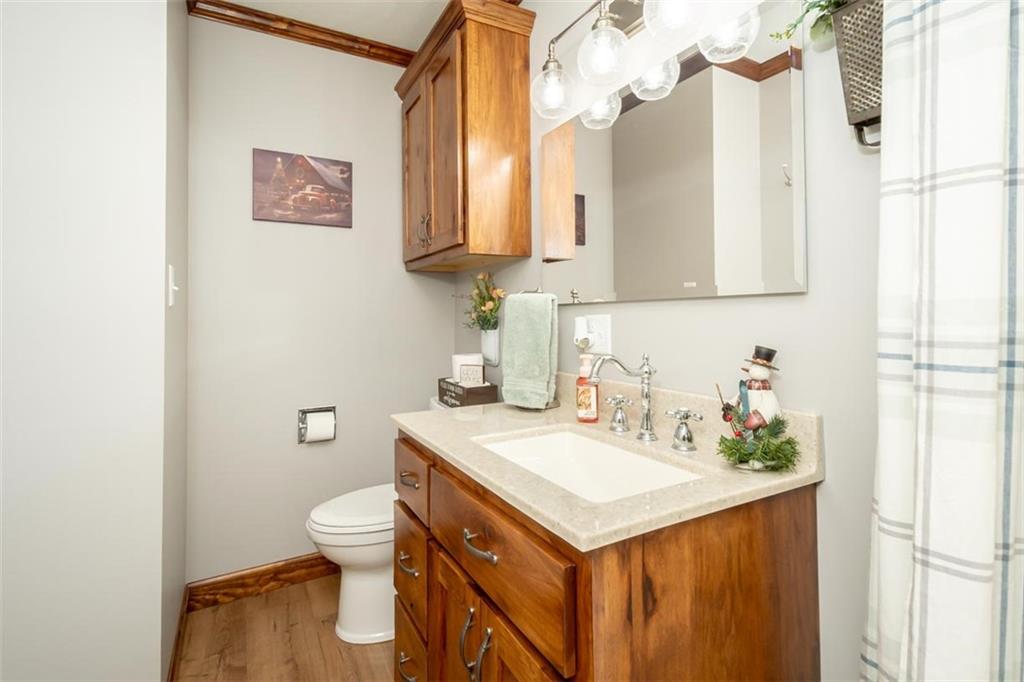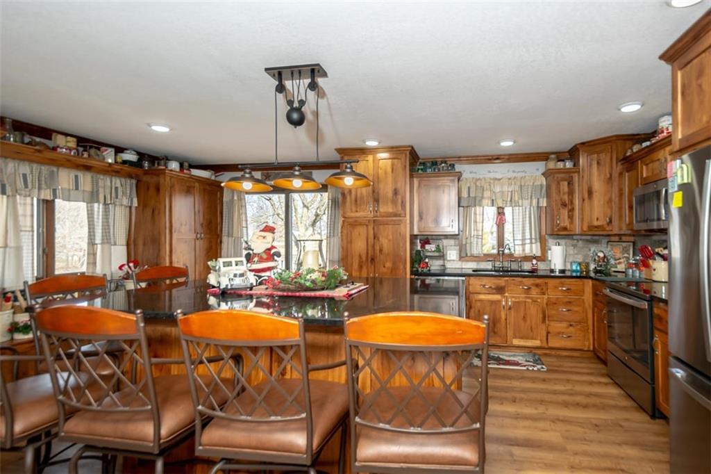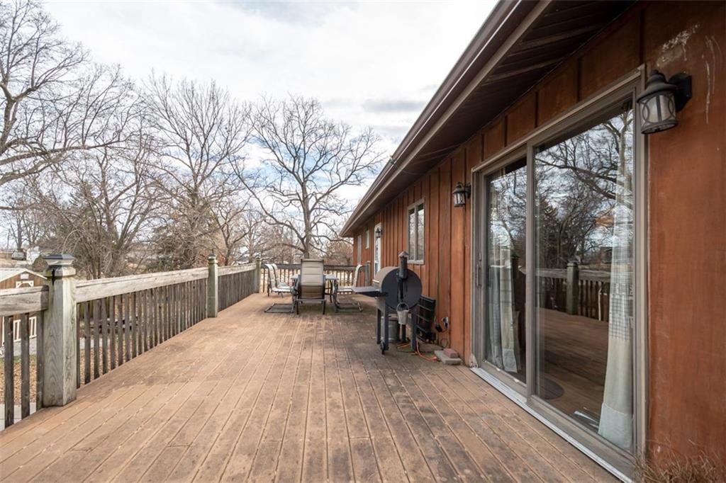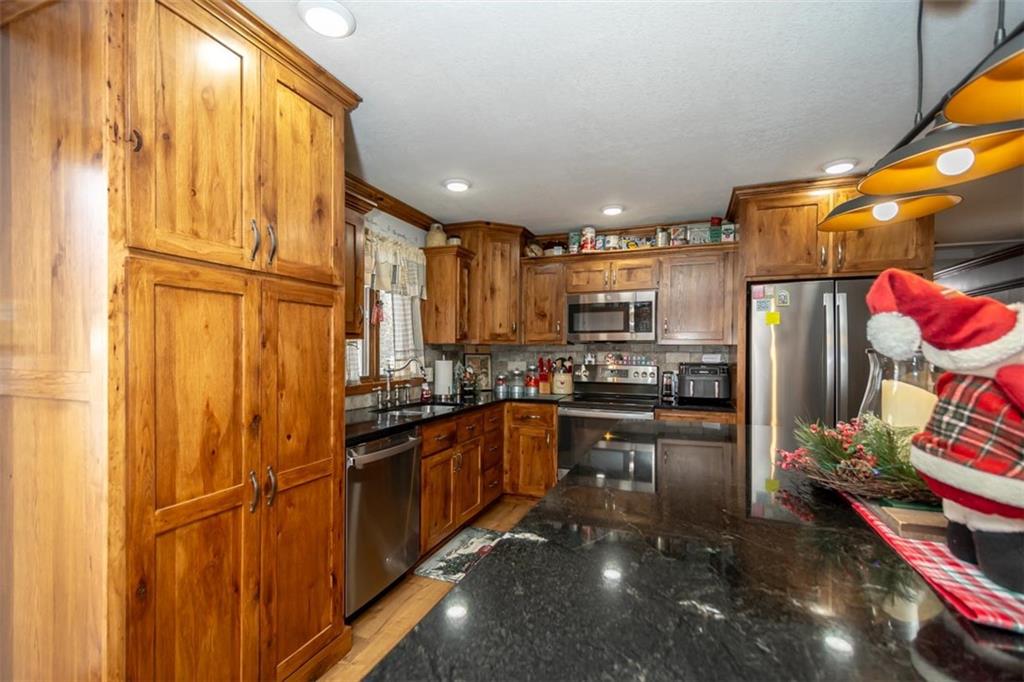 Welcome home to this gorgeous, well-maintained ranch-style property situated on a picturesque 1.02-acre corner lot with mature trees and room to breathe. This inviting home offers three bedrooms on the main level, including a primary suite with an attached full bath, plus an additional full bathroom for guests. The heart of the home features an open-concept kitchen and dining area with beautiful custom knotty pine cabinetry, thoughtful built-ins for extra storage, and an eat-in layout perfect for everyday living. Cozy up in the living room by the gas fireplace, or step out onto the large deck just off the kitchen, ideal for entertaining and enjoying peaceful outdoor views. Convenience is key with main-level laundry, while the finished basement adds even more space with a non-conforming bedroom, family/rec room, and a two-car garage. Outdoors, you’ll love the new concrete steps, sidewalks, patio, and gutters, along with a charming privacy-fenced patio designed for relaxing and hosting. A small shed provides extra storage, and there’s plenty of room for additional parking. Located in a quaint community with easy highway access, this home blends comfort, space, and functionality—ready for its next owner to enjoy.