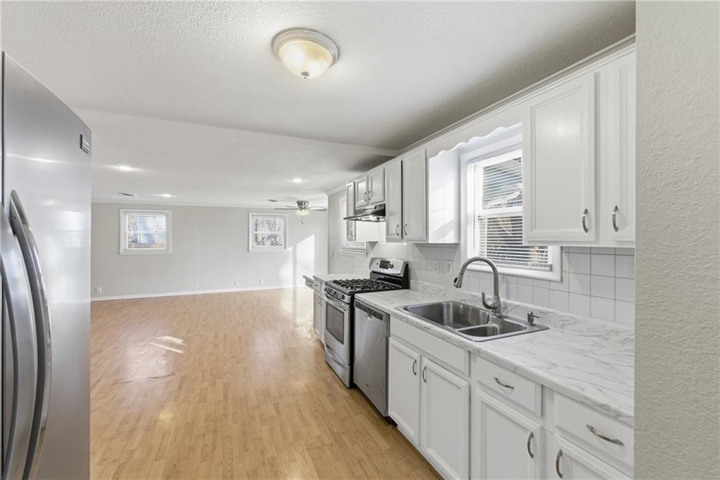 Fully remodeled home on a rare ½-acre lot! This 3 bedroom, 2 bathroom property features a finished basement offering flexible living space for a second living area, guest suite, or home office. Updated kitchen with white cabinetry, stainless steel appliances, modern finishes, and fresh flooring throughout. Spacious yard with mature trees—perfect for entertaining or future expansion. Move-in ready with easy access to shopping, dining, and highways.