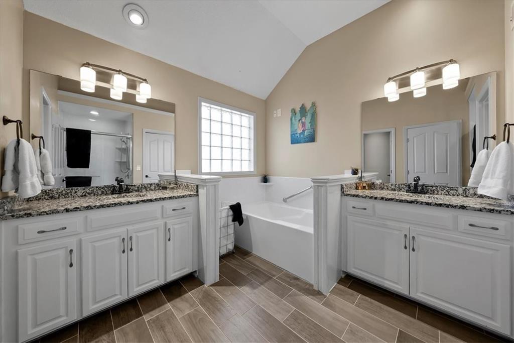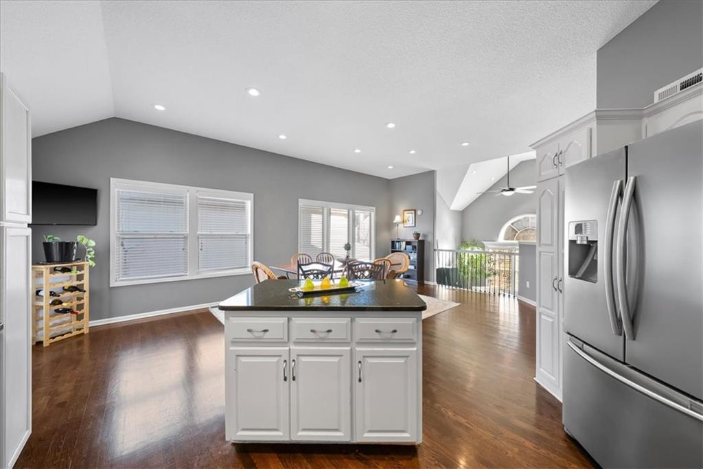 Welcome to this beautifully maintained atrium split, offering the perfect blend of modern updates, generous space, and everyday comfort. Step into the vaulted main level, where abundant natural light fills the open kitchen, dining, and living areas—ideal for both everyday living and effortless entertaining. The updated kitchen features crisp white cabinetry, stainless steel appliances, ample counter space, and a central island that truly serves as the heart of the home. The spacious dining area seamlessly adjoins the kitchen, creating a welcoming space for gatherings large and small. The primary suite is a true retreat, highlighted by abundant natural light, a second fireplace, and an upgraded en-suite bath with a separate tub and shower, double vanity, and a generous walk-in closet. With multiple living areas, this home offers plenty of room to spread out. The walk-out lower level boasts a large recreation room with a third fireplace, access to a fourth bedroom and third full bath, and direct access to the patio—perfect for guests, extended family, or multi-generational living. Outdoors, enjoy a large backyard featuring a deck just off the kitchen and an open patio below the walk-out level, ideal for relaxing or entertaining. This home delivers the space, style, and thoughtful updates today’s buyers are looking for—don’t miss the opportunity to make it yours.
