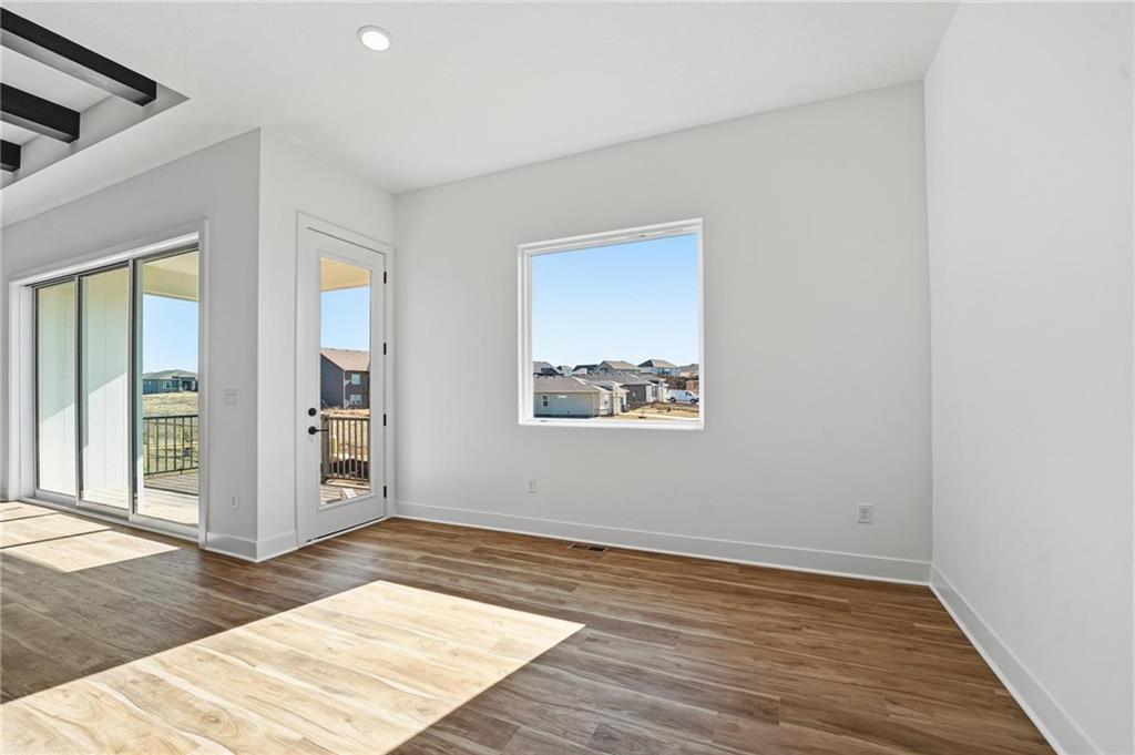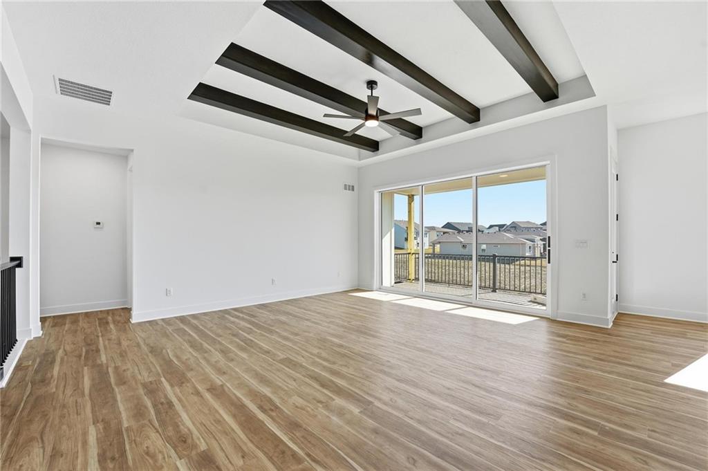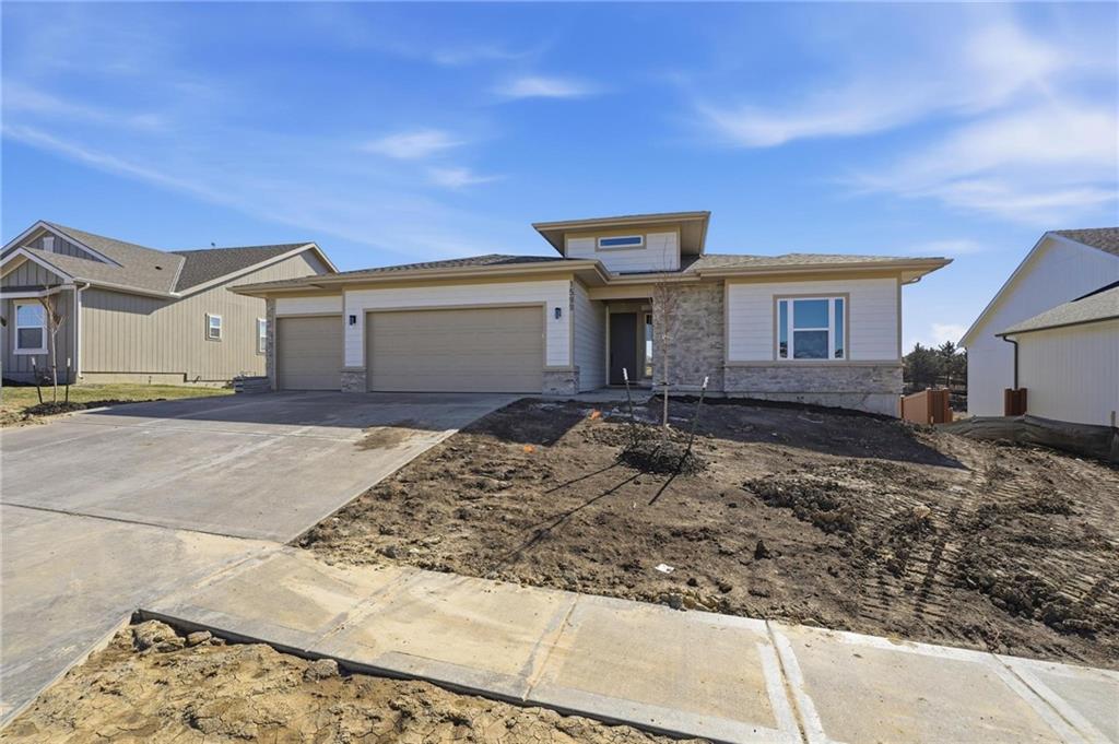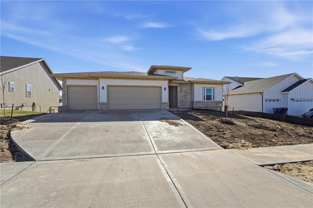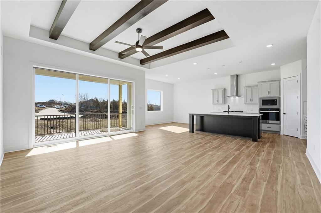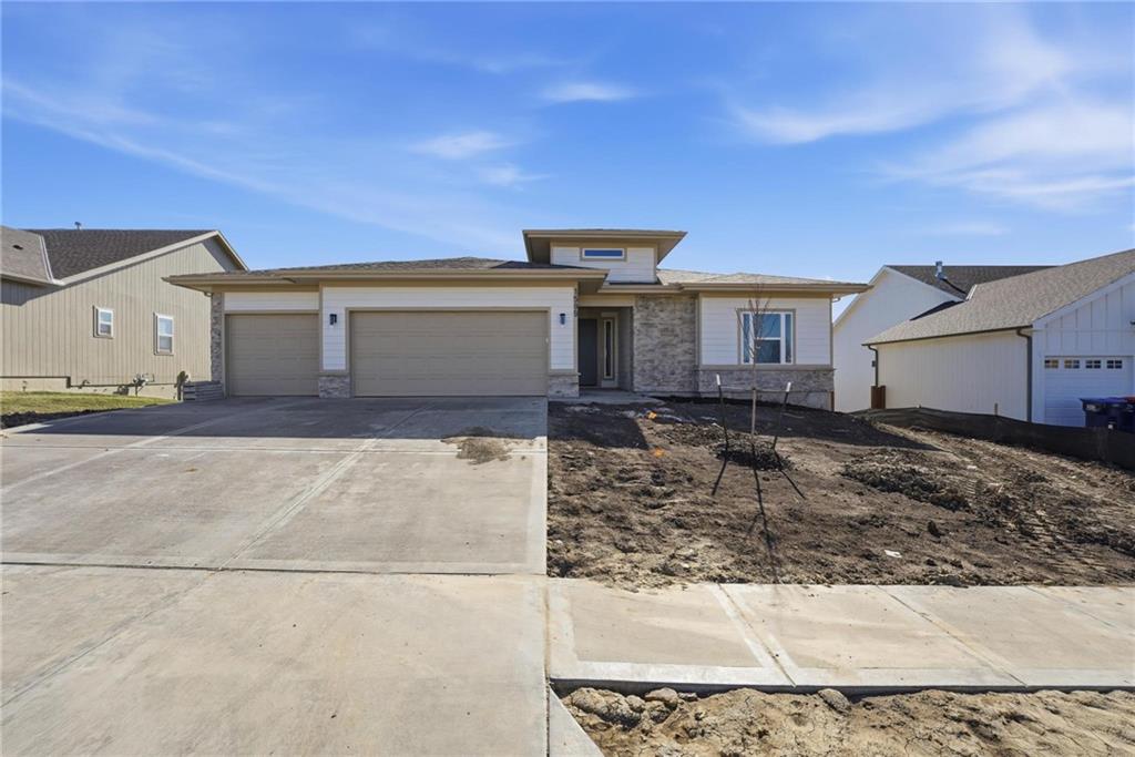 WOW! The stunning Thomas floorplan by Hakes Brothers delivers model quality upgrades and show stopping design throughout. A true highlight of the great room is the expansive 12 inch wide, 8 foot tall, three panel stacking glass door system. These panels slide completely open and tuck away, creating a seamless transition between indoor and outdoor living! perfect for hosting gatherings, enjoying fresh air, and extending your entertaining space with ease. Paired with dramatic wood beams overhead, the space feels both grand and inviting. The main level features 8foot doors throughout, enhancing the home’s open, airy feel. The gourmet kitchen is a standout, showcasing built in stainless steel appliances including a gas cooktop, oven, and microwave. The fully finished basement adds a versatile bedroom and full bathroom, creating the perfect space for movie nights, Sunday football, or entertaining friends and family, truly an entertainer’s dream! Nestled in the highly sought after Grayhawk at Prairie Gardens community, enjoy resort style amenities including a sparkling pool, playground, and open green spaces. Conveniently located just minutes from The Legends shopping, dining, and entertainment, with easy access to K-7, major highways, and only about 30 minutes to Kansas City International Airport. Top-rated schools, vibrant surroundings, and endless conveniences make this home a must see. Home is Ready!