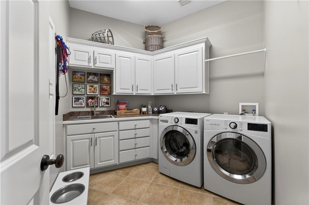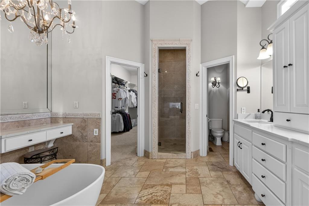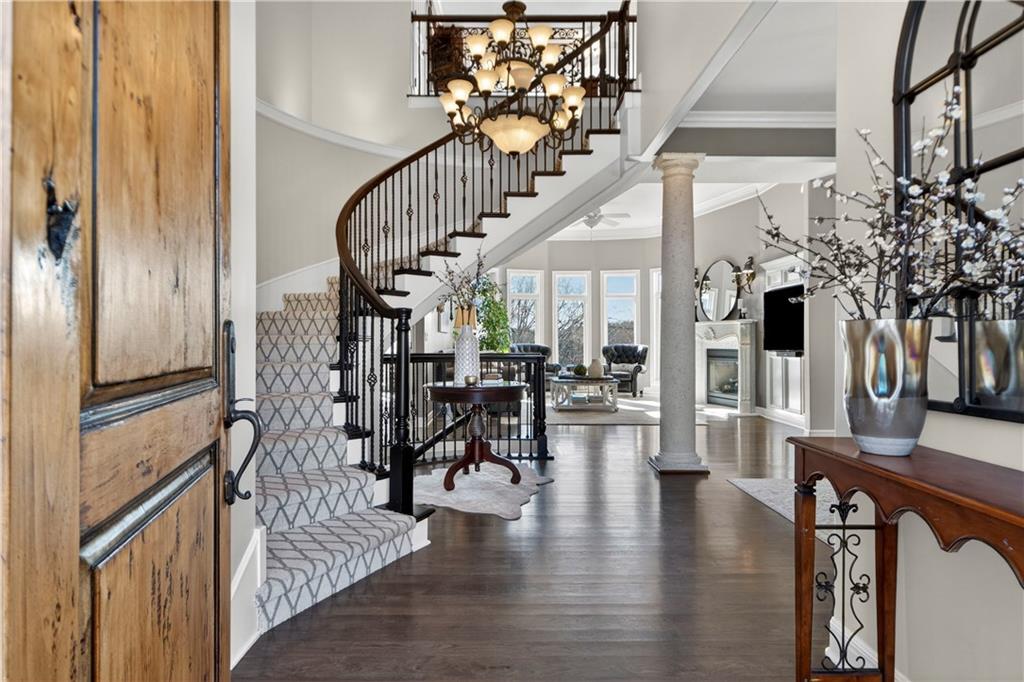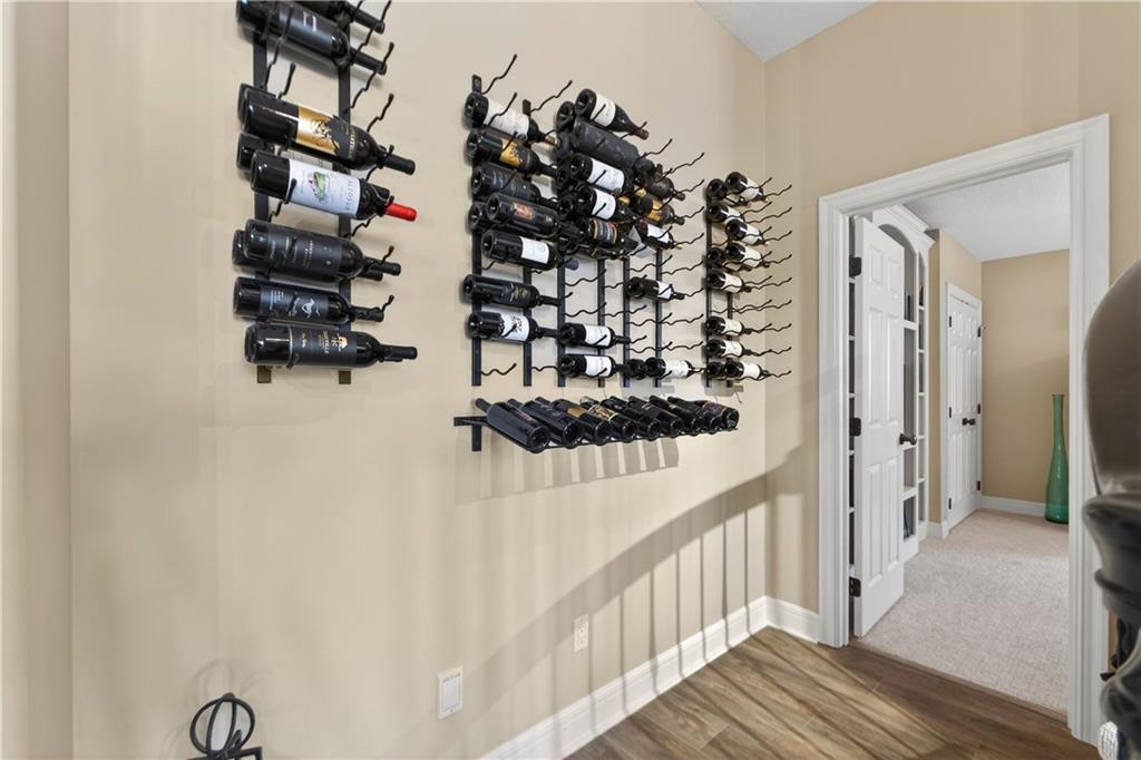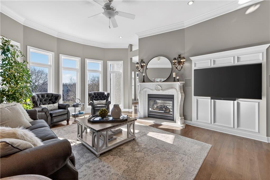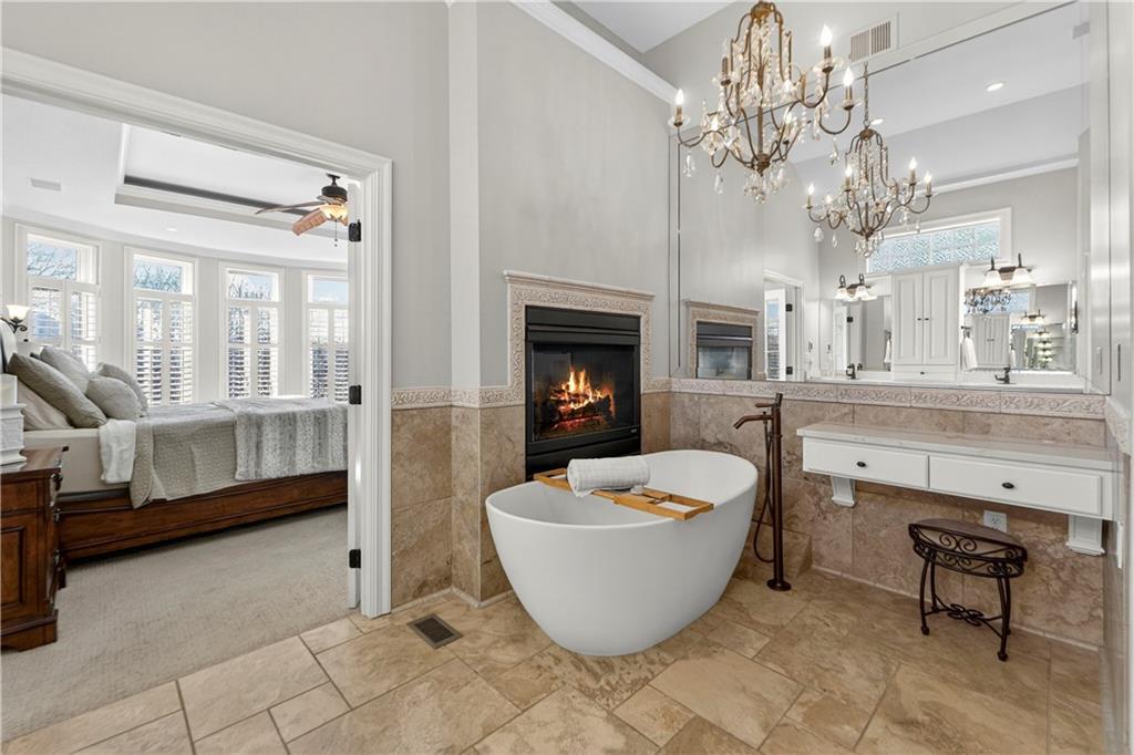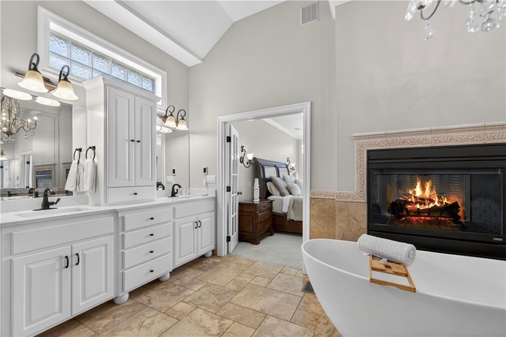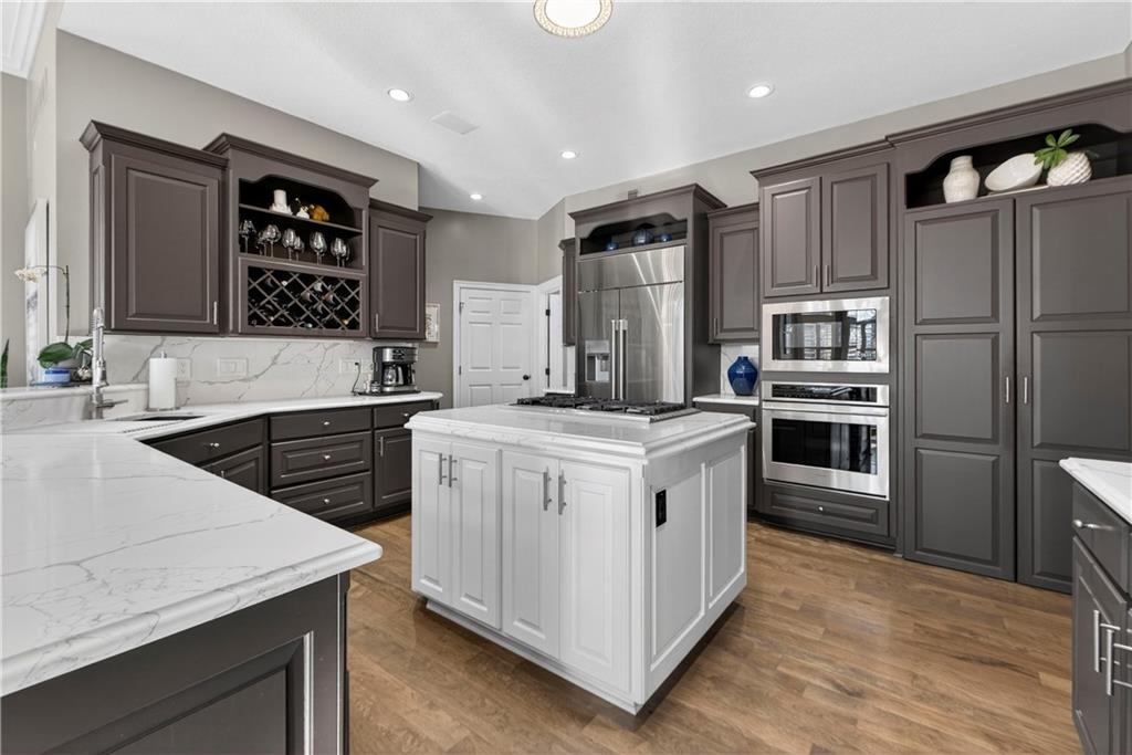 Nestled on a .56-acre treed corner lot in the prestigious Falcon Ridge community, this extensively updated home offers 4,598 sq ft of refined, functional living space. Notable features include a freshly painted exterior, circle drive, arched covered entry with custom door, 4-car garage with radiant heated floors, and a 50-year tile roof. The main level showcases new walnut hardwood floors, fresh interior paint, soaring ceilings, and abundant natural light. Formal living and dining rooms are anchored by a see-through gas fireplace and walls of windows overlooking the private backyard, while the hearth room flows seamlessly into the kitchen. The remodeled kitchen features new custom cabinetry, quartz countertops, a large island, walk in pantry, and high-end Monogram appliances, including a gas range, wall oven/microwave, dishwasher, and Dacor refrigerator. Just off the kitchen, access the brand-new Trex deck, perfectly positioned to enjoy the wooded views and outdoor entertaining. The main-level primary suite offers vaulted ceilings, plantation shutters, a see-through fireplace, and a spa-inspired bath with new cabinetry, quartz countertops, freestanding tub, walk-in shower, and expansive custom closet. Upstairs includes a private office with built-ins and half bath, along with unfinished attic space for storage or future expansion. The walk-out lower level is designed for entertaining with a new rec room featuring built-in projector and surround sound, wet bar with wine and beverage refrigerators, three additional bedrooms, a Jack & Jill bath, a private ensuite, and a non-conforming fourth bedroom ideal for a gym or office. Outdoor living continues to the patio with a gas-plumbed firepit and newly planted trees for added privacy. Additional highlights include zoned heating and cooling, new AC, 75-gallon water heater, and extensive recent updates throughout, making this Falcon Ridge home truly move-in ready.