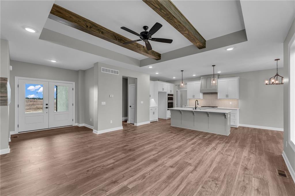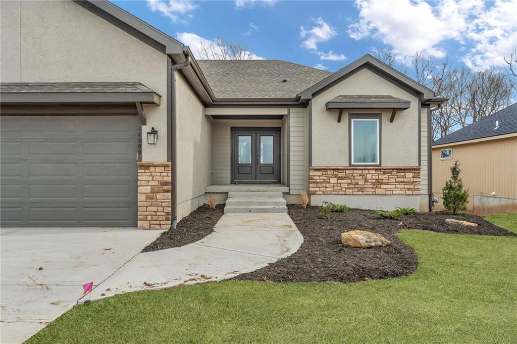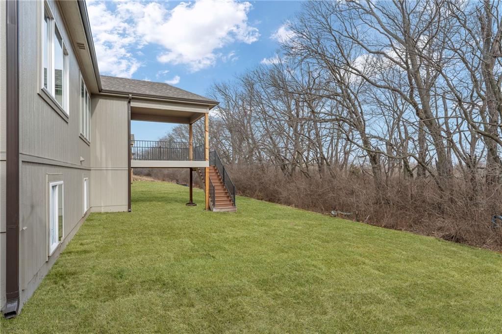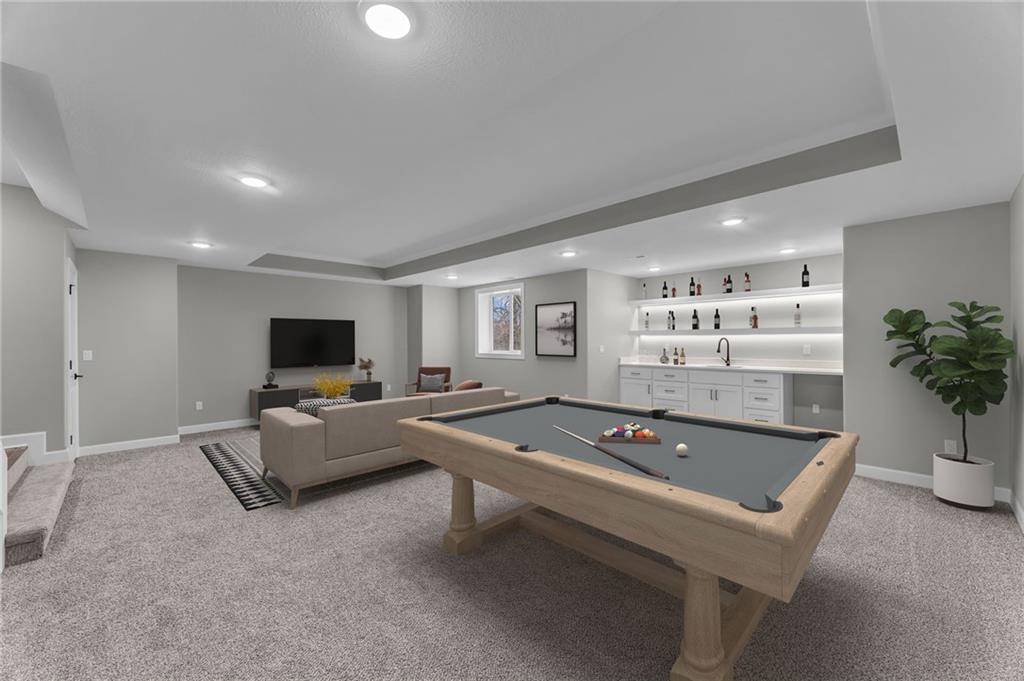 The Bridgeport II floorplan built by Drippé Homes. Open concept daylight basement with tons of natural light! Rustic ceiling beams, stucco front, and gorgeous built ins. Kitchen furnished with stainless appliances, gas cooktop, hood vent, microwave, wall oven, quartz countertops, large island with oversized sink and spacious butlers pantry. Two bedrooms on main with primary opposite other bedroom. Ensuite features double vanity, tiled walk-in shower, private water closet and gigantic closet with pass through to laundry. Mudroom off garage with boot bench. Finished basement with two additional bedrooms and rec room complete with wet bar, ready for hosting the next big game. Cozy up to the fireplace in the living room or enjoy the sunrise from the covered composite deck. Home backs to tree-line providing ultimate privacy with sod and sprinkler system included. Unfinished basement storage, built-ins and three car garage provide plenty of storage. Almost ready for your personal touch - schedule a showing today!