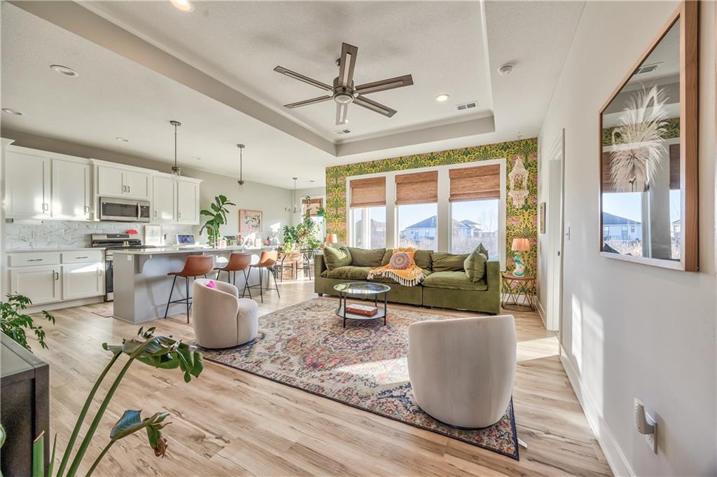 Enjoy true, one-level living with a smart, open-concept layout on a slab. The Great Room flows seamlessly into the kitchen with island and dining area, creating an easy, functional space for everyday living. The spacious primary suite features a private bath with double vanity and a large walk-in closet, while two additional bedrooms are conveniently located on the main level. Enjoy recent updates including landscaping, an insulated garage door and a fully fenced backyard backing to greenspace for added privacy. Located in a vibrant, growing neighborhood with exceptional amenities including a resort-style pool with waterslide, pickleball courts, playground, and scenic walking trails. Priced below other homes in the community—many still under construction—this is a fantastic opportunity to get into a sought-after neighborhood at an unbeatable value. Convenient highway access makes commuting a breeze.