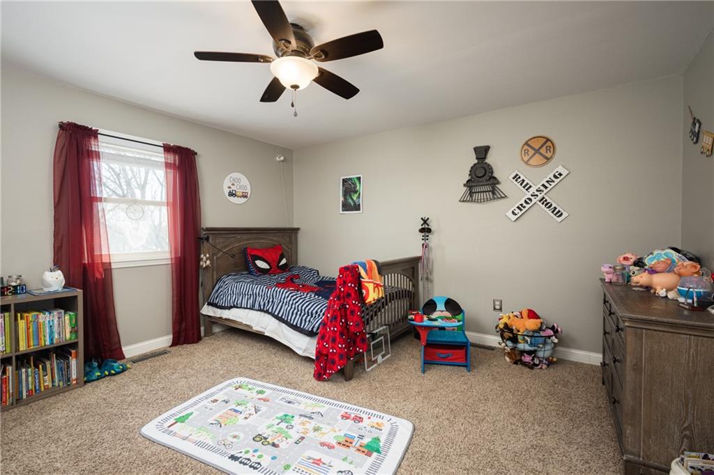 Enjoy peaceful country living on 15 wooded acres at 1275 SW 125th Rd in Holden, MO. This property offers the perfect blend of open space and wooded privacy, creating a secluded, serene setting surrounded by mature trees. The land features a pond, a barn, and wide-open areas ideal for recreation, livestock, or future expansion. Inside, the seller has updated the flooring throughout and completed numerous upgrades that add both comfort and long-term value. Upgrades include: new light fixtures, ceiling fans, switches, and outlets throughout; new baseboards; new front door; many new interior doors; new water heater (Aug 2025); new roof (May 2025); new gas furnace and A/C condenser (Oct 2020); and the outdoor waterfall/water feature restored (June 2023). Seller installed sump pump in 2024 and foundation work completed as well with cable/concrete piering along the east and north side of home with a lifetime warranty. The home offers a functional layout filled with natural light, including a top-floor primary suite with private balcony overlooking the property—a perfect retreat with peaceful views of the acreage and woods. With privacy, 15 acres, a pond, a barn, and major system updates, this property delivers the true Missouri country lifestyle. Schedule your private showing today — opportunities like this are rare. Contact agent to discuss financing assistance or loan options.
