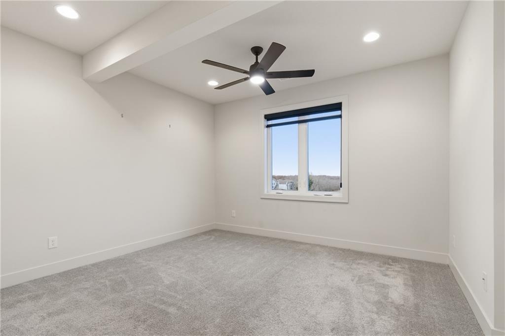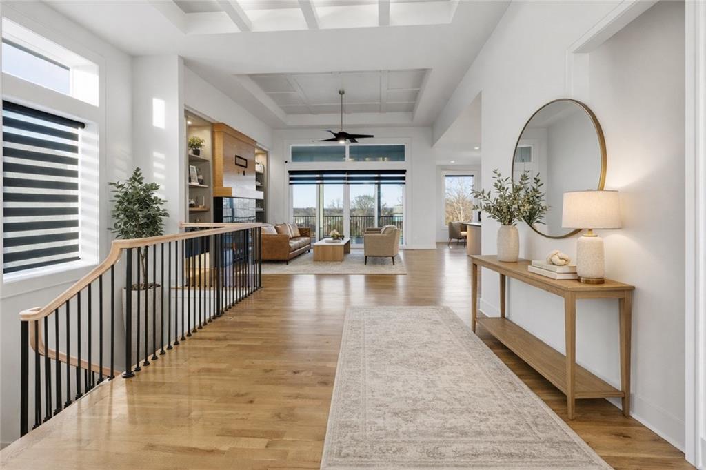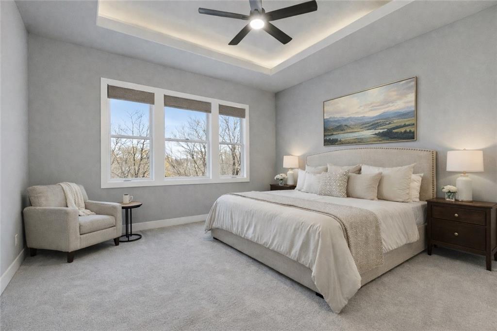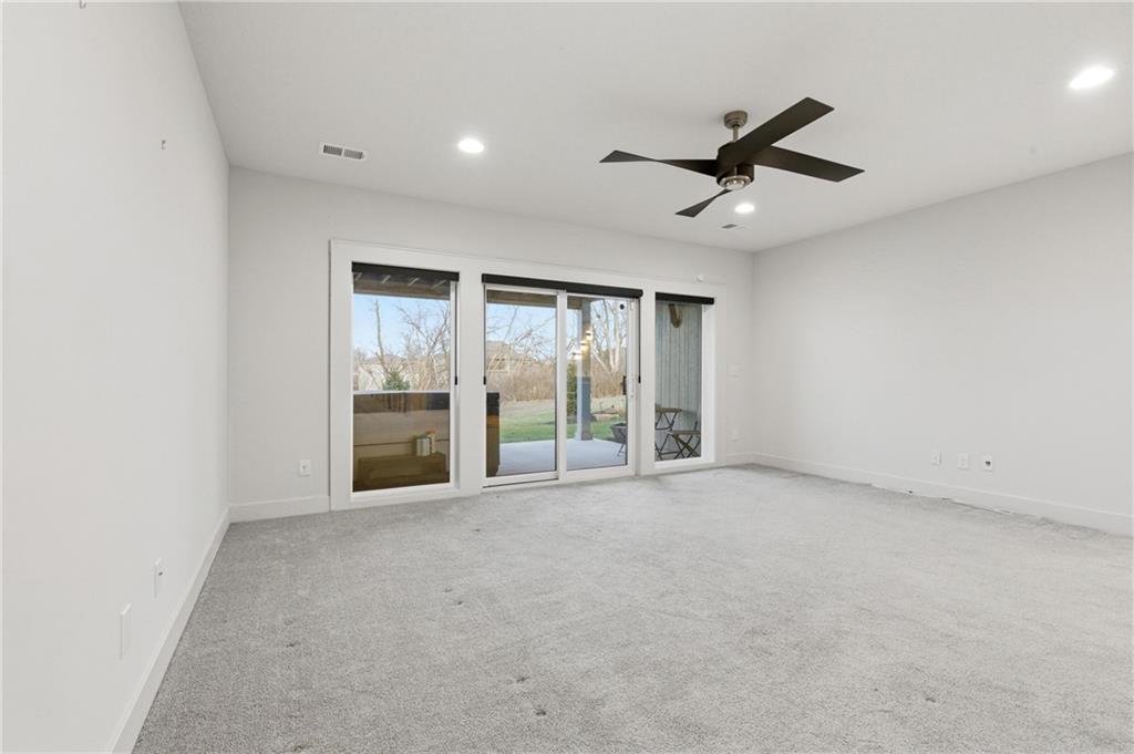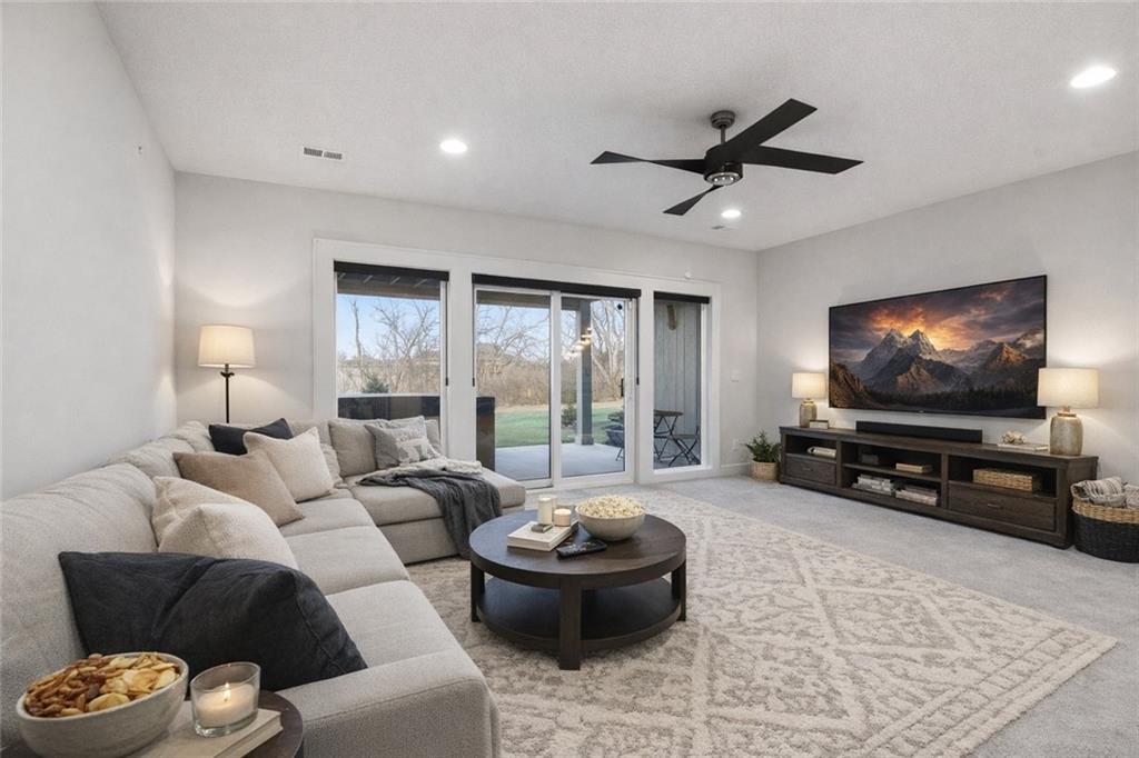 Built in late 2022 by the esteemed Don Julian Builders, this beautifully designed Reverse 1.5 story home is tucked within the premier Bristol Highlands Villas—where maintenance-provided living meets the peace and privacy of rolling hills and protected green space. Just minutes from Shawnee Mission Park, scenic trails and lakes, Lenexa City Center, dining, shopping, De Soto schools, and highway access—yet perfectly secluded—this home truly offers the best of both worlds. Thoughtfully designed for main-level living, the primary suite is a private retreat featuring separate vanities, luxurious soaking tub, walk-in shower with bench, and a spacious walk-in closet with direct access to the laundry room . A stylish powder room for guests and a dedicated office with double doors add both function and flexibility upstairs. The great room features custom built-ins, gas fireplace, and a seamless flow to the covered + screened deck overlooking tranquil green space with privacy! The kitchen—designed for entertaining and everyday living, showcases an oversized island with storage and seating, custom cabinetry to ceiling, quartz, and walk-in pantry. All SS appliances stay, including a newer KitchenAid dishwasher and high-end KitchenAid refrigerator! The walkout lower level is ideal for guests and gatherings, featuring a chic wet bar with beverage fridge, built-in microwave, and island. A cozy family room with slider access to the covered patio is perfect for movie night. One bedroom enjoys easy access to a full hall bath, while 2 additional bedrooms share a Jack-and-Jill bathroom with tub—perfect for hosting family & visitors. Features include high-efficiency HVAC, Lennox smart thermostat, ADT security, automatic privacy screens for the patio and deck, automatic blinds throughout, hardwood floors, and a coveted location backing to community green space. Low-maintenance living. High-end finishes. Don’t let this one pass you by—homes like this are truly special.