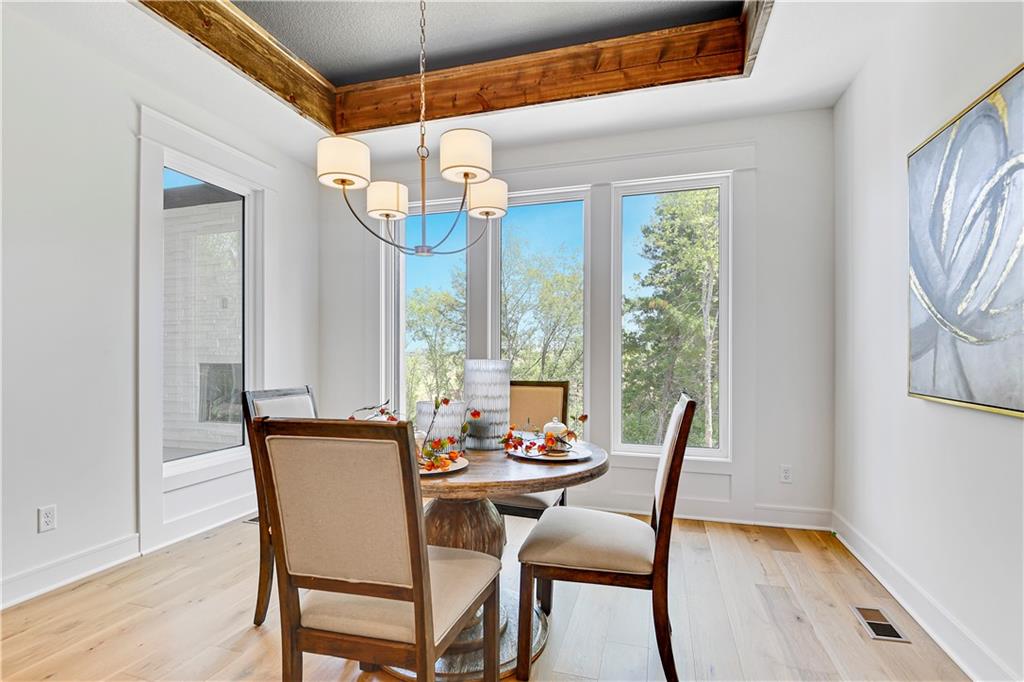 Experience refined luxury in The Bayberry by JFE Construction, a stunning villa designed for elevated everyday living. An impressive 8-foot double front door opens to soaring ceilings, dramatic wood beams, and expansive walls of windows that flood the great room with natural light. Oversized sliding doors lead to a covered deck with a stone fireplace, perfectly positioned to overlook tranquil greenspace—ideal for both relaxing evenings and effortless entertaining. The designer kitchen is as functional as it is beautiful, featuring a large quartz island, stainless steel appliances, rich wood flooring, and an oversized walk-in butler’s pantry. The primary suite offers a private retreat with a freestanding soaking tub, double vanity, zero-entry shower, and a spacious walk-in closet. A second main-level bedroom or office provides flexible living options. The finished lower level expands the home’s versatility with a family room, bar area, game space, two additional bedrooms, and a full bath—perfect for hosting guests. Throughout the home, exquisite trim work, wood accent walls, bold black accents, and thoughtful architectural details elevate every space. Located in Canyon Creek Forest, a luxury maintenance-provided, free-standing villa community, this home offers a carefree lifestyle with lawn care and snow removal included—while enjoying all that Lenexa has to offer. Estimated completion is June 2026, with time remaining to make select design choices and personalize this exceptional home. Photos are of a former model and may include upgrades not included in the price. Don't miss out on this one. It is going to be a stunner!!