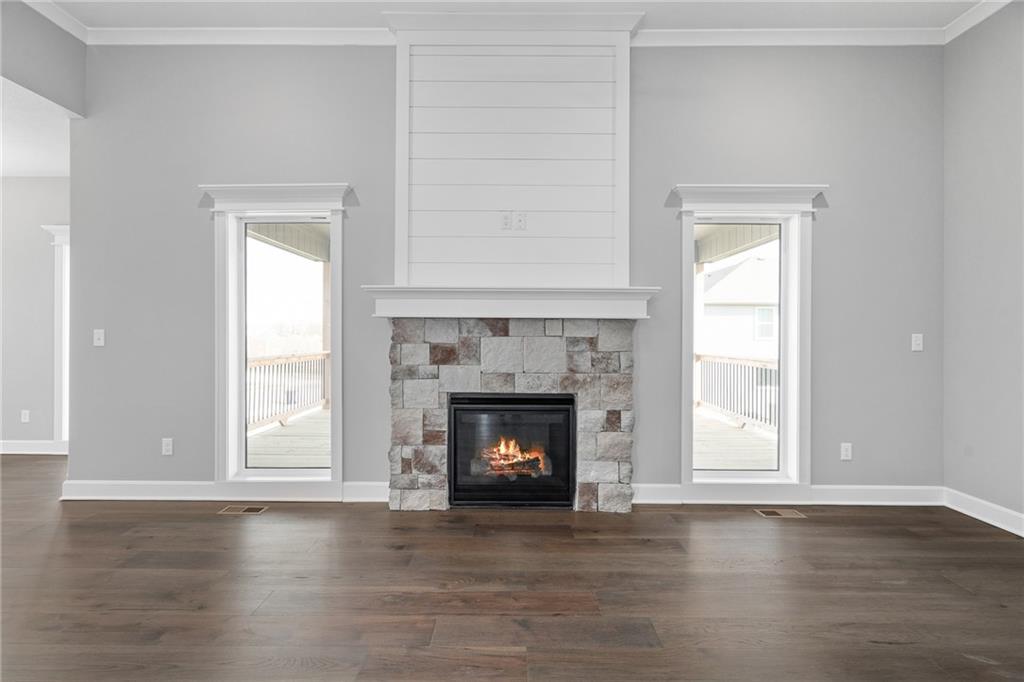 Welcome to Sara’s Meadow, an exciting new subdivision and home to The Drake by Hoffmann Custom Homes — a beautifully designed Reverse 1.5 Story that blends warmth, modern style, and smart construction. From the moment you walk in, this home is filled with natural light, soaring ceilings, and refined finishes throughout. The main level features gorgeous dark colored engineered hardwood floors and a chef-inspired kitchen showcasing light, light granite countertops, dark hardware, a gas cooktop and wall oven, enameled cabinetry, and under-cabinet lighting that makes the space shine — perfect for those who love to entertain! The great room is anchored by an eye-catching gray stone fireplace with enameled wood trim accents and opens seamlessly to the covered deck, ideal for relaxing. The main-level owner’s suite truly feels like a private retreat with a freestanding soaker tub, double vanities, and a generous walk-in closet. A second bedroom on the main floor makes the perfect nursery, home office, or guest space, along with a full bath and a conveniently located laundry room. Downstairs, the finished walkout lower level adds even more space with two additional bedrooms, a full bath, and a spacious rec room complete with a granite wet bar — plus walkout access to a covered patio and an oversized backyard that feels both peaceful and private. Thoughtfully engineered for modern living, this home includes 2x6 exterior wall construction, is prewired for solar panels, offers EV charger compatibility, energy-saving features, and comes backed by a 10-year structural warranty. If you’ve been waiting for the perfect blend of style, quality, luxury, comfort, and location — you need to come experience “The Drake” in Sara’s Meadow. This one is a showstopper!