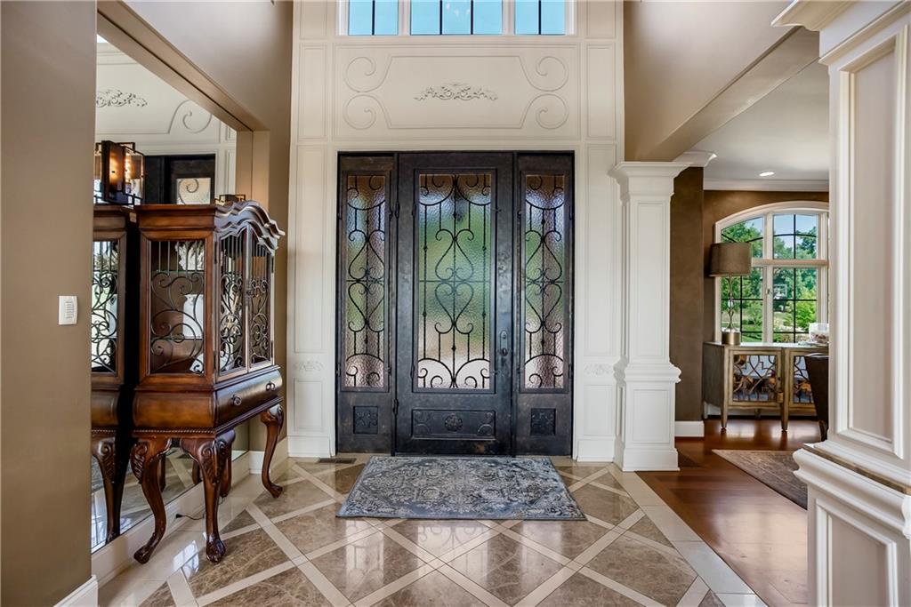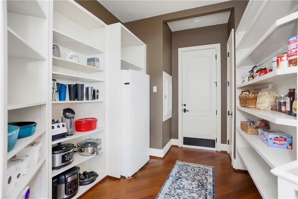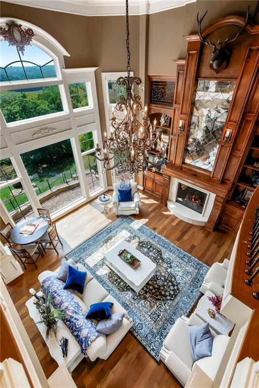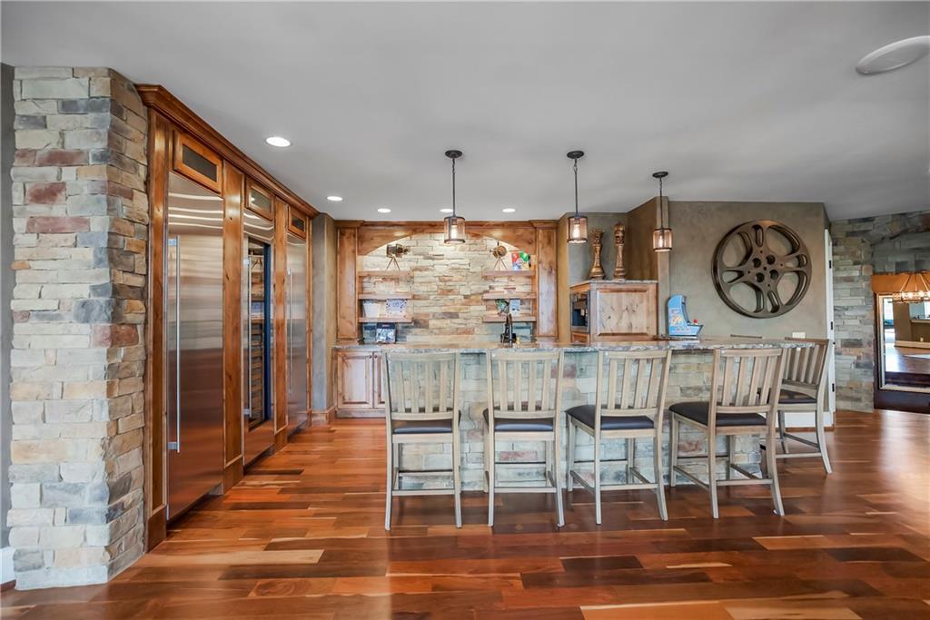 Incomparable custom home designed by Scott Bickford & meticulously built by Charles Kraft. Spectacular views of Shadow Lake & long vista's overlooking the Cedar Creek valley! Recent updates include a completely modernized theater room, new light fixtures & electronics. This phenomenal 5 level property features extensive Brazilian cherry hardwood floors & extensive heated floors as well! Main floor includes a stunning 2-sty Great rm. w/FP, formal dining, Den w/FP, spacious guest suite & casual dining. Dream kitchen features 3 Gaggenau ovens, separate wood front Bosch fridge & freezer, huge walk-in pantry & mud room, twin GE Profile DW's & a 6-burner gas Dacor range! 2nd floor features a spectacular primary suite w/marble bath & FP, custom walk-in shower, expansive walk-in closet, exercise rm., sitting rm., w/adjoining covered deck. Built-ins include a dry-cleaning unit, mini fridge, DW, microwave & make-up vanity w/sink! Three spacious bedrooms all w/private baths & walk-in closets share a versatile loft space. The 3rd floor boasts a large recreation/game rm. & home office, both enjoy the most dramatic views! The finished walkout LL begins with a large Family rm w/stone FP, walk-behind wet bar w/triple Sub Zero fridge/freezer/wine cooler, Meile beverage center, Game rm, 2 additional guest bdrms., full bath, walk-in safe rm & a 22 x 19 tiered Home Theater retreat! Basement level 30' x 25' indoor basketball court w/20 ft. ceilings & climbing wall, which could also be utilized as a golf simulator space, 1/2 pickleball or volleyball court! Over 1,000 sq ft of outdoor paver brick & stained concrete patio space, covered outdoor kitchen & deck w/FP, & plenty of backyard space w/infrastructure in-place to add a swimming pool. Tile roof, circle driveway, exterior constructed with a mix of 100-year-old Coffeyville brick & native limestone. Note: Potential option to enroll children in the Olathe School District if preferred & also close proximity to St. James high school.