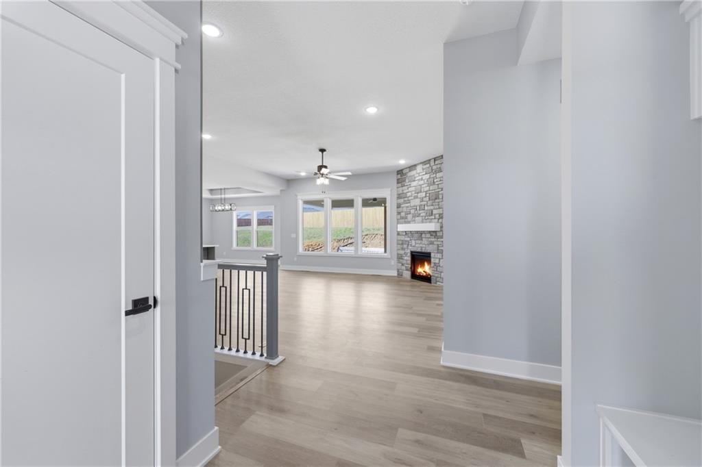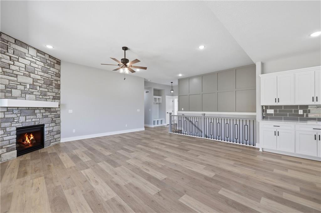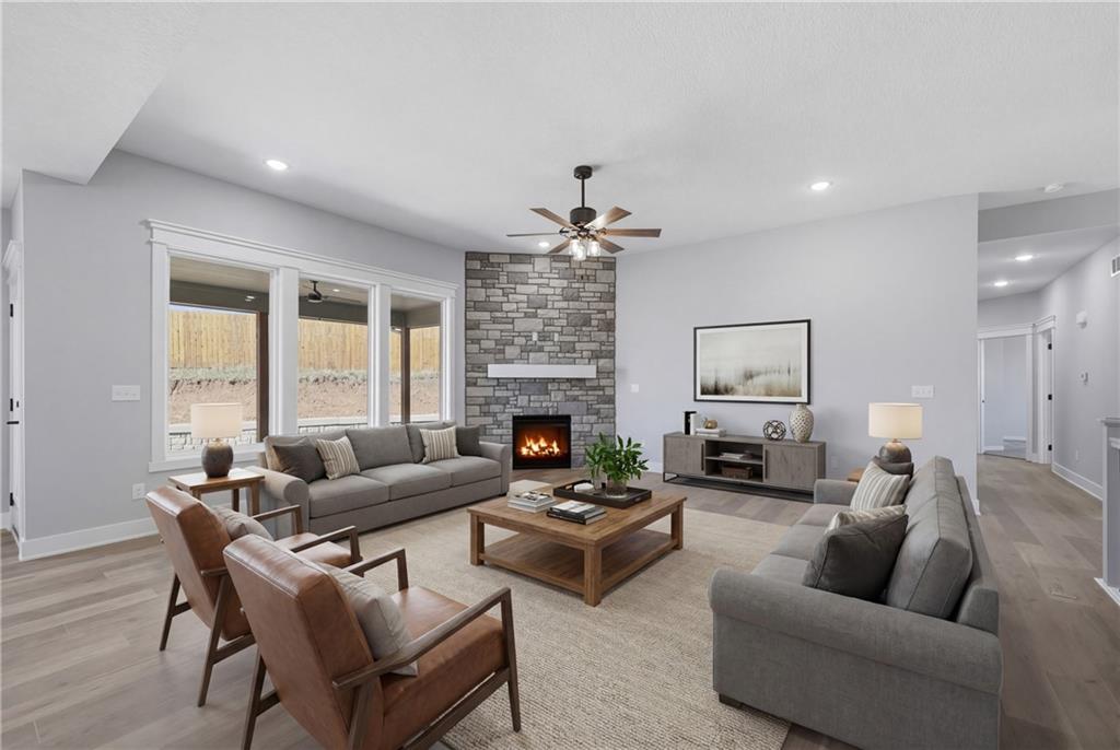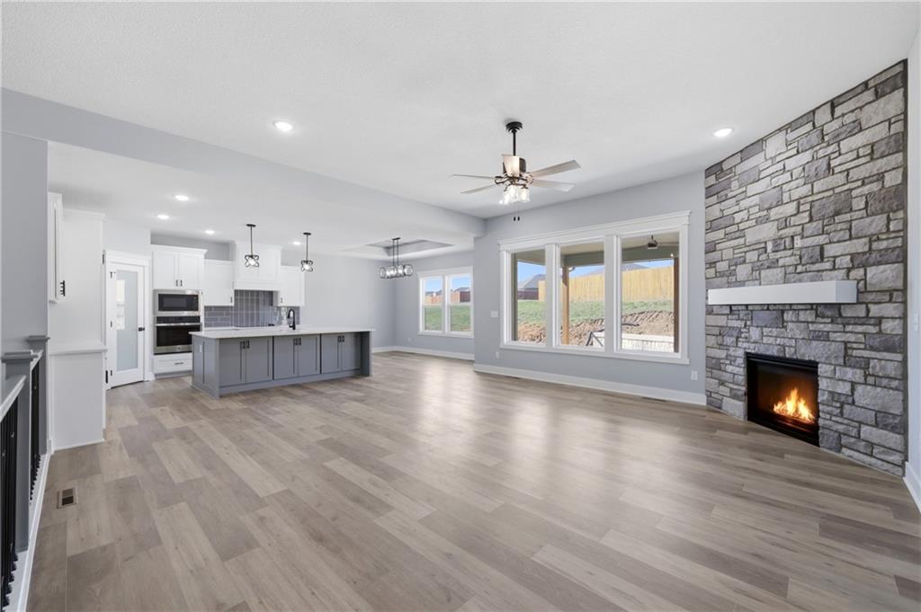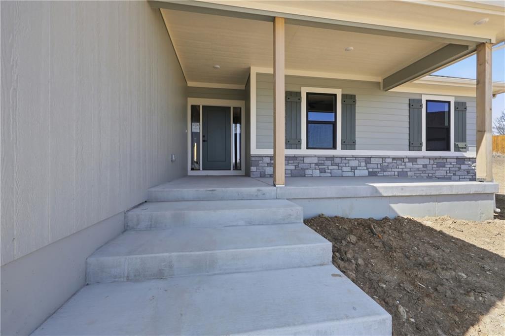 Brand new construction ranch offering 3 bedrooms and 2 bathrooms with modern design and quality craftsmanship throughout. Open-concept layout features a spacious living area highlighted by a stone fireplace and abundant natural light. The kitchen showcases white cabinetry, a large center island, ample storage, and contemporary finishes—perfect for everyday living and entertaining. Private primary suite includes a stylish tray ceiling and en-suite bath. Additional bedrooms are generously sized and versatile for guests or home office needs. Attractive curb appeal with covered front porch, attached garage, and new concrete drive. Move-in ready and thoughtfully designed for comfort and functionality.
