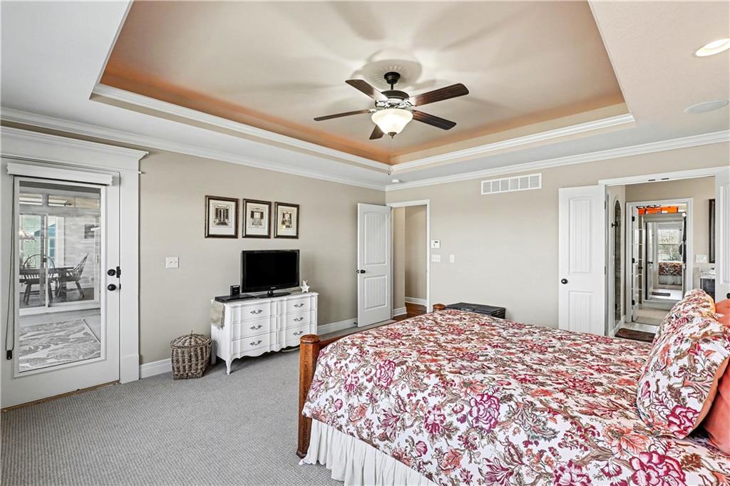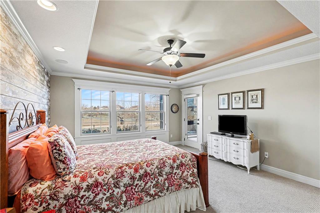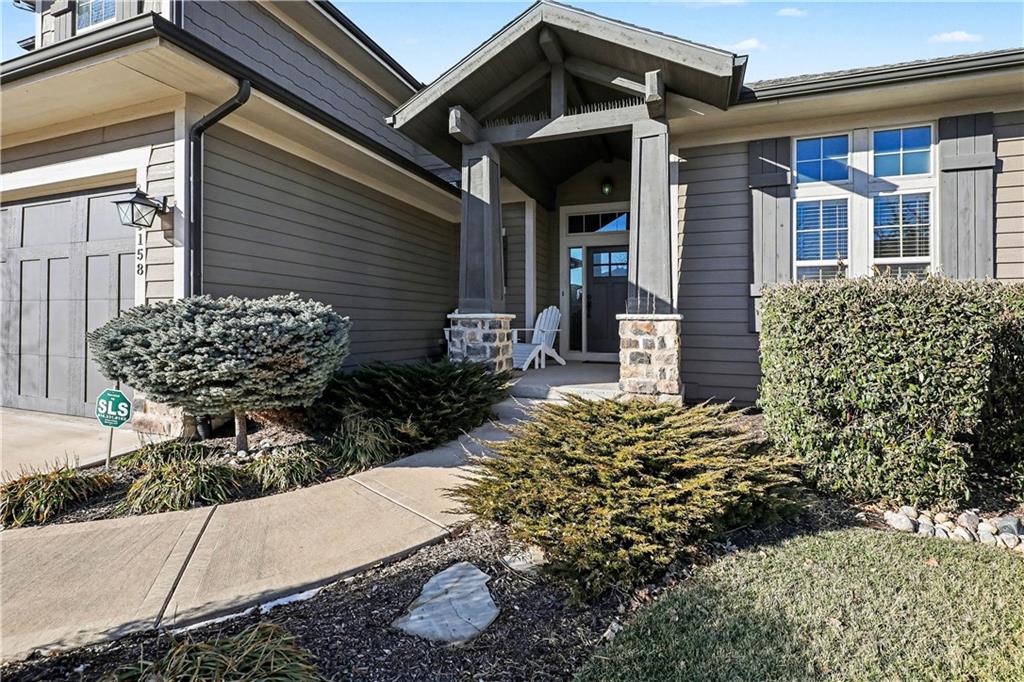 Welcome to 9158 W 178th Terrace, a beautifully maintained Emery Expanded 1.5-story home by James Engle Custom Homes, located on a quiet lot with pond views in the desirable Arbor View subdivision. This elegant home offers 6 bedrooms, 4.5 baths, and a 3-car garage, with an open, light-filled layout and upscale finishes throughout. The gourmet kitchen features granite countertops, a large island, stainless steel appliances, and a walk-in pantry. The main level includes a private primary suite with a spa-like bath and direct access to the laundry room, plus a flexible bedroom or office. Enjoy outdoor living on the covered patio with a fireplace overlooking the beautifully landscaped yard. Upstairs offers spacious bedrooms and a loft, while the finished lower level includes a recreation area, a sixth bedroom with egress, a full bath, and ample storage. Premium upgrades, including trim work, whole-home audio, and landscaping, make this move-in-ready home a must-see in prime Overland Park!