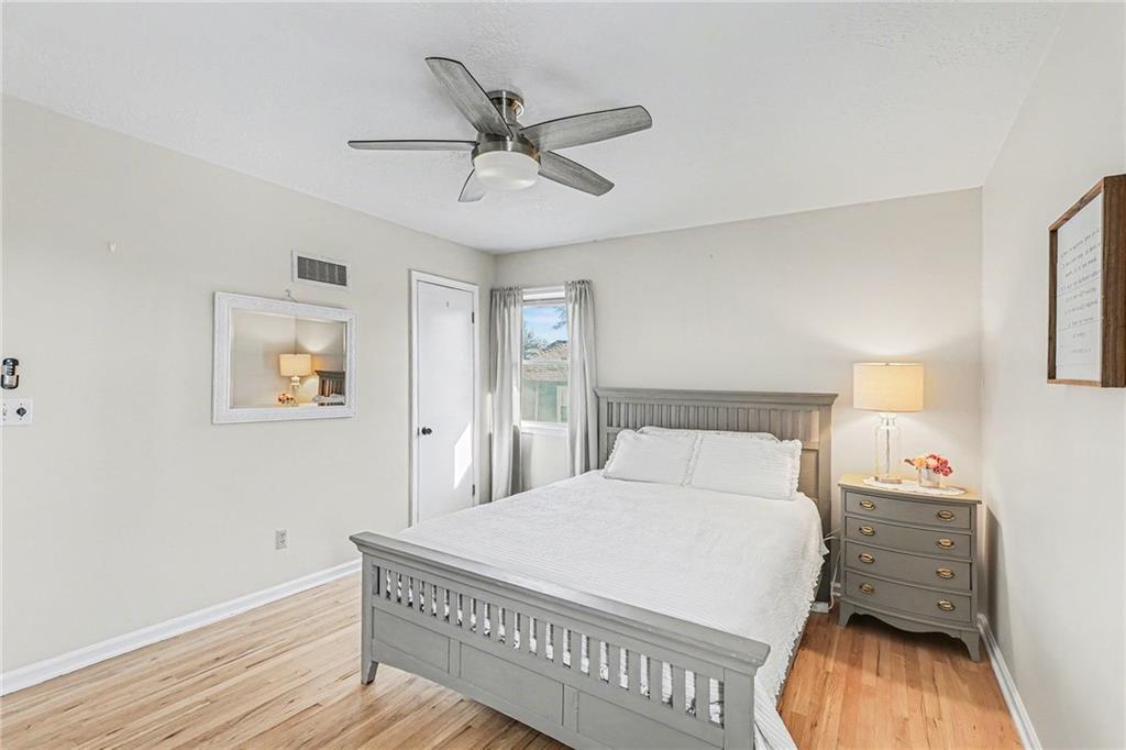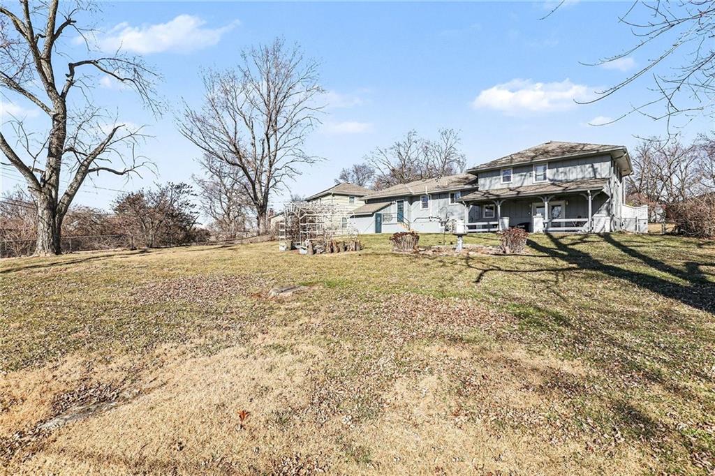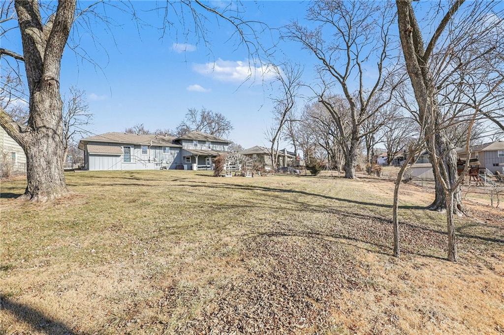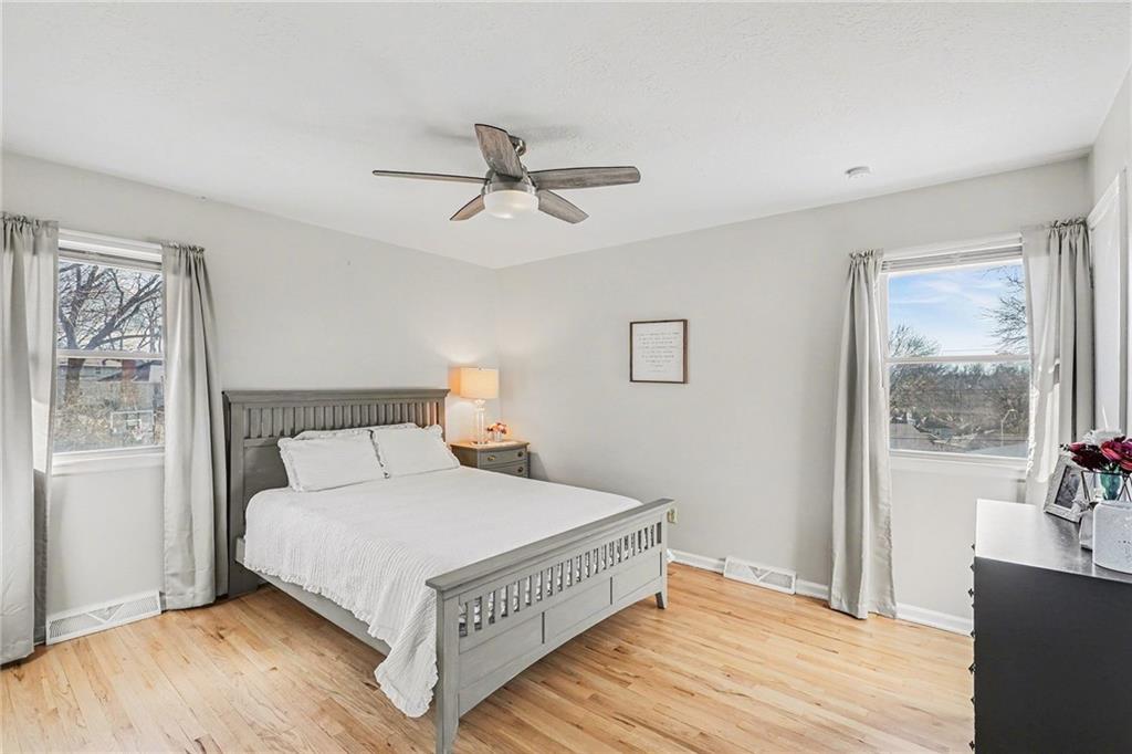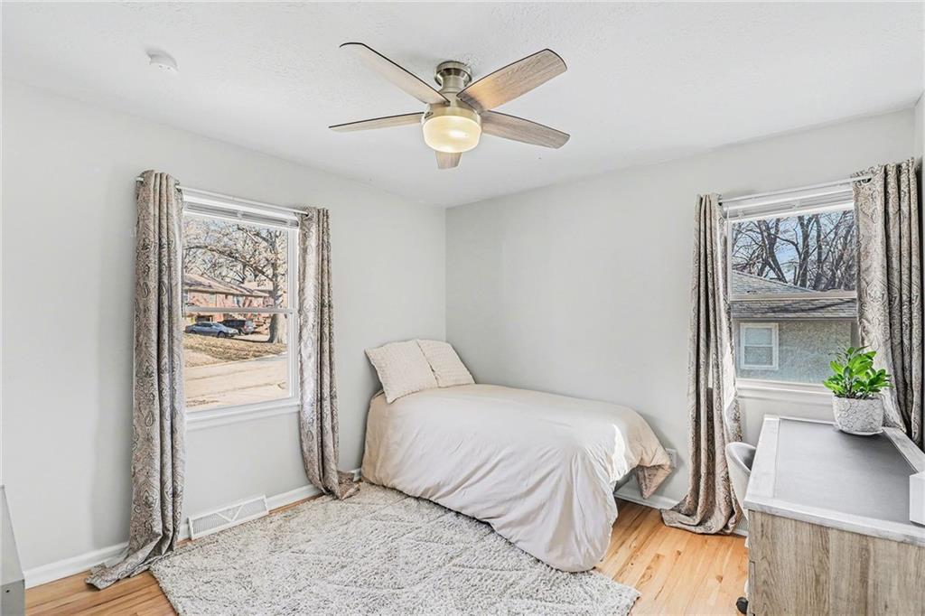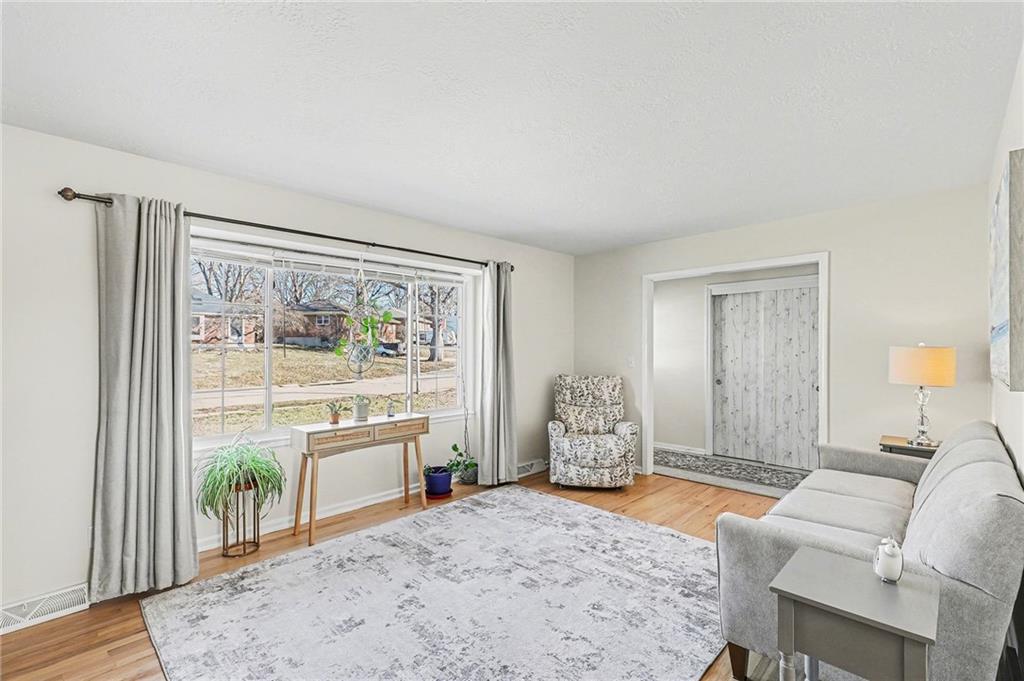 Welcome home to this well-maintained side to side split beauty tucked away in a quiet South KC neighborhood. Offering 3 bedrooms, 2 baths, and a 1-car garage with a double-wide driveway, this home perfectly blends classic charm with modern convenience. Step inside to be greeted by gorgeous refinished blonde hardwood floors and fresh paint throughout. The living room features newer windows which provide lots of natural sunlight which is carried over into the eat-in kitchen. The kitchen is ready for your culinary adventures, featuring Formica countertops and a newer stainless steel gas range and refrigerator. Upstairs, is 3 bedrooms and a Jack and Jill hall bath that has been beautifully updated featuring NEW ceiling-high tile in the shower with custom built-ins for added convenience, and NEW vinyl flooring and vanity top. The Primary Suite: Features convenient his & her closets and a Jack & Jill bath. All the bedrooms feature ceiling fans and those signature blonde hardwood floors. Next is the Versatile Lower Level: Private Living Quarters. The lower level offers incredible flexibility! With its own private entrance, this space features a full bath with a shower, a kitchenette, and a spacious bedroom with French doors leading to the covered patio. Bathed in natural sunlight and finished with NEW vinyl flooring, it is ideal for a guest suite, rental opportunity, separate living quarters, or a home office. Step outside to the Outdoor Oasis- Relax or host summer BBQs on the 1/3-acre fenced yard. Whether it's rain or shine, the covered patio is perfect for kids, pets, and entertaining. Peace of mind comes standard with a long list of NEW and NEWER updates: NEW exterior paint (2020), NEW HVAC (2020), NEW disposal (2020), NEW garage door opener (2020), NEWER energy-efficient windows for maximum natural sunlight. Leaf Guard system with a transferable warranty.