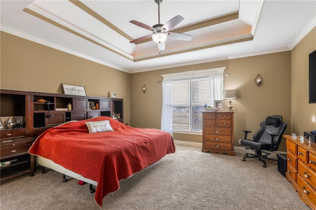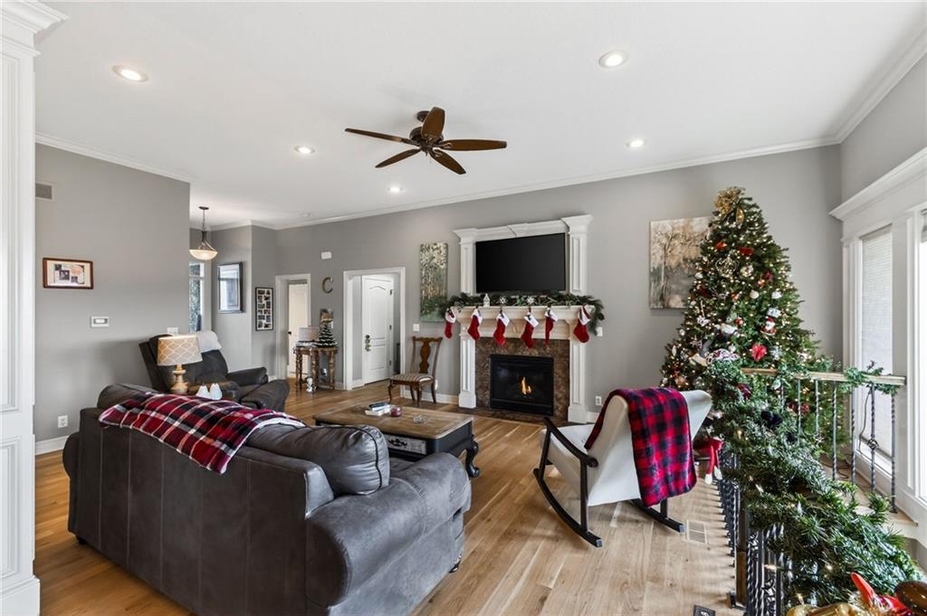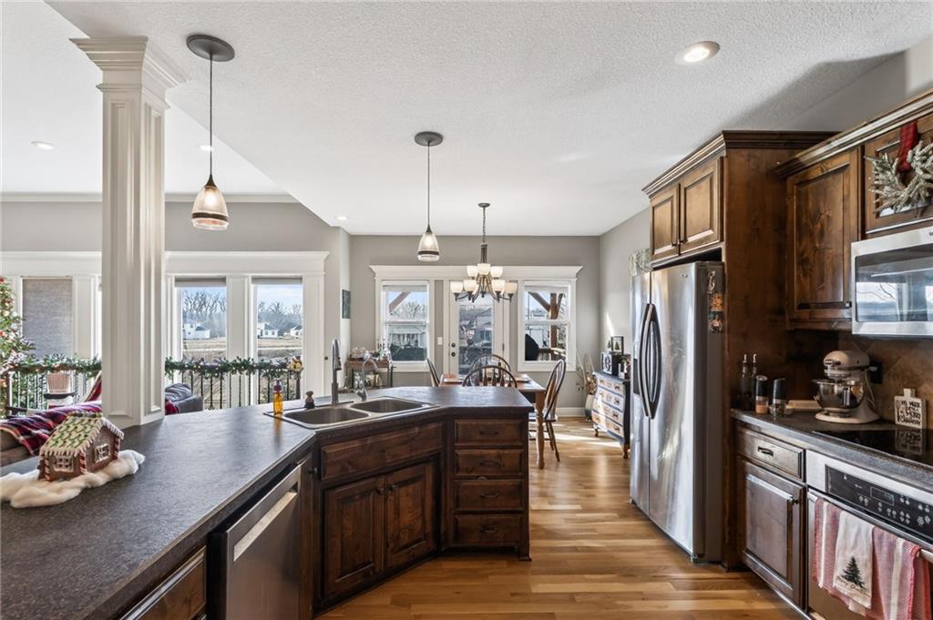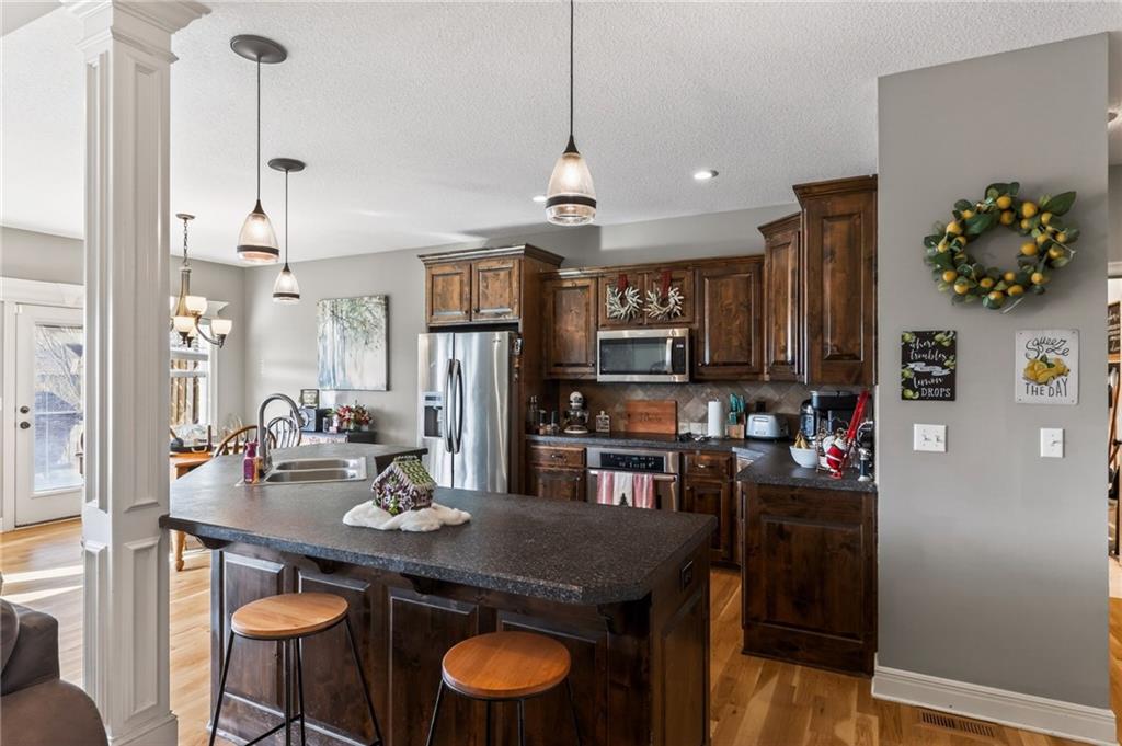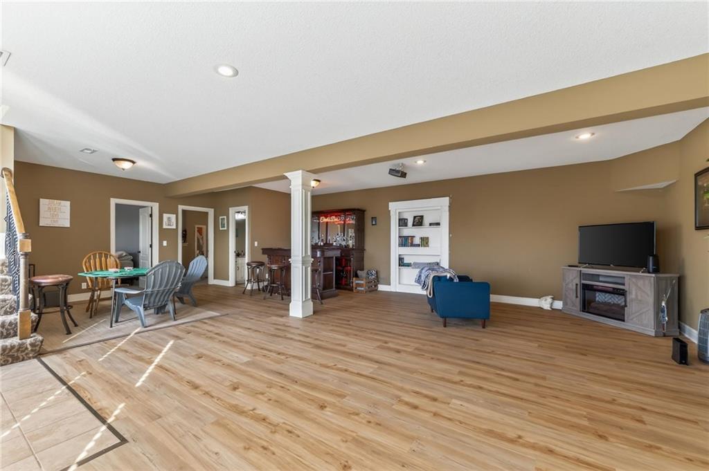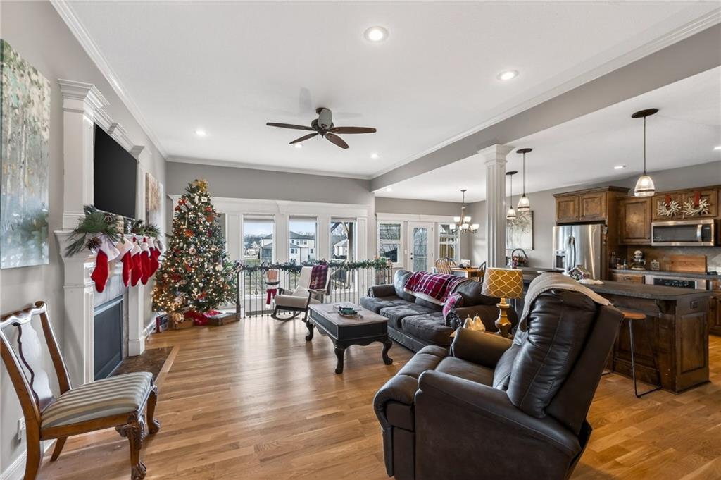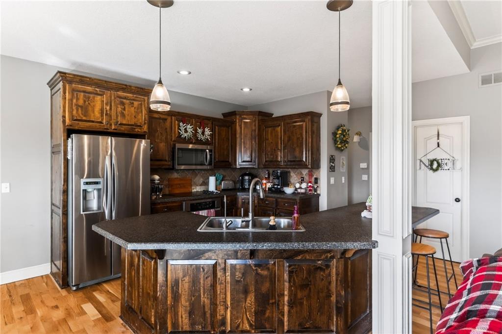 Welcome home to this beautifully maintained reverse ranch in the sought-after community of Kearney, MO, offering space, style, and functionality throughout. This 4-bedroom, 3-bath home features a 3-car attached garage and a spacious open-concept floorplan connecting the kitchen, dining area, and living room-perfect for everyday entertaining. The living room is anchored by a cozy fireplace, while the dining area walks out to a private deck, ideal for morning coffee or evening gatherings. The upstairs primary suite is generously sized with vaulted ceilings and a private bath retreat. The finished lower level expands your living space with a welcoming family room featuring a gorgeous bar, additional bedrooms, and a hidden bonus room perfect for storage, a home gym, or hobby space. The walk-out basement leads to a nicely fenced backyard complete with a paver stone patio and a built-in fire pit, creating an inviting outdoor oasis for all seasons. Located in a highly desirable neighborhood with easy access to schools, shopping, and highways - this home checks all the boxes. Come and take a look! We think you'll love it!