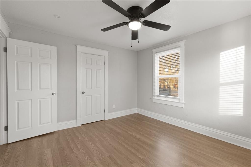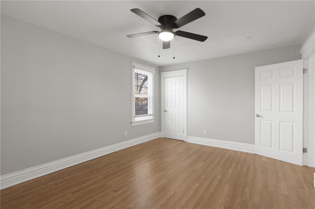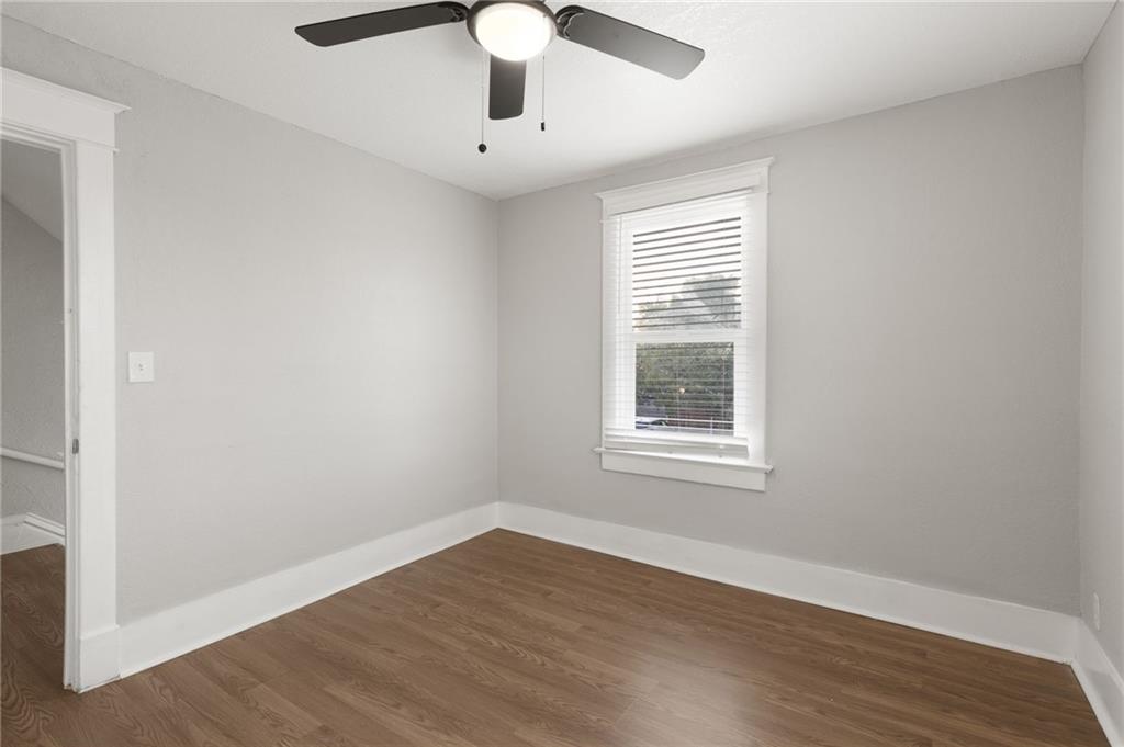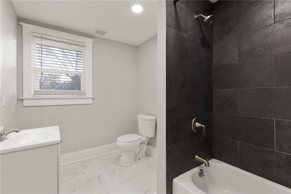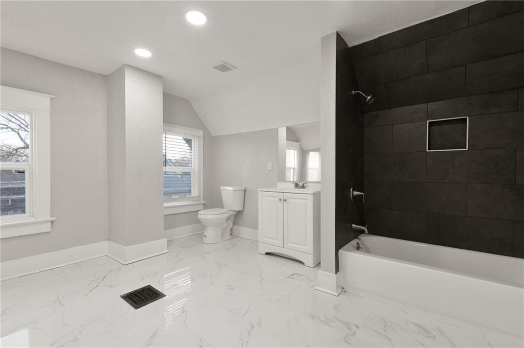 Step into this beautifully updated home where every detail has been thoughtfully refreshed. The bright, open foyer welcomes you with gleaming hardwood floors, soaring ceilings, and an elegant staircase that sets the tone for this stunning property. Natural light pours through oversized windows, highlighting the fresh neutral paint and crisp white trim throughout. The heart of the home features a completely renovated kitchen with white shaker cabinetry, sleek granite countertops, modern subway tile backsplash, and stainless steel appliances—perfect for both everyday living and entertaining. Retreat to the spa-like bathroom showcasing designer marble-look tile flooring, modern fixtures, and a dramatic black accent wall in the shower/tub area that creates a striking contemporary feel. The spacious backyard offers mature trees and endless potential for outdoor enjoyment. This home combines classic architectural charm with modern updates—truly a rare find that's move-in ready and waiting for you!