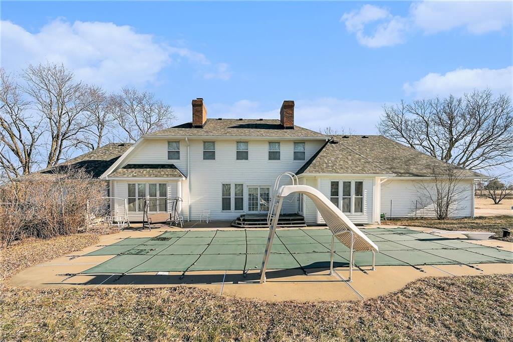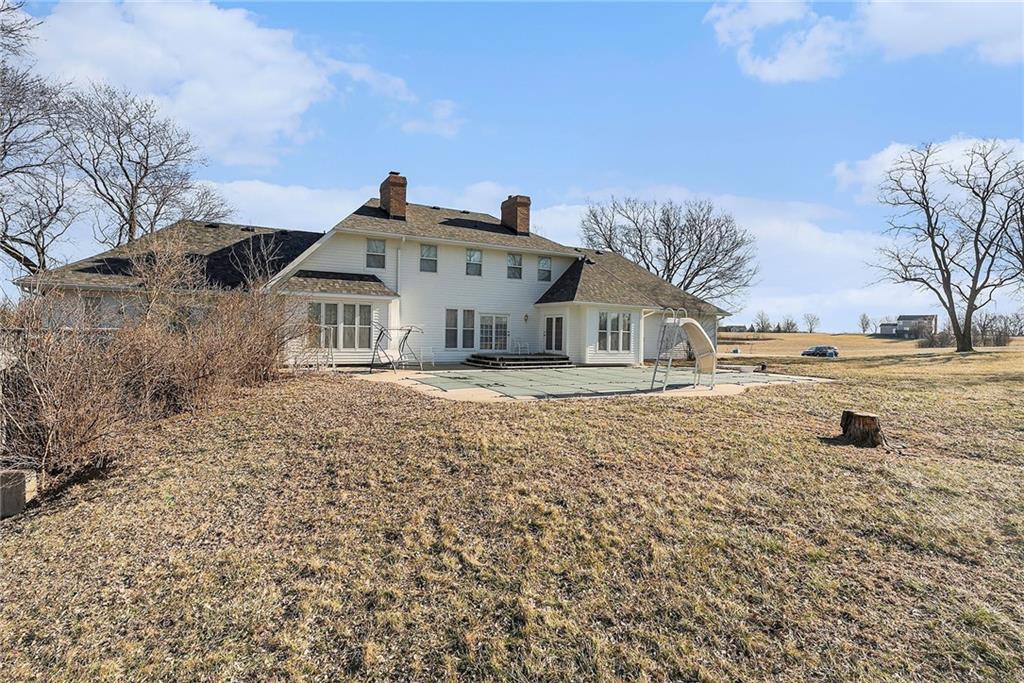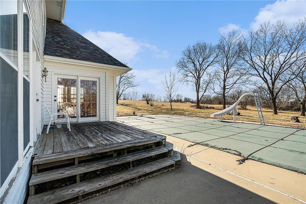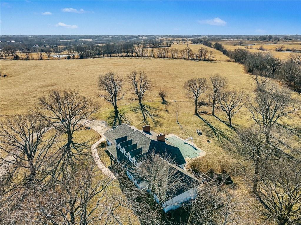 Situated on 10± acres in the Smithville School District, this expansive 1.5-story estate offers 3,900+/- square feet of living space, timeless character, and endless potential. The property features a unique barn highlighted by burned wood joists reclaimed from the historic 1917 Kansas City Stockyard Fires, adding a rare touch of history and charm. A grand double-door entry opens to a stunning two-story foyer with a curved staircase leading to the upper level. The formal dining room off the entry is generously sized, perfect for hosting large gatherings. The kitchen offers abundant cabinet space, a walk-in pantry conveniently located near the laundry room, an eat-in breakfast nook with peaceful backyard views, and a wood-burning fireplace. Multiple living areas provide flexibility, including an informal family room with fireplace for relaxed evenings and a formal living room ideal for entertaining. A main-level study with its own fireplace creates a comfortable work-from-home space. The spacious primary suite is also located on the main level and features a walk-in closet and private ensuite with dual vanities, whirlpool tub, and separate shower. The laundry room sits just off the garage and kitchen, and two half baths complete the main floor. Upstairs, a balcony overlooks the foyer and leads to two oversized secondary bedrooms, each measuring approximately 12x27, offering multiple closets and sharing a Hollywood-style bathroom. The unfinished lower level provides a blank canvas for future expansion and is ideal for a family room with a wood-burning stove as the focal point. Outdoors, enjoy the in-ground heated pool with diving board and slide, spend time in the barn, or explore the privacy and natural beauty of the 10± acres. This property offers solid bones, generous space, and a prime setting, with cosmetic updates needed to bring it to today’s market and make it your own.
