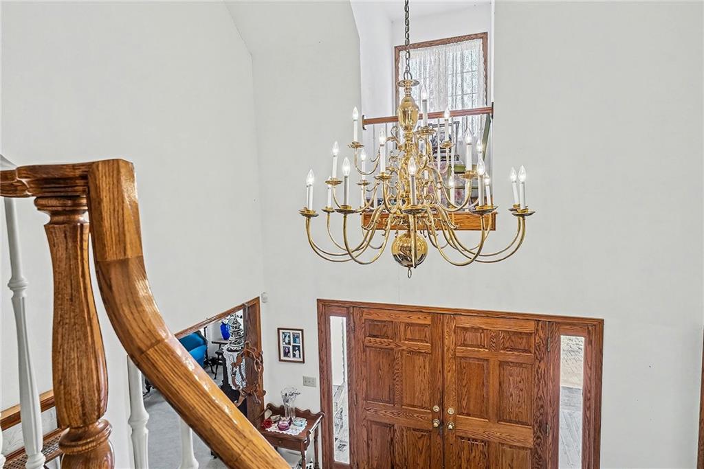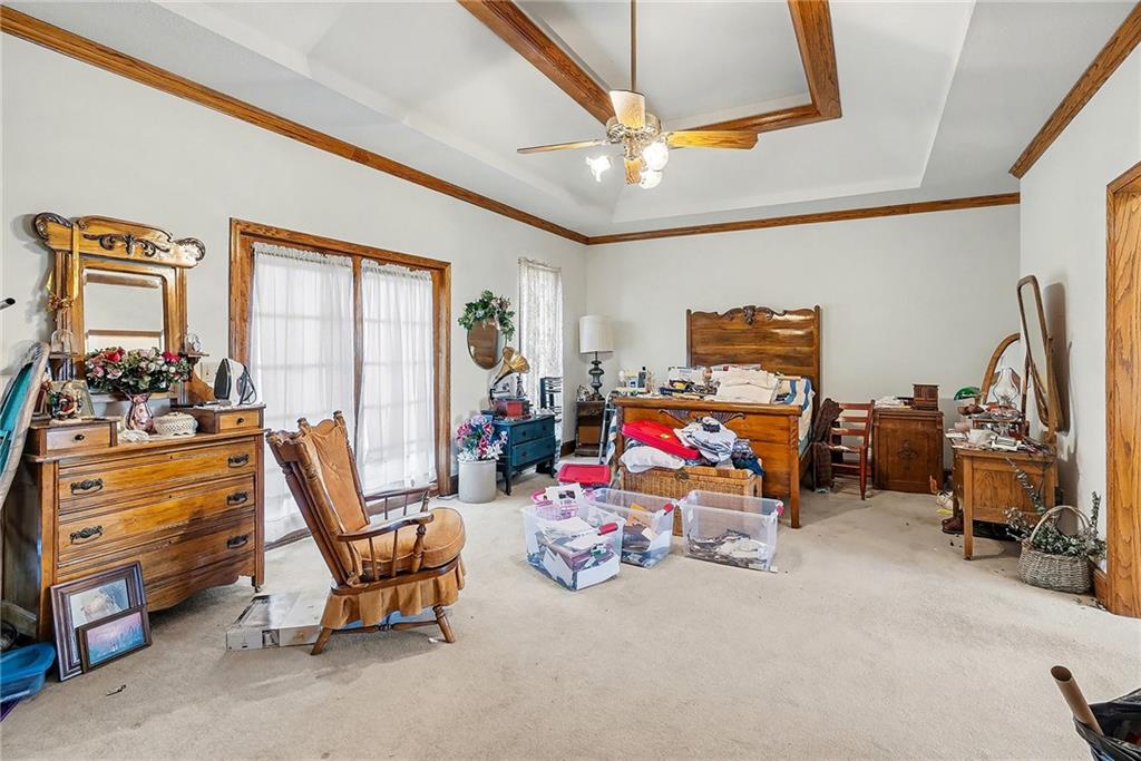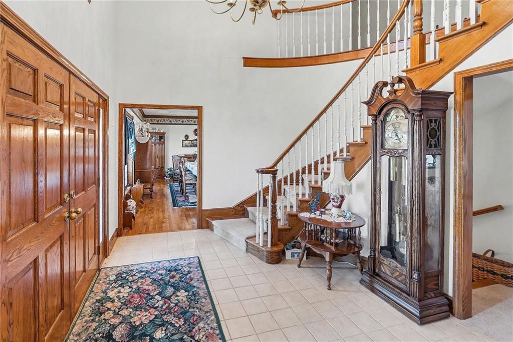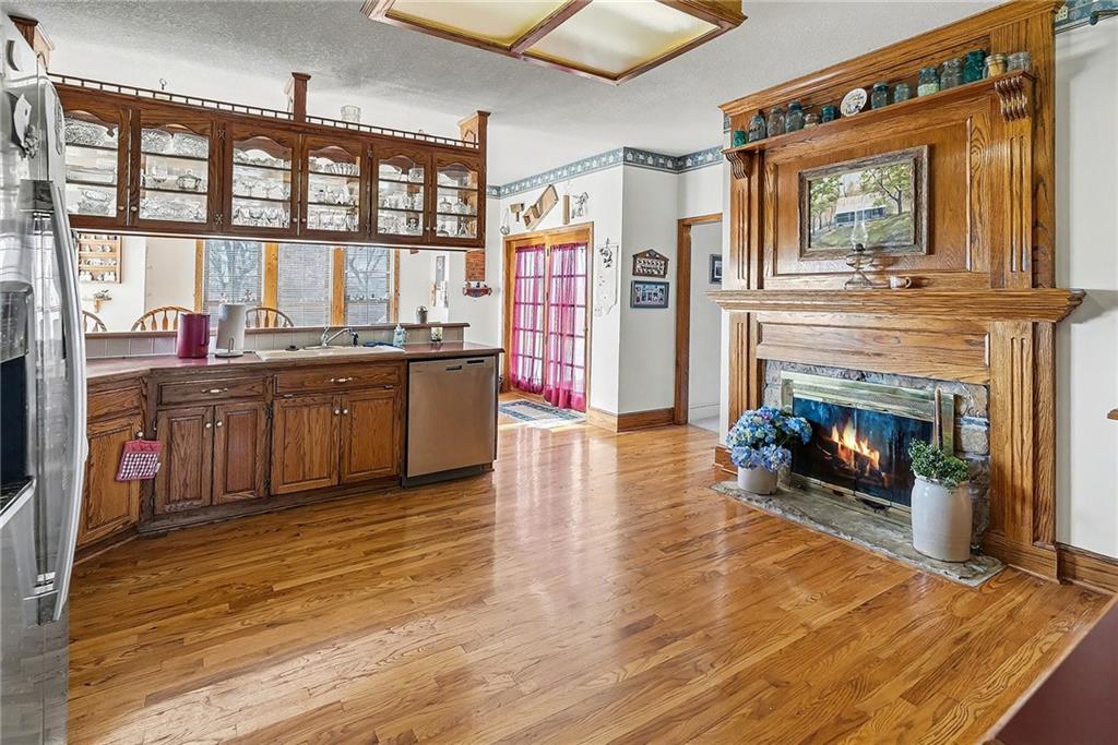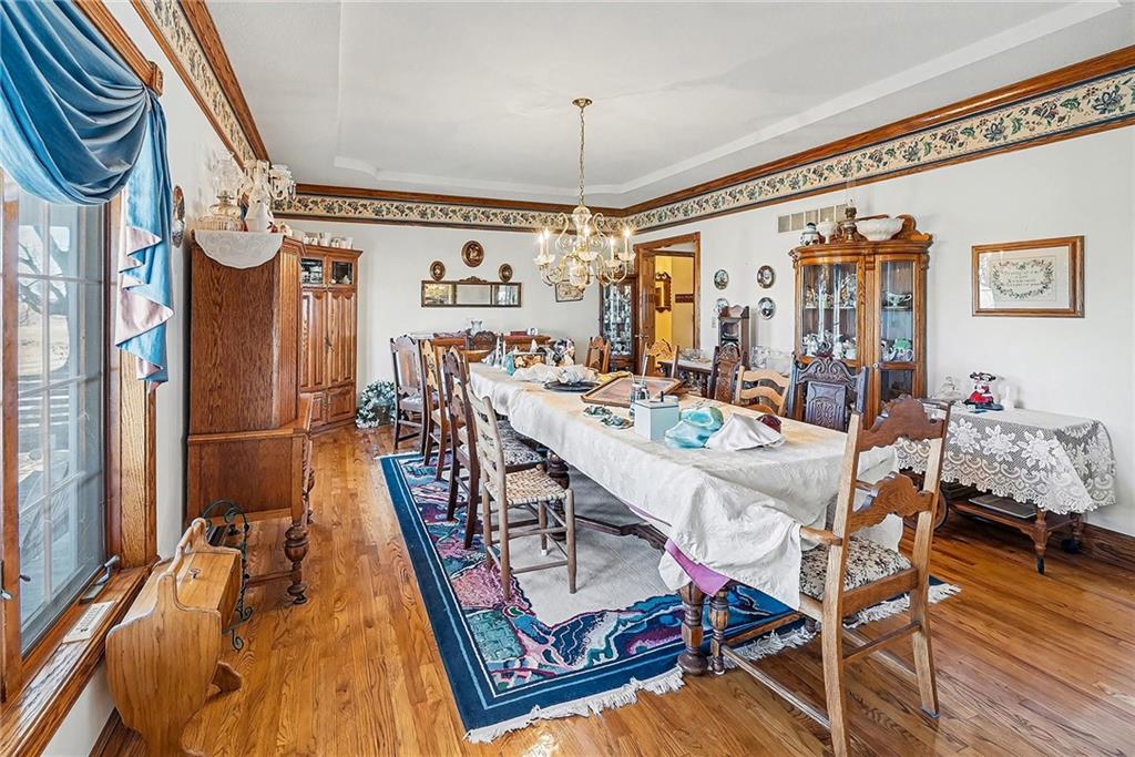 Situated on 10± acres in the Smithville School District, this expansive 1.5-story estate offers 3,900+/- square feet of living space, timeless character, and endless potential. The property features a unique barn highlighted by burned wood joists reclaimed from the historic 1917 Kansas City Stockyard Fires, adding a rare touch of history and charm. A grand double-door entry opens to a stunning two-story foyer with a curved staircase leading to the upper level. The formal dining room off the entry is generously sized, perfect for hosting large gatherings. The kitchen offers abundant cabinet space, a walk-in pantry conveniently located near the laundry room, an eat-in breakfast nook with peaceful backyard views, and a wood-burning fireplace. Multiple living areas provide flexibility, including an informal family room with fireplace for relaxed evenings and a formal living room ideal for entertaining. A main-level study with its own fireplace creates a comfortable work-from-home space. The spacious primary suite is also located on the main level and features a walk-in closet and private ensuite with dual vanities, whirlpool tub, and separate shower. The laundry room sits just off the garage and kitchen, and two half baths complete the main floor. Upstairs, a balcony overlooks the foyer and leads to two oversized secondary bedrooms, each measuring approximately 12x27, offering multiple closets and sharing a Hollywood-style bathroom. The unfinished lower level provides a blank canvas for future expansion and is ideal for a family room with a wood-burning stove as the focal point. Outdoors, enjoy the in-ground heated pool with diving board and slide, spend time in the barn, or explore the privacy and natural beauty of the 10± acres. This property offers solid bones, generous space, and a prime setting, with cosmetic updates needed to bring it to today’s market and make it your own.