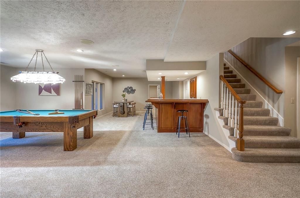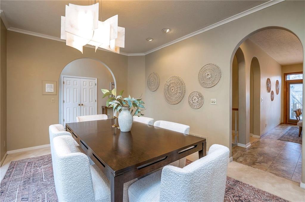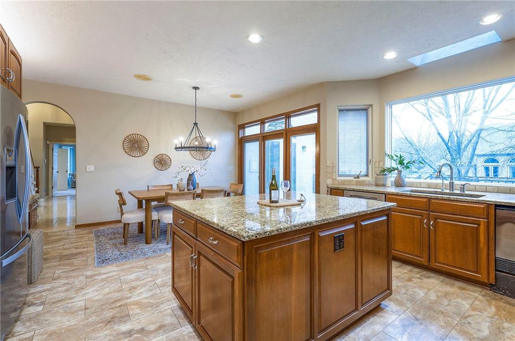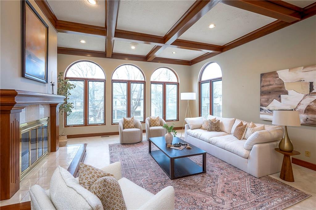 Welcome to this expansive and well-built 1.5-story home offering 4,224 square feet on the main & second floors, plus a large finished walkout basement with 1,500 finished square feet. The home sits on a beautifully landscaped lot in a prime Overland Park location. You’re greeted through a leaded glass front door from a charming courtyard into an impressive two-story entry, where a nearby three-story fireplace anchors the home & immediately showcases its grand scale. The main level features a spacious living room with wood beams, a fireplace & abundant natural light. A large formal dining room easily accommodates entertaining on a grand scale. The kitchen boasts several high-end Wolf appliances & a four-burner gas stove with a griddle. Just off the kitchen is an exceptionally large laundry room. The main-floor primary suite features a vaulted ceiling, generous closet space, and an en-suite bath with separate tub and shower and extensive storage. The second floor offers three very large bedrooms, excellent closets, and two and one-half bathrooms. The half bathroom could potentially become a second laundry room. There is also a bonus room featuring a wet bar, a fireplace and a large vaulted ceiling. It has the potential to serve as a second primary suite. The finished walkout basement is designed for entertaining, with a large bar, multiple gathering areas, wine storage, an additional bedroom and full bath, and access to a spacious patio. There is also significant unfinished space. Additional highlights include a huge deck overlooking the private lot, mature landscaping, a deep side-entry garage well-suited for large SUVs, trucks, and storage, zoned HVAC, partial HVAC replacement, and a major investment in several newer windows. This home offers a rare opportunity—exceptional bones, generous proportions, and a premier location with excellent schools, quick highway access, and nearby shopping and dining—ready for the next owner to bring their design vision to life.