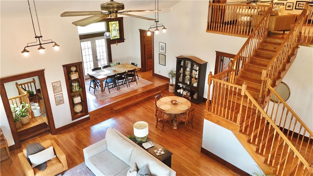 Step into history with this beautifully remodeled 1920s church, now transformed into a unique and spacious home filled with character and charm. From the moment you enter the welcoming foyer, you will be captivated by the architectural details and open concept design that seamlessly blends old world craftsmanship with modern living. The main floor features soaring ceilings and a stunning open living area that includes a kitchen, dining area and multiple cozy sitting and gathering spaces perfect for entertaining or simply relaxing in style. A spacious main floor master suite offers privacy and convenience with an en suite bath, while a main level laundry and additional bathroom add everyday functionality. Upstairs a loft area provides additional space for a home office, reading nook or creative studio. The lower level is ideal for multi-generational living or guest quarters, featuring a second full kitchen, three generously sized bedrooms, a full bathroom and a large living or game room. Whether you are looking for a distinctive residence or a home with flexible layout options his converted church offers endless possibilities and timeless appeal. A 3 car detached garage offers space for car - truck - suvs and workshop with 3 overhead doors and walk in door. Lots of character in the one of a kind home come take a look!!